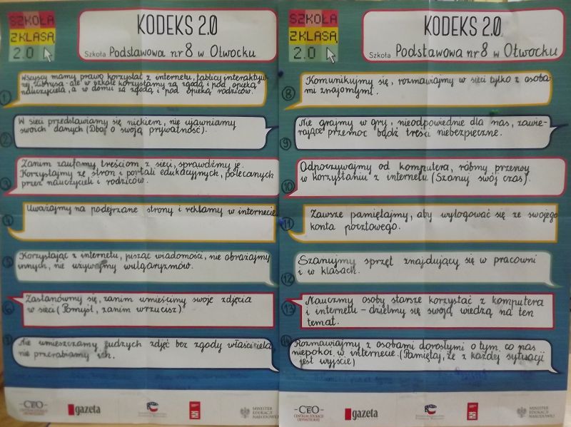 Wspólnie stworzyliśmy Kodeks Szkoły z Klasą 2.0, który prezentujemy poniżej. Jego zasady obowiązują nas wszystkich i są jednocześnie wskazówką, jak bezpiecznie i we właściwy sposób korzystać z nowoczesnych urządzeń.