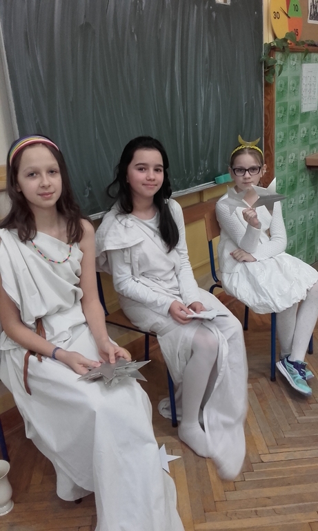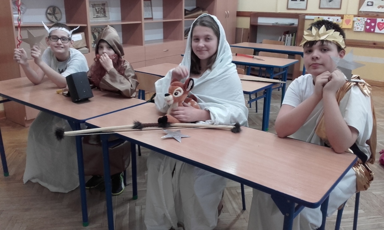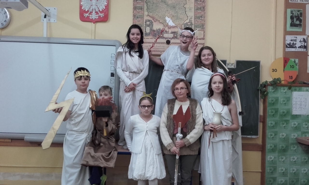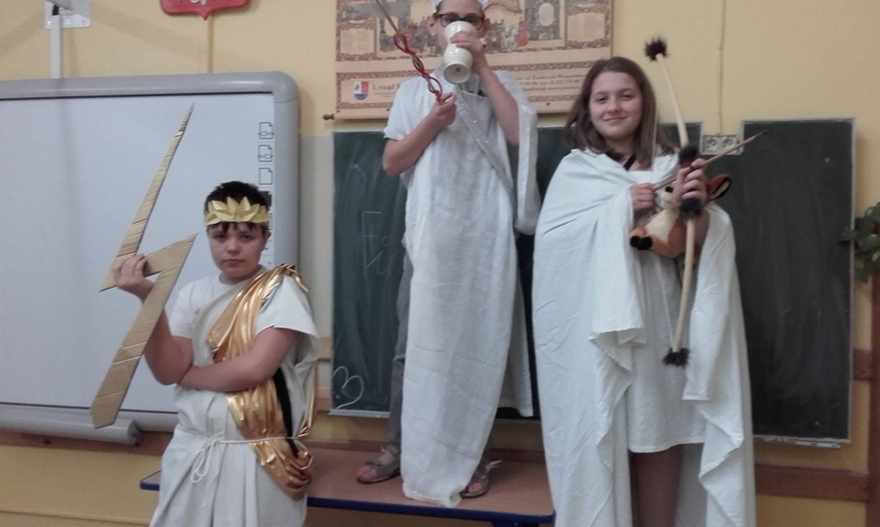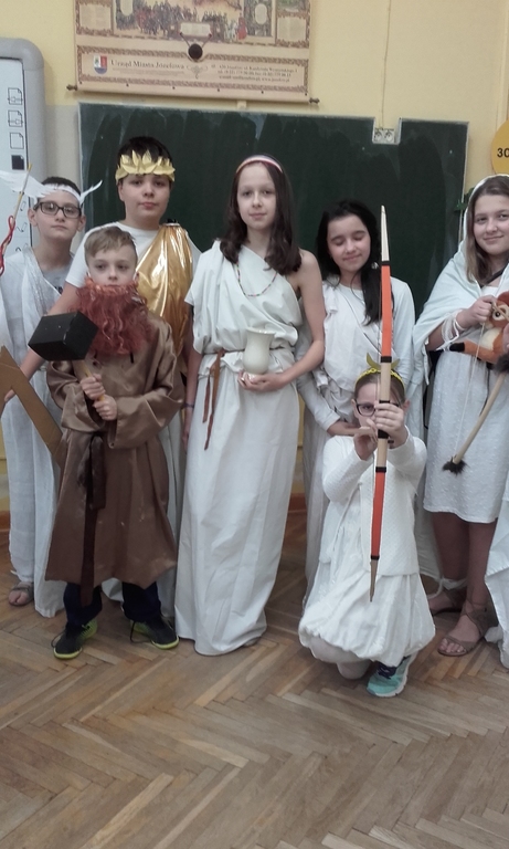 We wtorek, 24 stycznia , pojawili się na szkolnym korytarzu niezwykli goście – uczniowie przebrani za postacie mitologicznych bogów. W ten sposób klasa V przygotowała się do konkursu mitologicznego zorganizowanego przez nauczyciela języka polskiego. Pierwszy etap polegał na napisaniu testu ze znajomości mitologii, w wyniku którego wyłoniono piątkę finalistów. Stanęli oni do rywalizacji o tytuł „Mistrza Mitologii.”