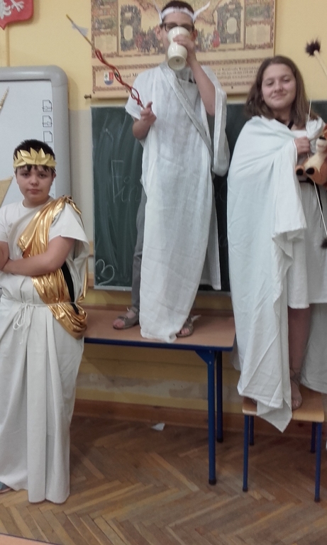 W prowadzeniu konkursu pomagały nauczycielowi piękne nimfy i boginki w postaci 3 uczennic , które rozdawały punkty otrzymane prze finalistów. Finał miał 3 etapy i ostatecznie pierwsze miejsce przypadło Aleksandrowi Knypkowi w przebraniu Hermesa, drugie miejsce zajęła bogini łowów Artemida czyli Weronika Smolak, a trzecim był gromowładny Zeus - Karol Bąk. Myślę, że dla wszystkich była to dobra zabawa.