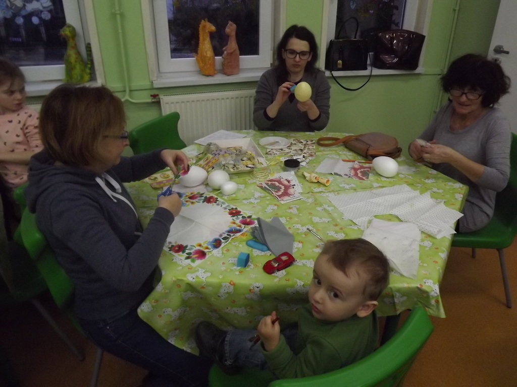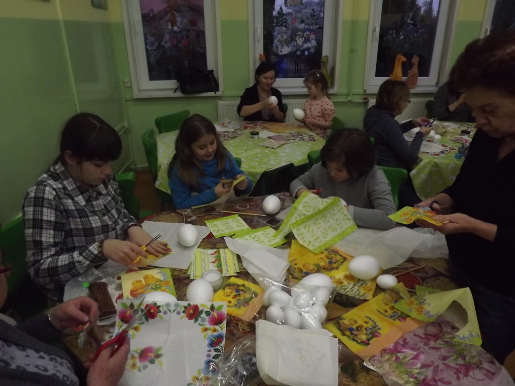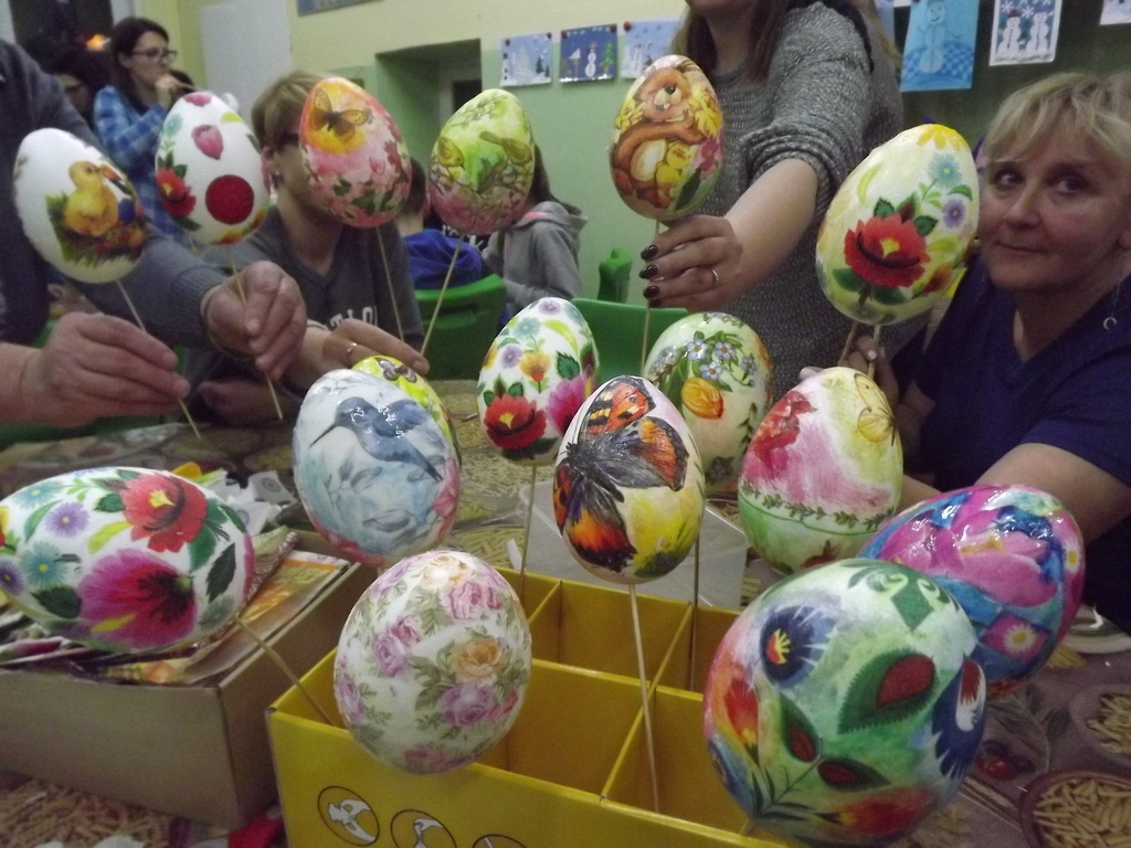Wielkanocne warsztaty z decupagu na szkolnej świetlicy z udziałem uczniów naszej szkoły, ich rodziców i uczestniczek projektu "Kobiety z pasją" z Programu Narodowego Centrum Kultury prowadzone przez P. Małgorzatę Szczepanik.