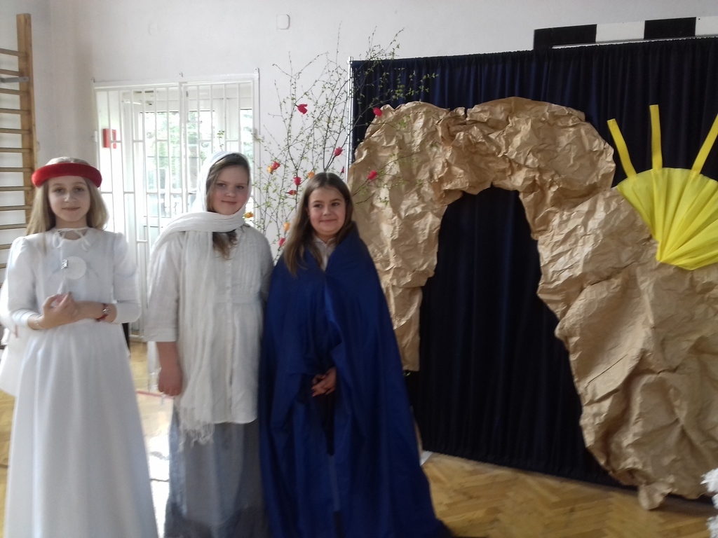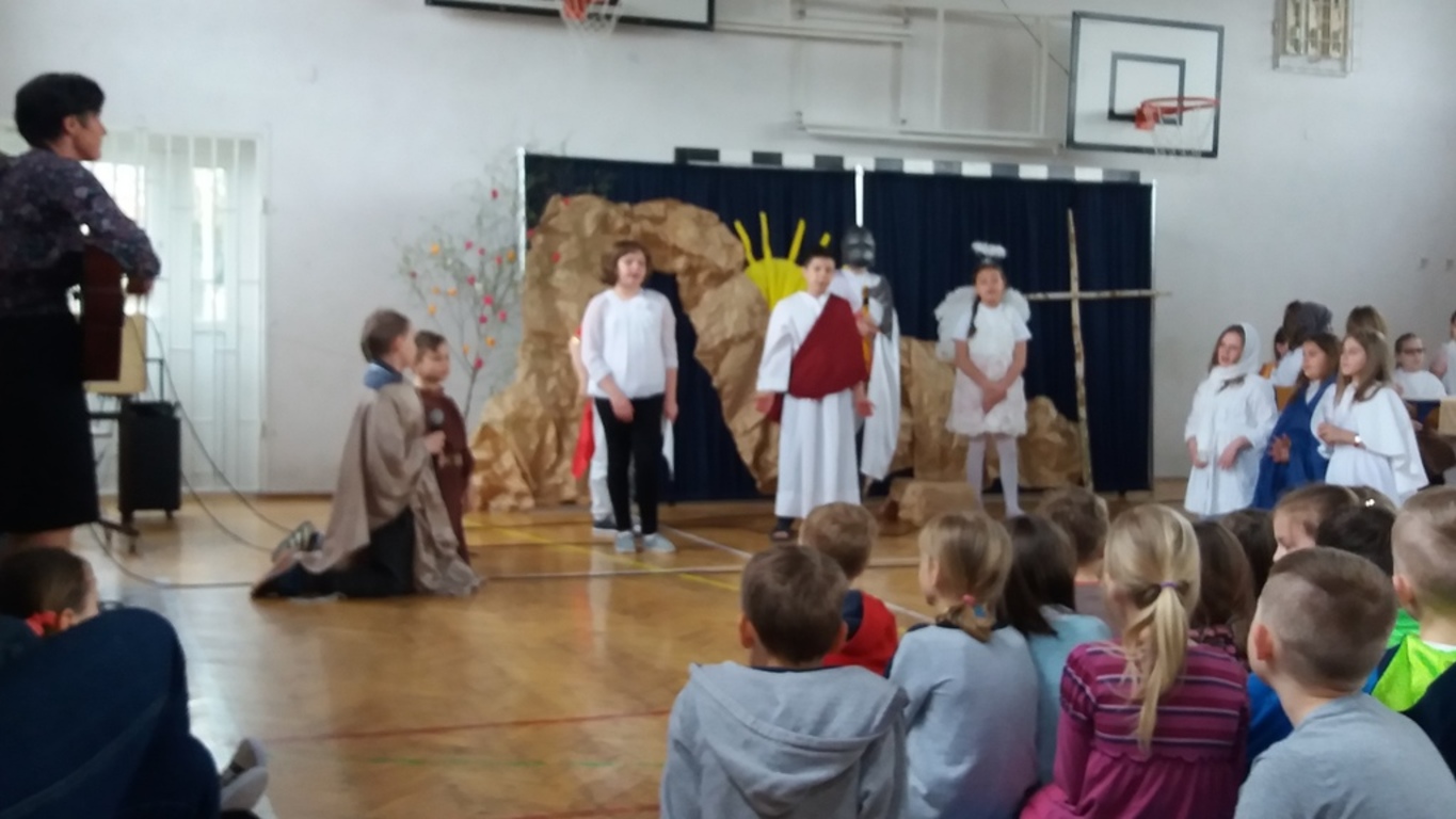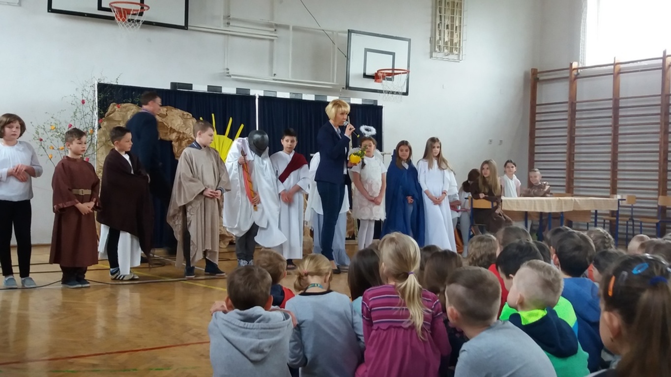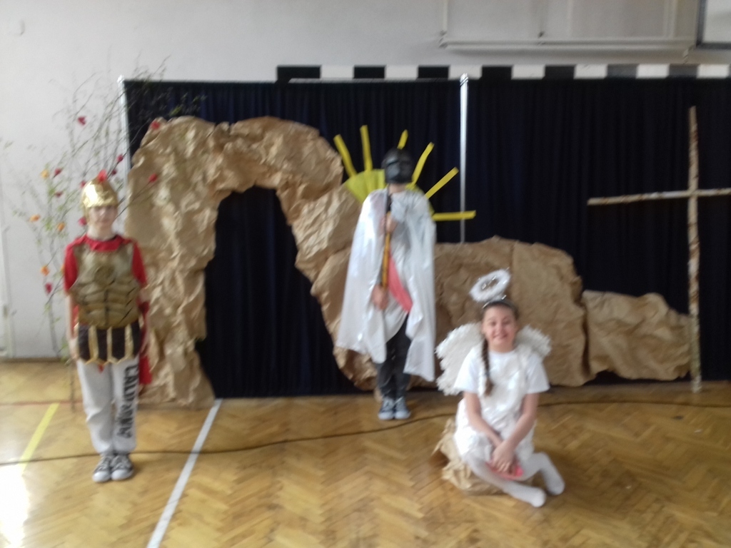 Dnia 12.04. 2017 ostatniego dnia przed przerwą wiosenną odbył się Apel Wielkanocny przygotowany przez uczniów kl. III b i kl. V pod kierunkiem Pani katechetki Agnieszki Świstak i Pani Basi Krzyszczak-Szuby. Pomysł i scenariusz autorstwa P. Agnieszki. Uczniowie w dwóch scenach wprowadzili nas w atmosferę z przed dwóch tysięcy lat zaskoczenia i radości ze zmartwychwstania Pana Jezusa. Tym samym przekazali Słowo Boże umacniając nas w wierze i prawdzie o cudzie nad cudami. O słuszności i radości jaka płynie z pustego grobu żyjącego Pana i nadziei życia wiecznego. Na zakończenie przekazano świąteczne życzenia Pani Dyrektor, nauczycielom, pracownikom administracyjnym, rodzicom i uczniom, aby zwycięskie Alleluja rozbrzmiewało i napełniało wszystkie serca. Zmartwychwstały Chrystus , który jest bohaterem tych świąt ma prowadzić do zgody, miłości, radości i pokoju, wspaniałości i hojności. Zakończono radosną piosenką i okrzykiem: Chrystus zmartwychwstał - prawdziwie zmartwychwstał.