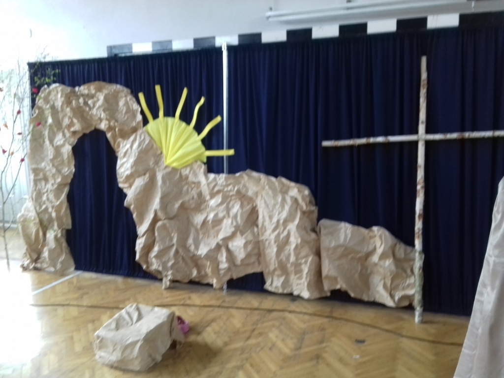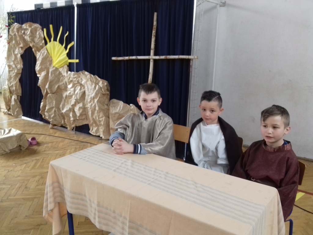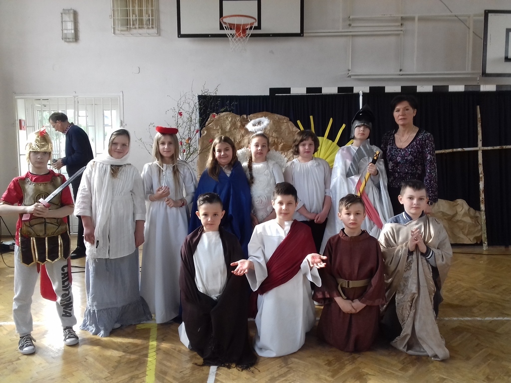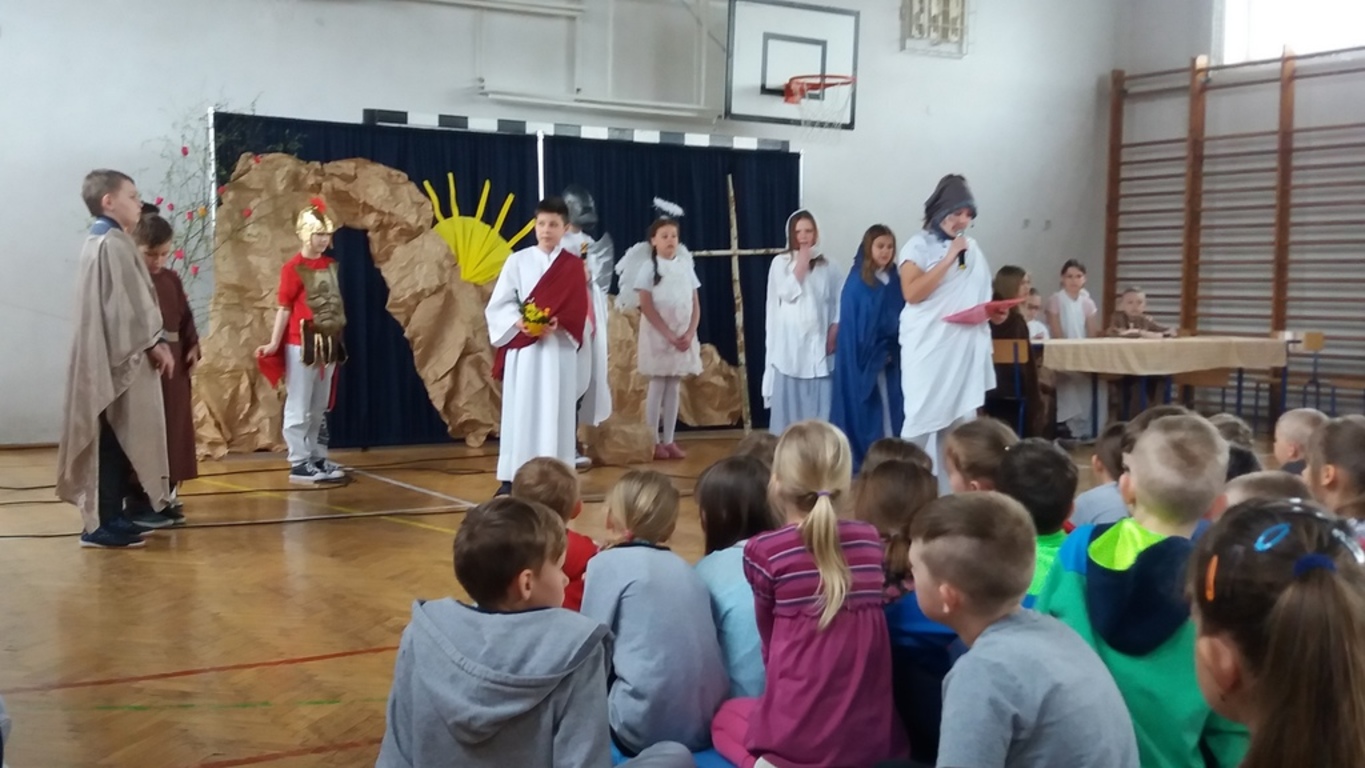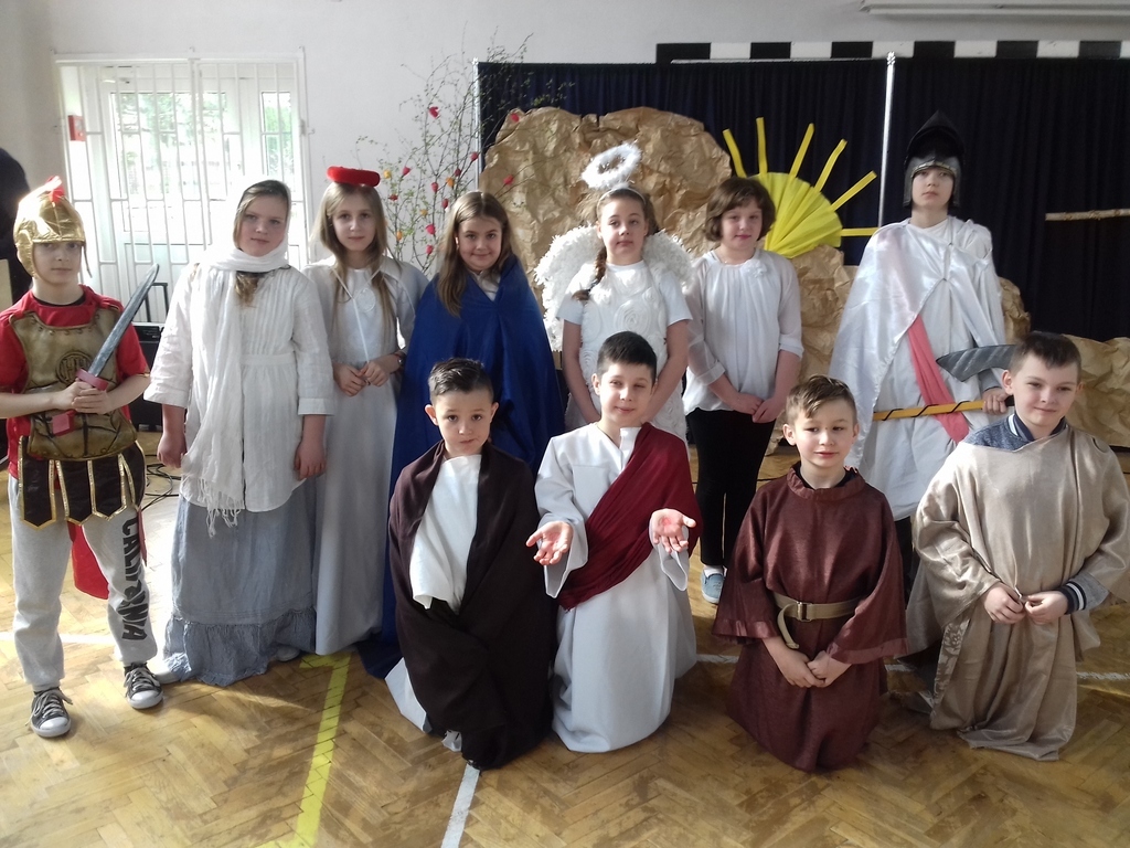 Dnia 12.04. 2017 ostatniego dnia przed przerwą wiosenną odbył się Apel Wielkanocny przygotowany przez uczniów kl. III b i kl. V pod kierunkiem Pani katechetki Agnieszki Świstak i Pani Basi Krzyszczak-Szuby. Pomysł i scenariusz autorstwa P. Agnieszki. Uczniowie w dwóch scenach wprowadzili nas w atmosferę z przed dwóch tysięcy lat zaskoczenia i radości ze zmartwychwstania Pana Jezusa. Tym samym przekazali Słowo Boże umacniając nas w wierze i prawdzie o cudzie nad cudami. O słuszności i radości jaka płynie z pustego grobu żyjącego Pana i nadziei życia wiecznego. Na zakończenie przekazano świąteczne życzenia Pani Dyrektor, nauczycielom, pracownikom administracyjnym, rodzicom i uczniom, aby zwycięskie Alleluja rozbrzmiewało i napełniało wszystkie serca. Zmartwychwstały Chrystus , który jest bohaterem tych świąt ma prowadzić do zgody, miłości, radości i pokoju, wspaniałości i hojności. Zakończono radosną piosenką i okrzykiem: Chrystus zmartwychwstał - prawdziwie zmartwychwstał.