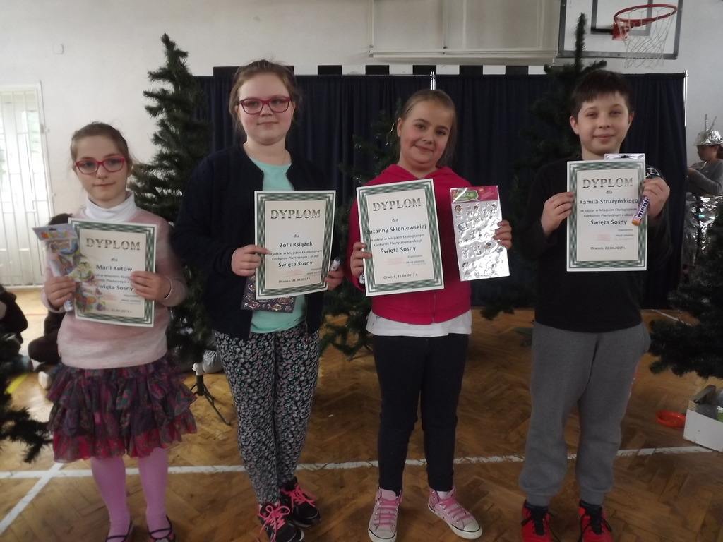 Z okazji Święta Sosny wzięliśmy udział w Miejskim Konkursie Plastycznym na plakat ekologiczny. Nagrody na etapie szkolnym otrzymali uczniowie z koła plastycznego kl. III: Zuzia Skibniewska, Zosia Książek, Marysia Kotow, Kamil Strużyński.