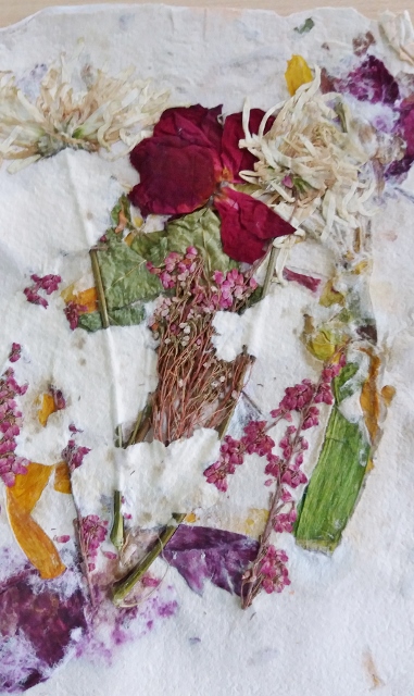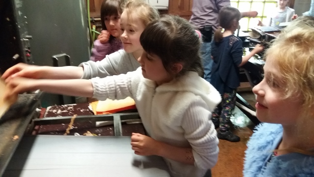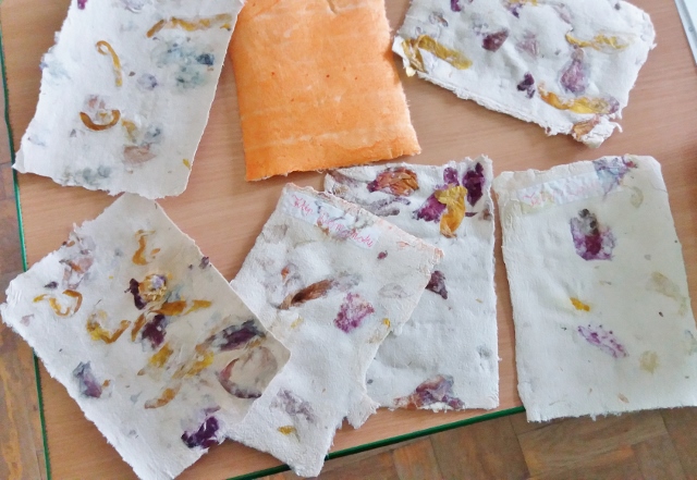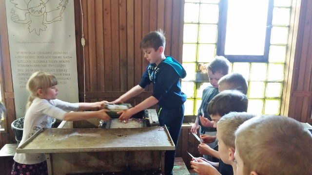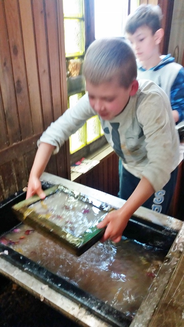 Po części teoretycznej nadszedł czas na zajęcia praktyczne - najciekawszą część wycieczki czyli własnoręczne czerpanie papieru. W trakcie zajęć dowiedzieliśmy się, co oznaczają takie pojęcia jak: celuloza, makulatura, sito, masa papiernicza, filigran, znak wodny oraz skąd pozyskujemy w Polsce oba surowce do produkcji papieru - celulozę i makulaturę. Podczas zajęć każdy z uczestników czerpał po dwa arkusze papieru: jeden z zatopionymi płatkami kwiatów, drugi ze znakiem wodnym.