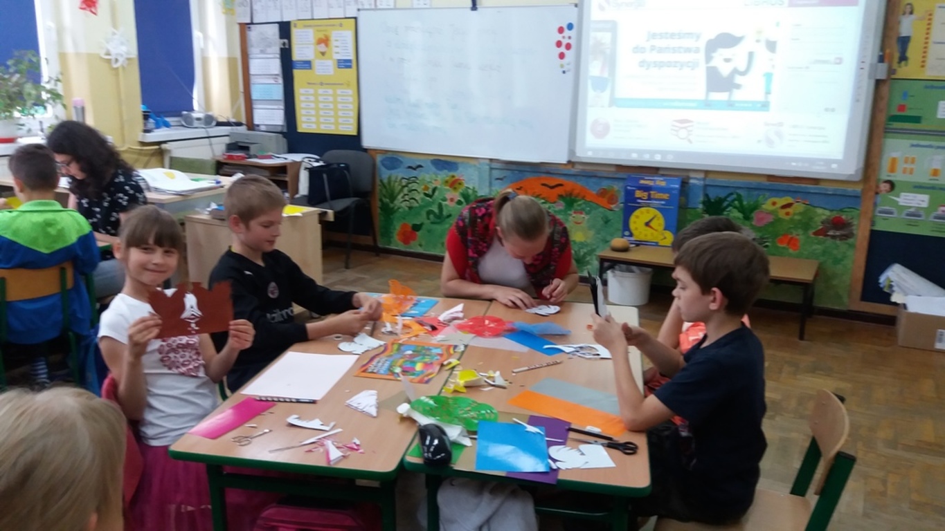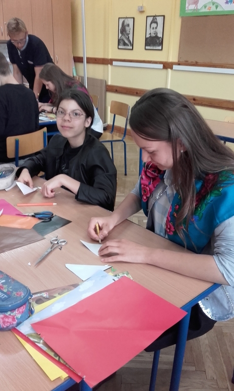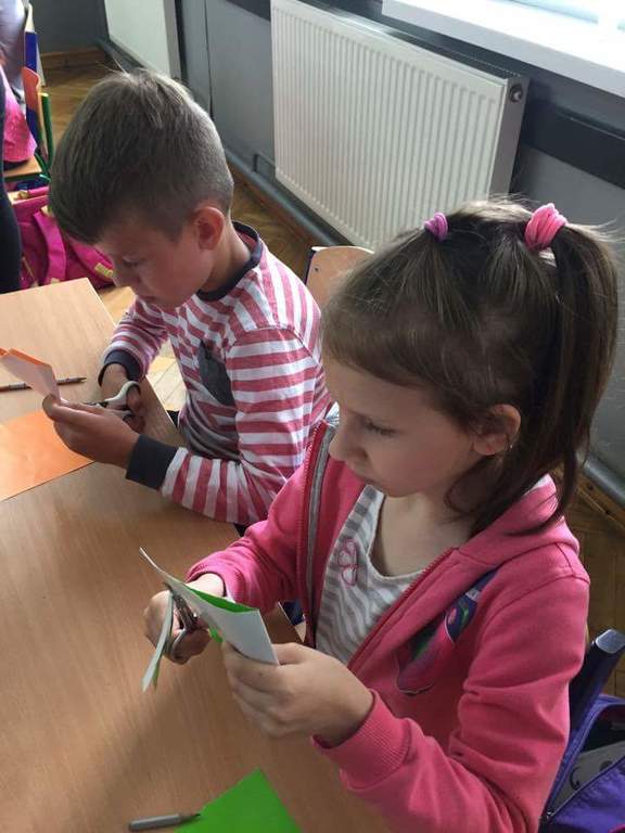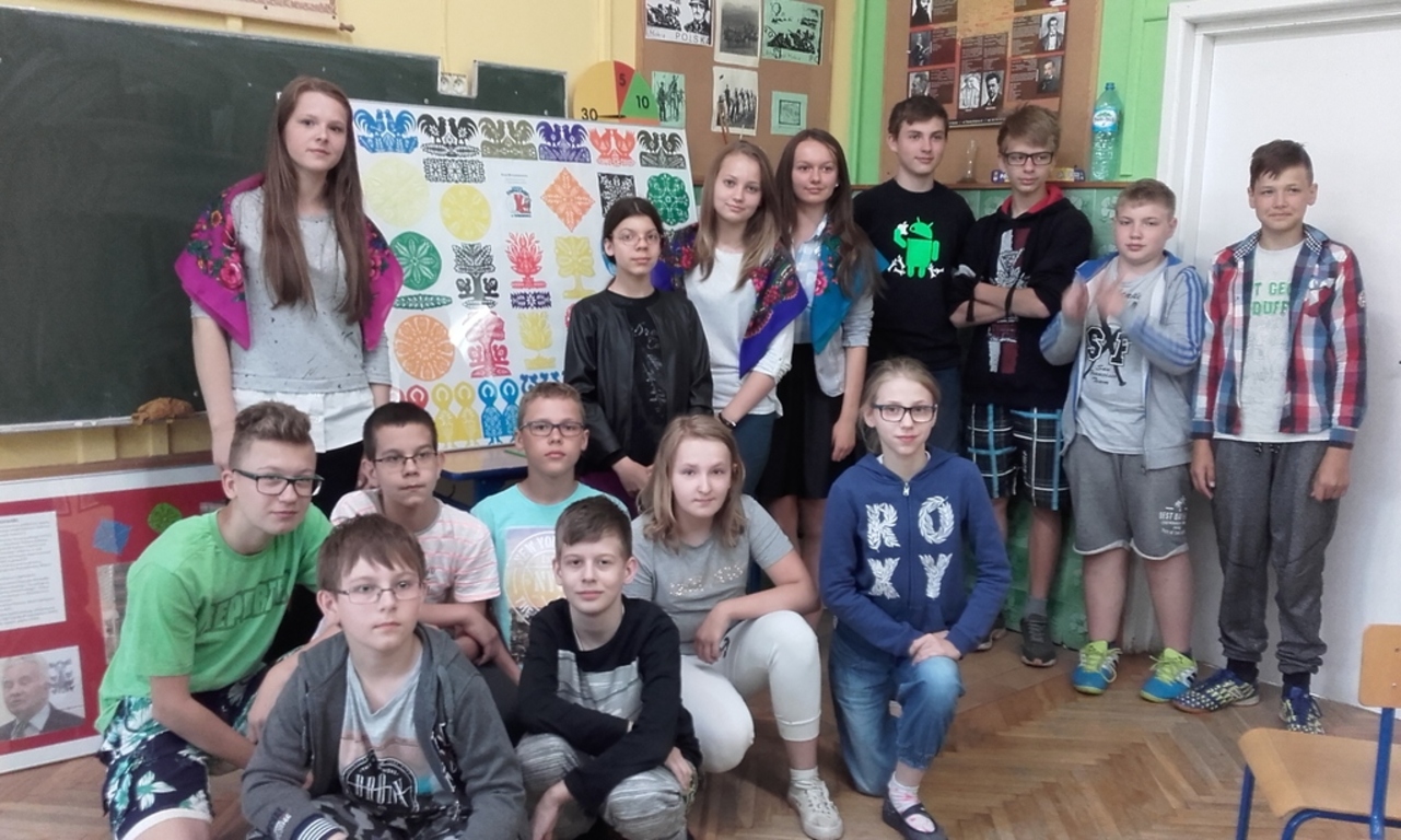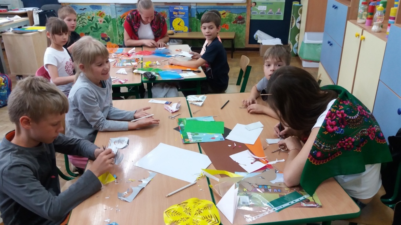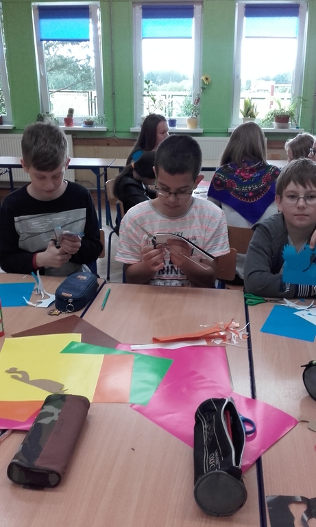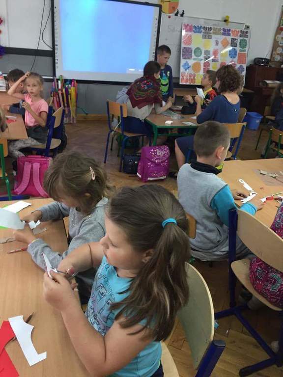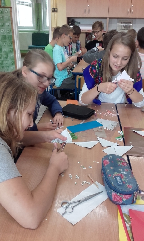 Dzięki kontaktom zawiązanym podczas jarmarku wielkanocnego udało się do naszej szkoły zaprosić uczniów kołbielskiego gimnazjum im. Oskara Kolberga , którzy wraz z opiekunką przyjechali 13 czerwca na warsztaty plastyczne. Organizacją zajęć zajęła się p. Elżbieta Dziewulska, dzięki której mogły w nich uczestniczyć klasy I, II a i VI. Okazało się ,że wycinanki w klasie VI najlepiej wychodziły chłopcom, którzy odkryli w sobie prawdziwy talent i wykazali się dużym zaangażowaniem, co widać na zdjęciach. Dzięki tym zajęciom nie tylko nauczyliśmy się techniki wycinania, ale przybliżyliśmy sobie tradycje naszego regionu i doceniliśmy naszą „małą ojczyznę.”