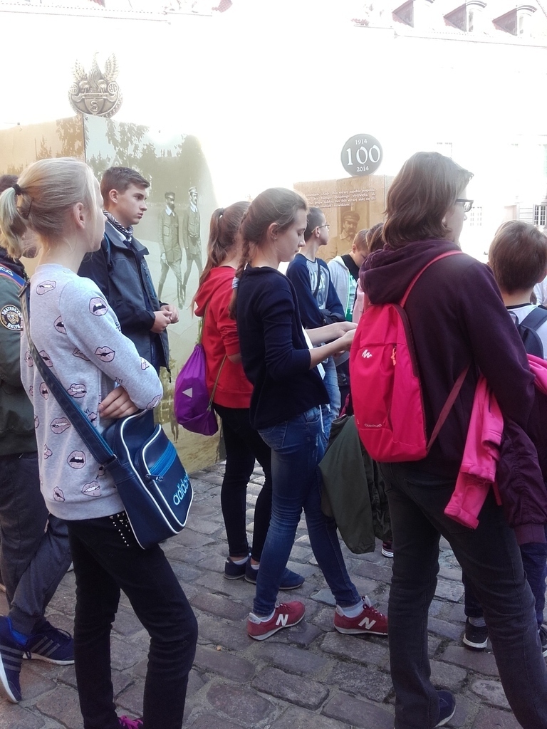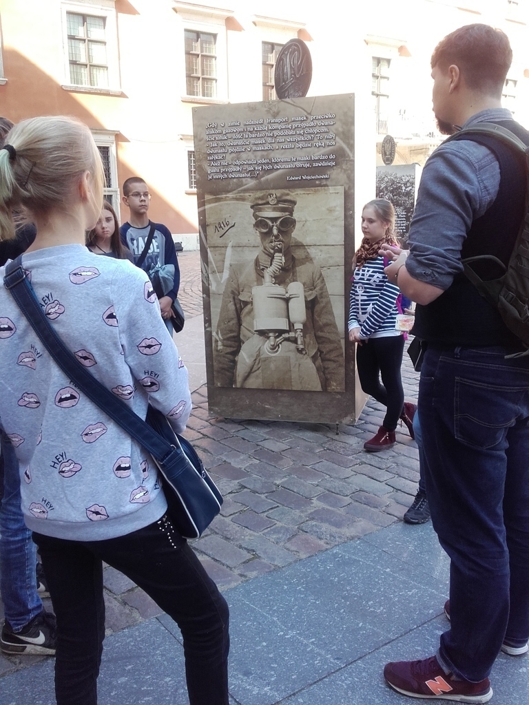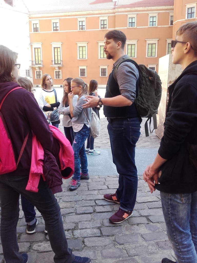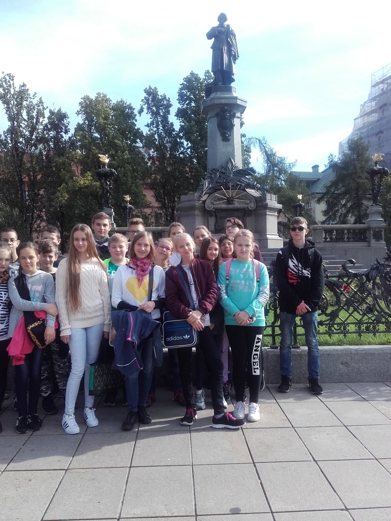 W ubiegły wtorek , 19 września już o 8 rano uczniowie dwóch klas czekali z niecierpliwością przed szkołą na autokar, który miał ich zawieźć do Warszawy. W ramach spotkań z historią mieliśmy obejrzeć na dziedzińcu Zamku Królewskiego wystawę poświęconą niepodległości, a potem pójść na warsztaty plastyczne. Nasza klasa , czyli VII musiała na nie poczekać, dlatego nasza wychowawczyni, p.Marzenna Bieńko zabrała nas na spacer traktem królewskim. Obejrzeliśmy panoramę Pragi z tarasu widokowego, potem poszliśmy na rynek .Oczywiście, zrobiliśmy sobie zdjęcie z Syrenką .Zajrzeliśmy też do bazyliki św..Jana .Po drodze przeszliśmy przez wystawę poświęconą Tadeuszowi Kościuszce. Obowiązkowy postój mieliśmy przed pomnikami Adama Mickiewicza i Bolesława Prusa. Pogoda była piękna, więc spacerowało się nam dobrze.