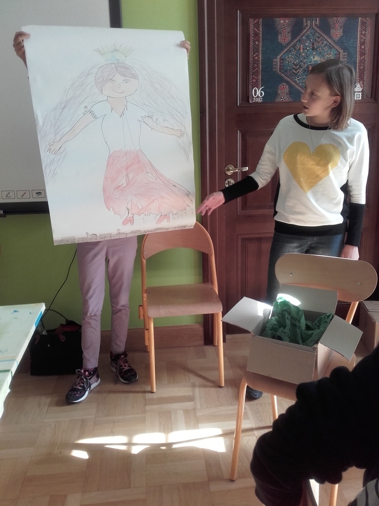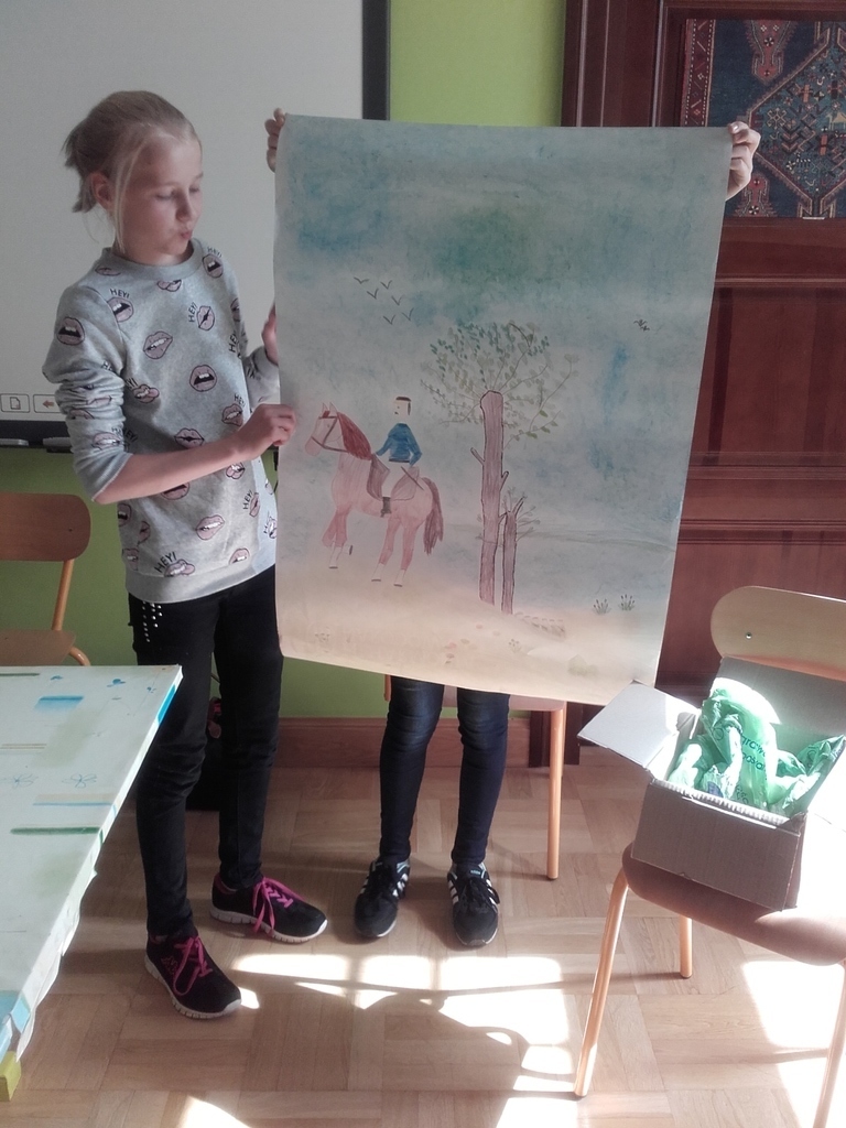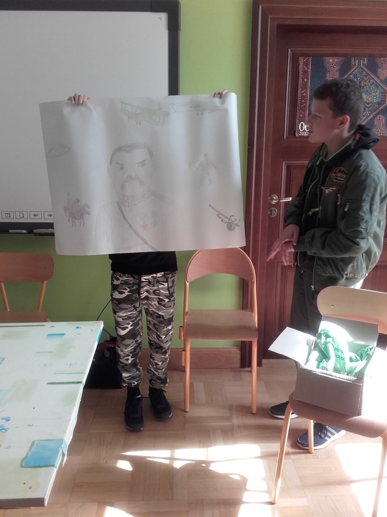 Potem wróciliśmy do Zamku i oglądaliśmy wystawę. Dużo przewodnik mówił o Józefie Piłsudskim i jego żołnierzach. Później w Pałacu Pod Blachą mieliśmy zajęcia plastyczne polegające na narysowaniu jakiegoś fragmentu wystawy. Po zakończeniu zajęć poszliśmy do autokaru i odjechaliśmy do szkoły.