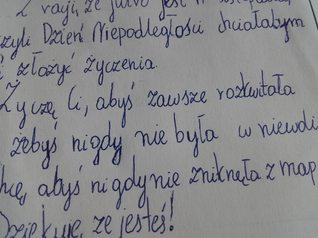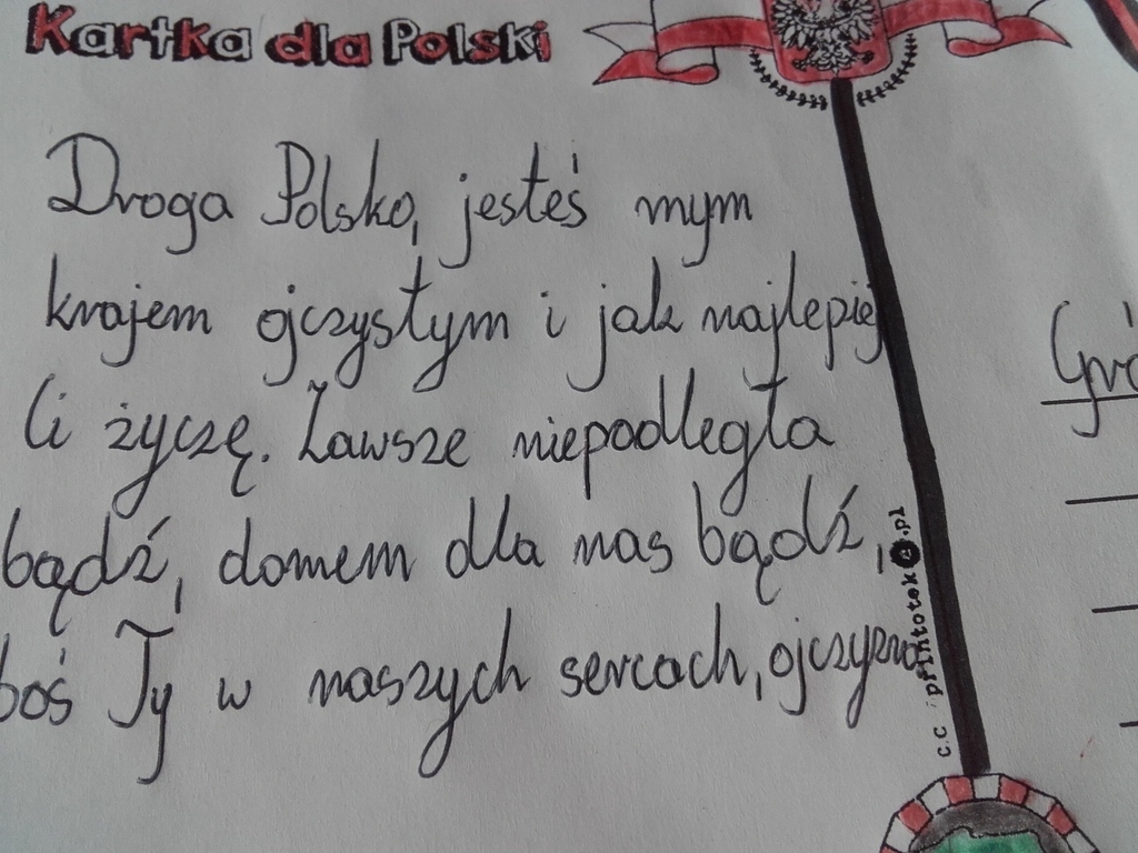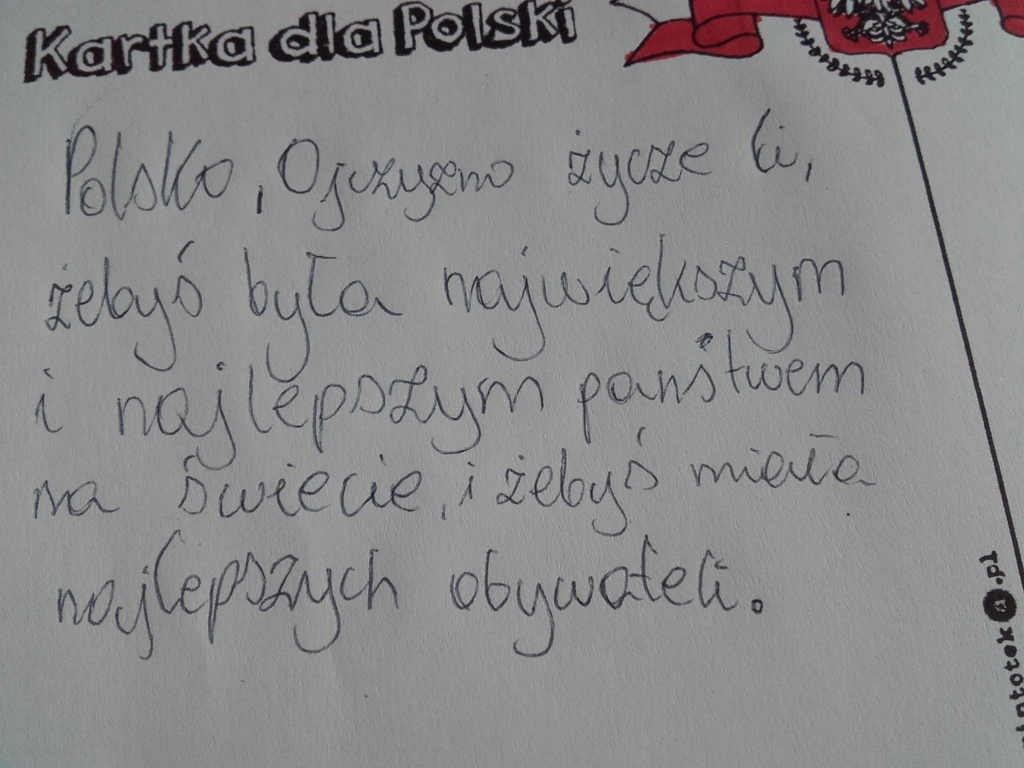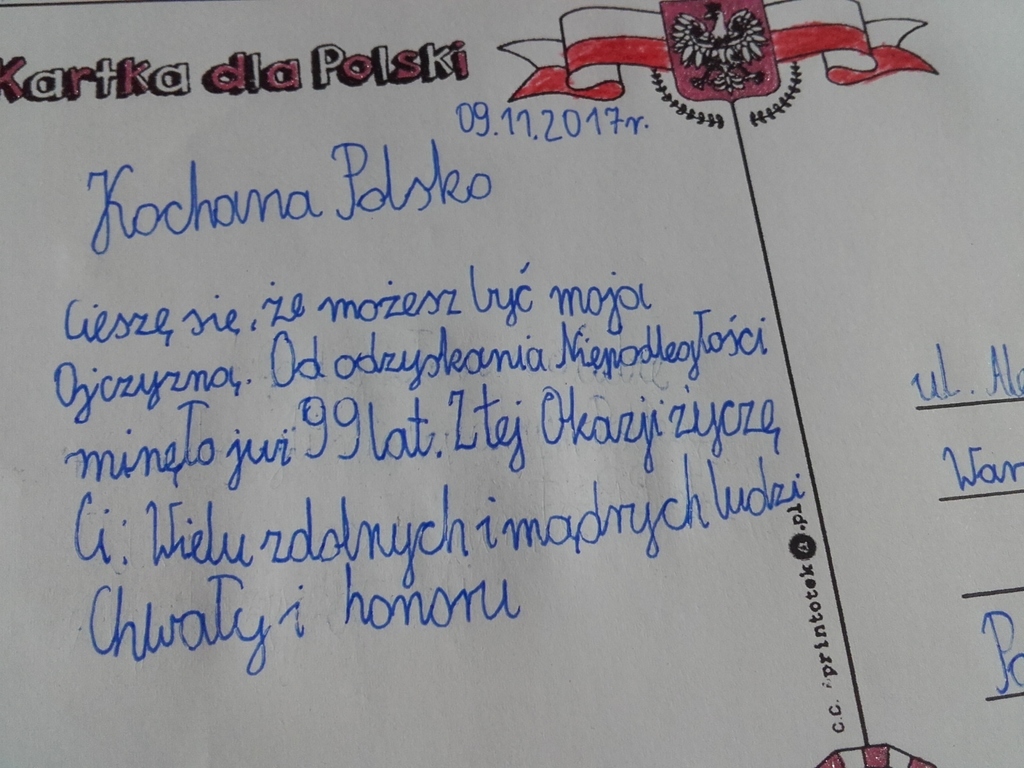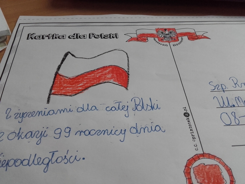 Z okazji nadchodzącego święta – 99.rocznicy odzyskania przez Polskę niepodległości , uczniowie klas IV b i V przygotowali kartkę z życzeniami dla naszej ojczyzny .A tak wyglądały efekty ich pracy.