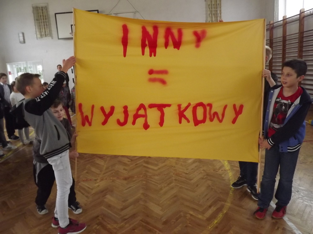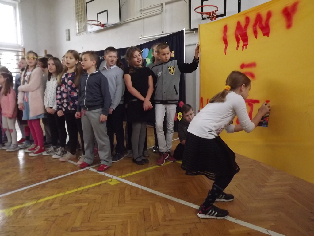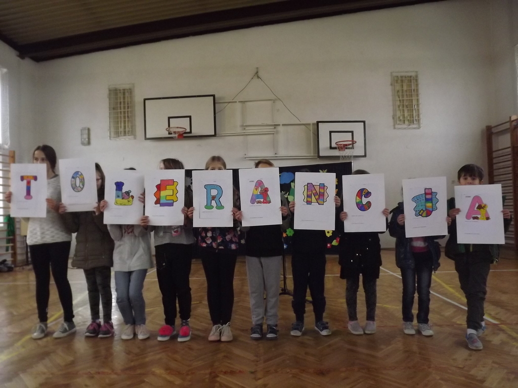 W dniu 20.11.2017 w naszej szkole obchodziliśmy Dzień Tolerancji. Okolicznościowy apel z tej okazji przygotowały klasy 4A, 4B wraz z wychowawczyniami oraz koło muzyczne pod kierunkiem pani Małgorzaty Boguckiej. Występ rozpoczął się międzyklasową układanką z rozsypanki literowej. Uczniowie utworzyli hasło TOLERANCJA. Następnie uczniowie naszej szkoły obejrzeli scenkę w wykonaniu uczniów klasy 4B i wysłuchali wierszyków recytowanych przez uczniów klasy 4A. Na koniec uroczystości wszyscy zgromadzeni obejrzeli happening, który stanowił podsumowanie apelu.