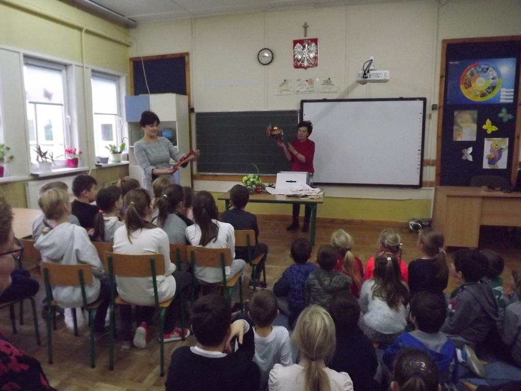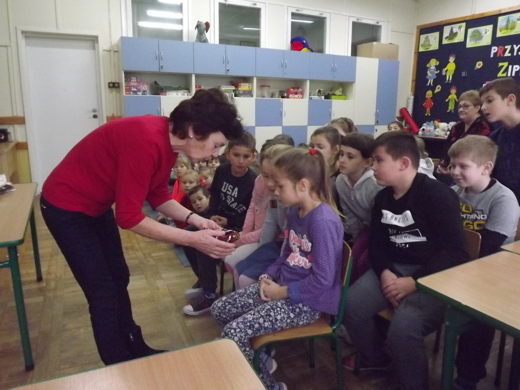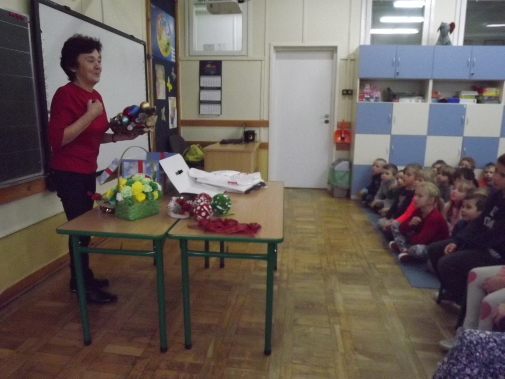 16 listopada 2017 roku uczniowie klas 0–III spotkali się z Panią Haliną Majszczyk – niezwykle utalentowaną mieszkanką naszej miejscowości. Pani Halina opowiedziała nam o swojej pasji i zaprezentowała własnoręcznie wykonane prace: haftowane serwety, makatki, kompozycje kwiatowe z kolorowej krepiny i ozdobne stroiki świąteczne. W czasie spotkania zobaczyliśmy jak można ciekawie wykorzystać często niepotrzebne już rzeczy. Bardzo spodobały nam się między innymi róże wykonane ze skórek pomarańczy.