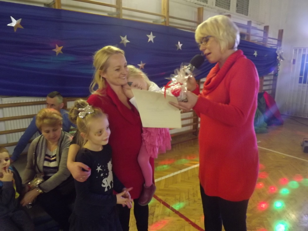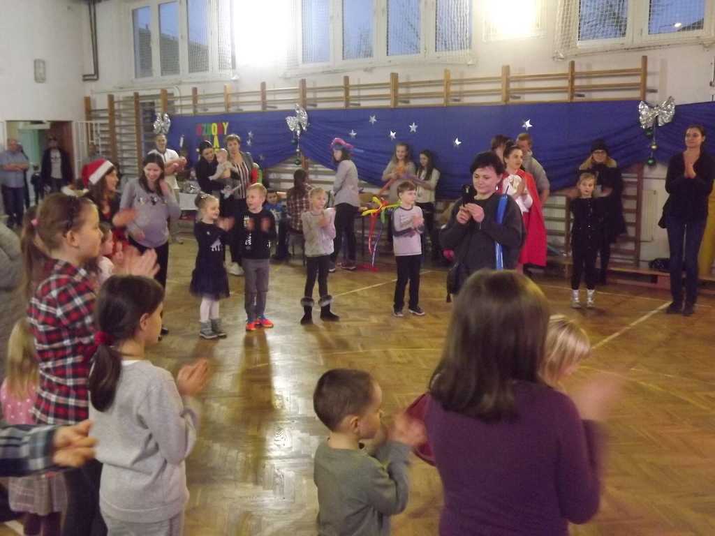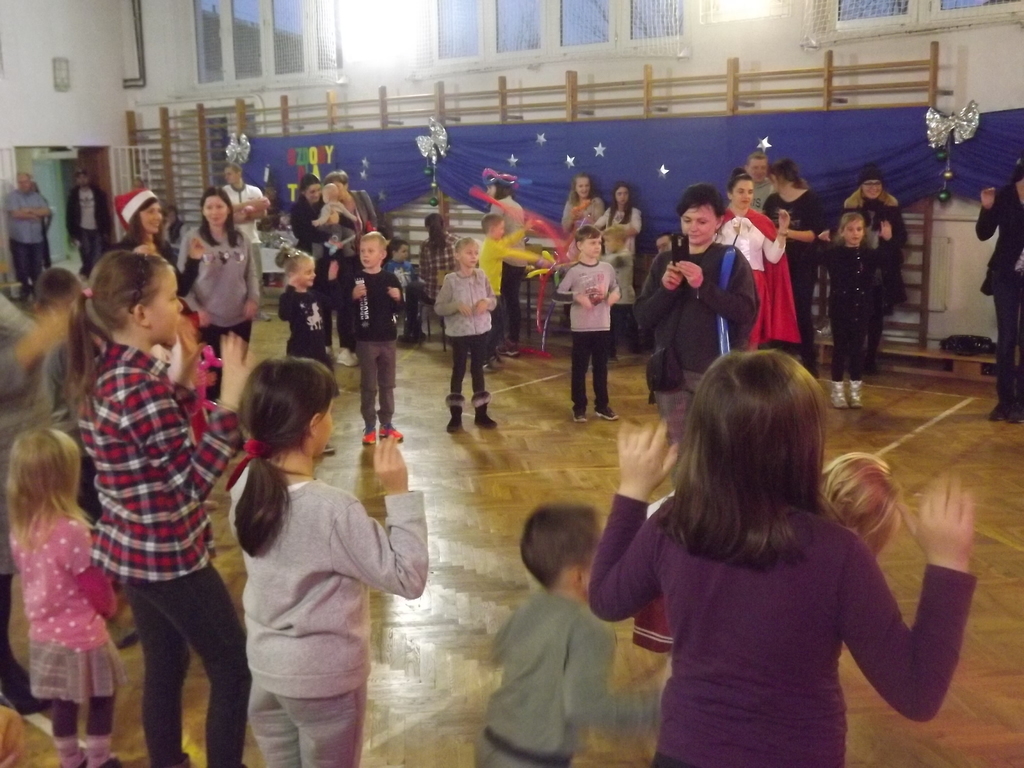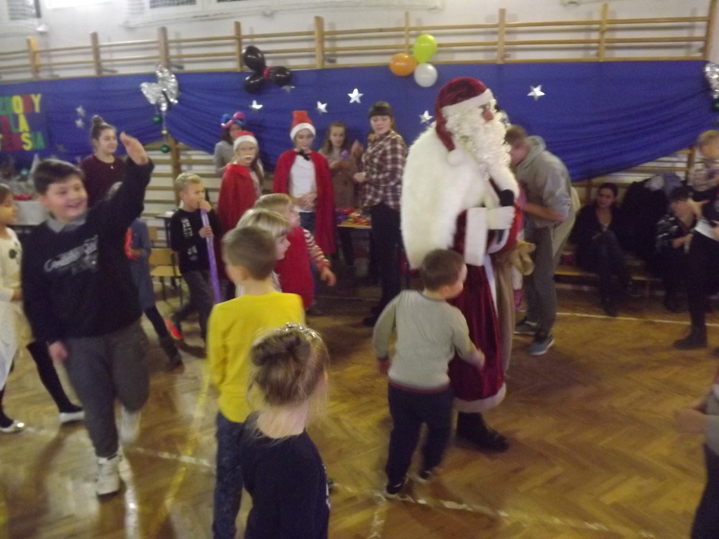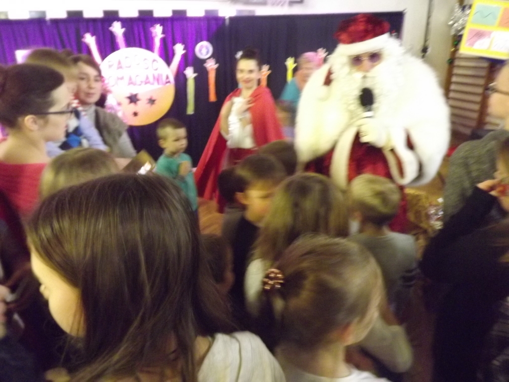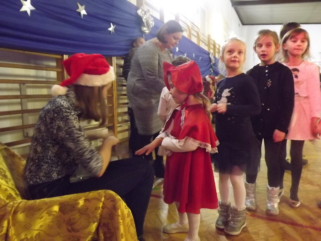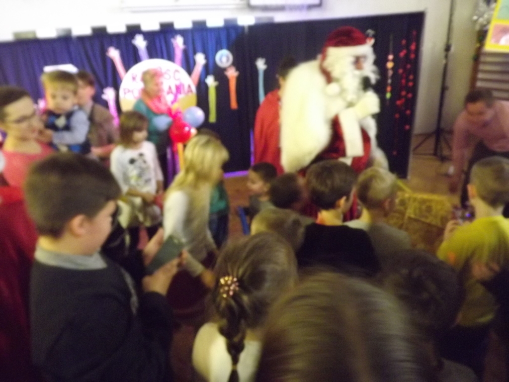 Zjednoczenie Apostolstwa Katolickiego działające przy parafii we współpracy z naszą szkołą w niedzielę, 10 grudnia, zorganizowało świąteczne spotkanie z Mikołajem. Zaproszono na nie wszystkie dzieci, zwłaszcza licznie przybyły te najmłodsze. Gośćmi honorowymi byli :pani dyrektor Agnieszka Korniluk, ks. proboszcz Robert Turyk i przewodnicząca Rady Rodziców pani Kamila Radomska-Piętka. Przeczytali oni dzieciom świąteczne bajki, a później rozpoczęła się zabawa. Centralnym punktem było przybycie Mikołaja, który wszystkim milusińskim rozdał prezenty. Ustawiła się długa kolejka, ale dzięki pomocy Śnieżynek szybko uporano się z podarunkami.