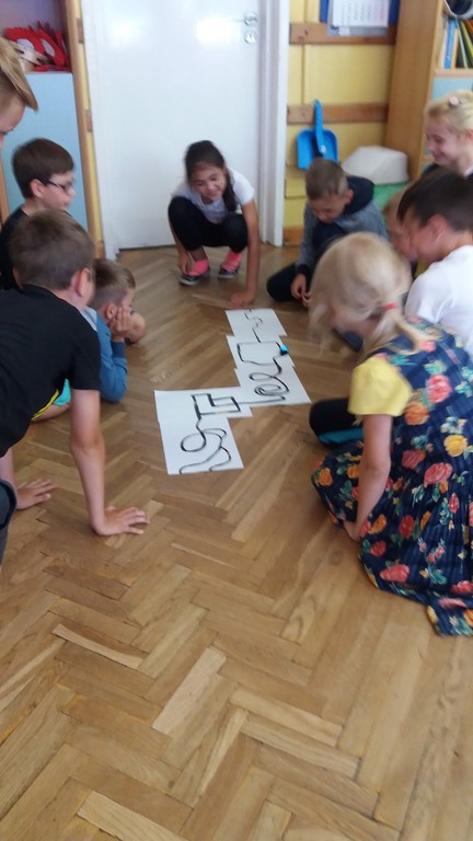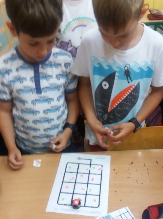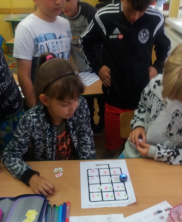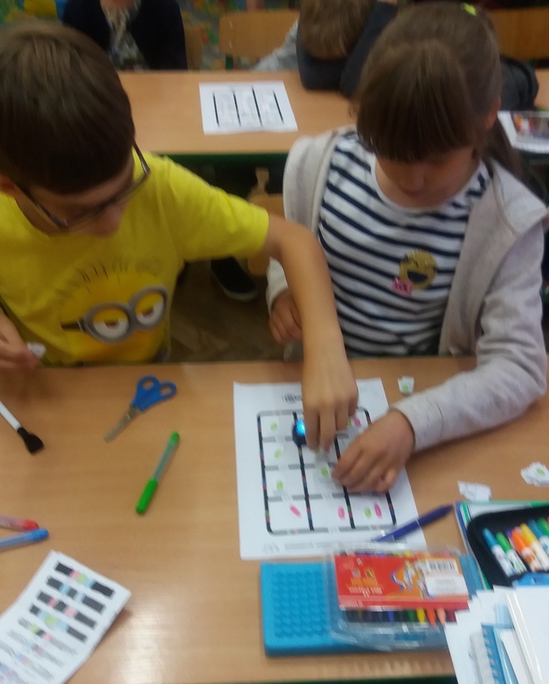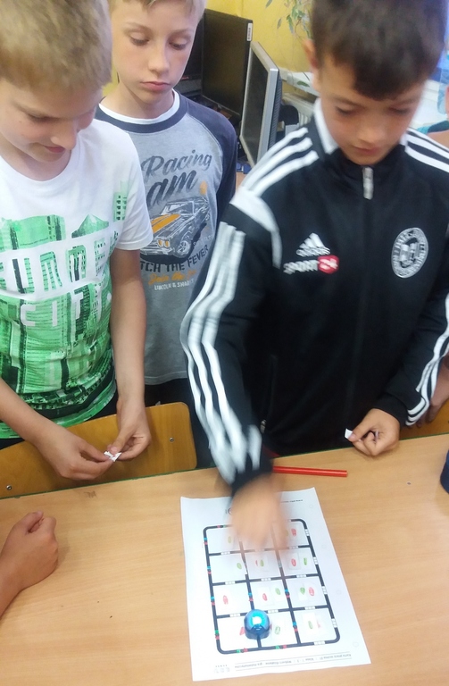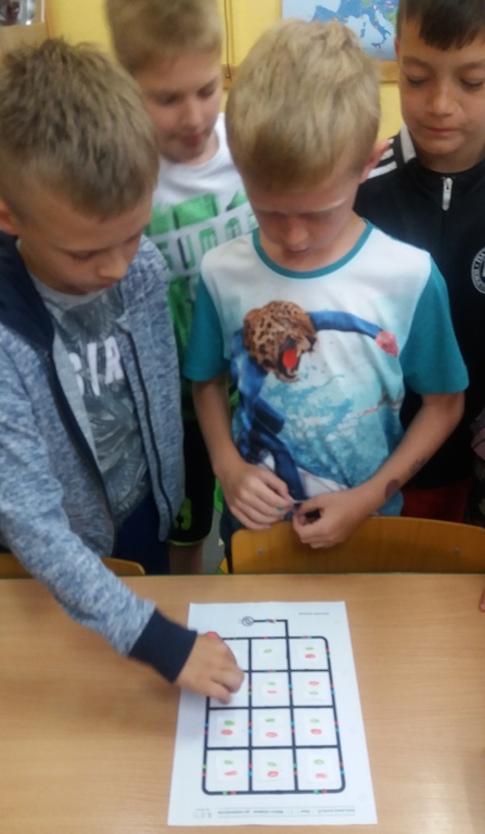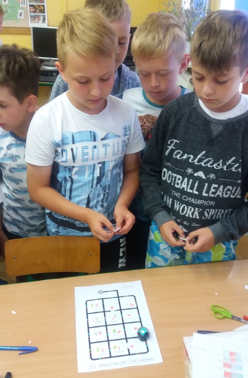 We czwartek 7 czerwca na zaproszenie naszej wychowawczyni Pani Ani przybył do nas na tydzień niezwykły „gość” Robot - Ozobot. Najpierw w klasie I kodowaliśmy bez komputera, w klasie II i III przeszliśmy kilka kursów kodowania na www.code.org, Wielu z nas spodobało się i wciągnęło kodowanie z Minecraftem. Teraz poznajemy elementy programowania i robotyki, uczymy się programować robota. Brzmi poważnie ale też świetnie się bawimy. Uczymy się wykorzystywać kolorowe kody do sterowania robotem, tak by doszedł tam gdzie chcemy. Na edukacji matematycznej pracując w parach programowaliśmy robota, który miał poruszać się po planszy tak byśmy zebrali karteczki z przykładami z mnożenia lub dzielenia ze wszystkich pól. Później wykonywaliśmy obliczenia i zdobywaliśmy punkty. Musieliśmy wykazać się umiejętnością strategicznego, logicznego myślenia by ułożyć kody tak, żeby robot przewędrował obok każdego pola planszy i wrócił na start. Udało się prawie wszystkim, jednej parze zabrakło 1 pola a u drugiej to chyba robotowi spodobała się trasa bo dopiero po drugim objeździe wrócił na start. Podobną grę na tych samych planszach Pani zapowiedziała na edukacji polonistycznej, pewnie będziemy ćwiczyć ortografię.