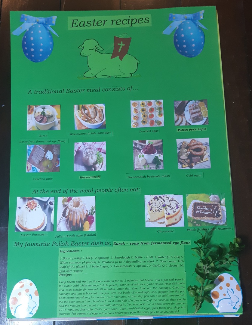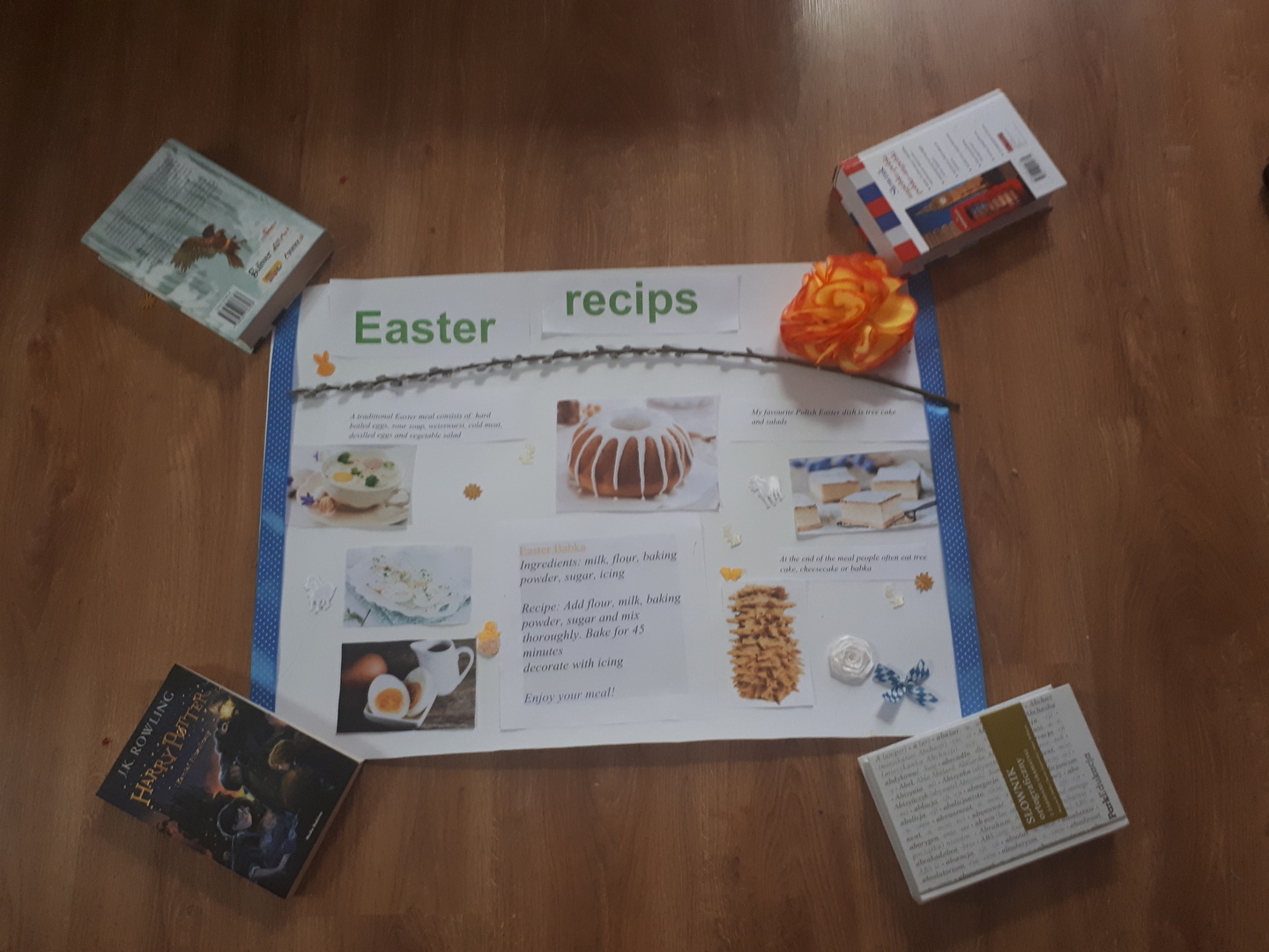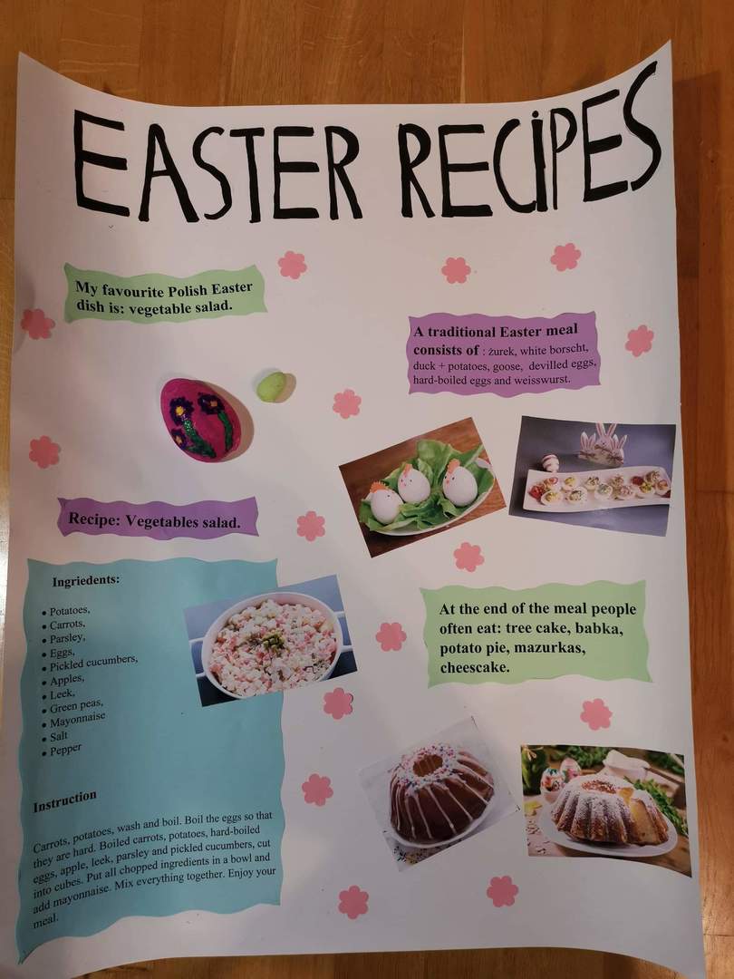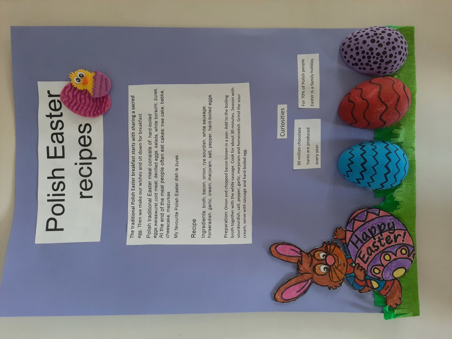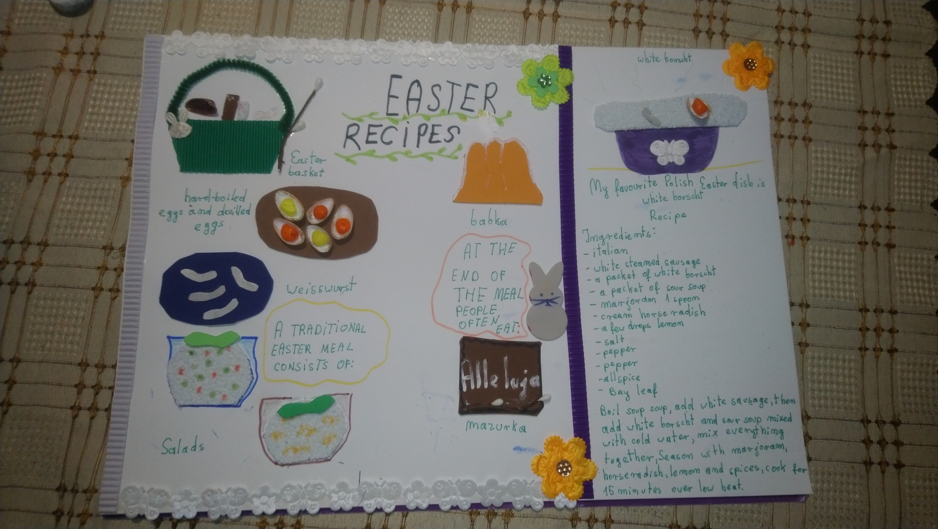 Uczniowie klas szóstych w ramach zajęć z języka angielskiego wykonali smakowity projekt pod tytułem „Easter recipes”. Celem projektu było utrwalenie nowopoznanych struktur (tryb rozkazujący) oraz słownictwa związanego z gotowaniem. Szóstoklasiści życzą wszystkim kolegom, nauczycielom i pozostałym pracownikom szkoły Happy Easter!!!