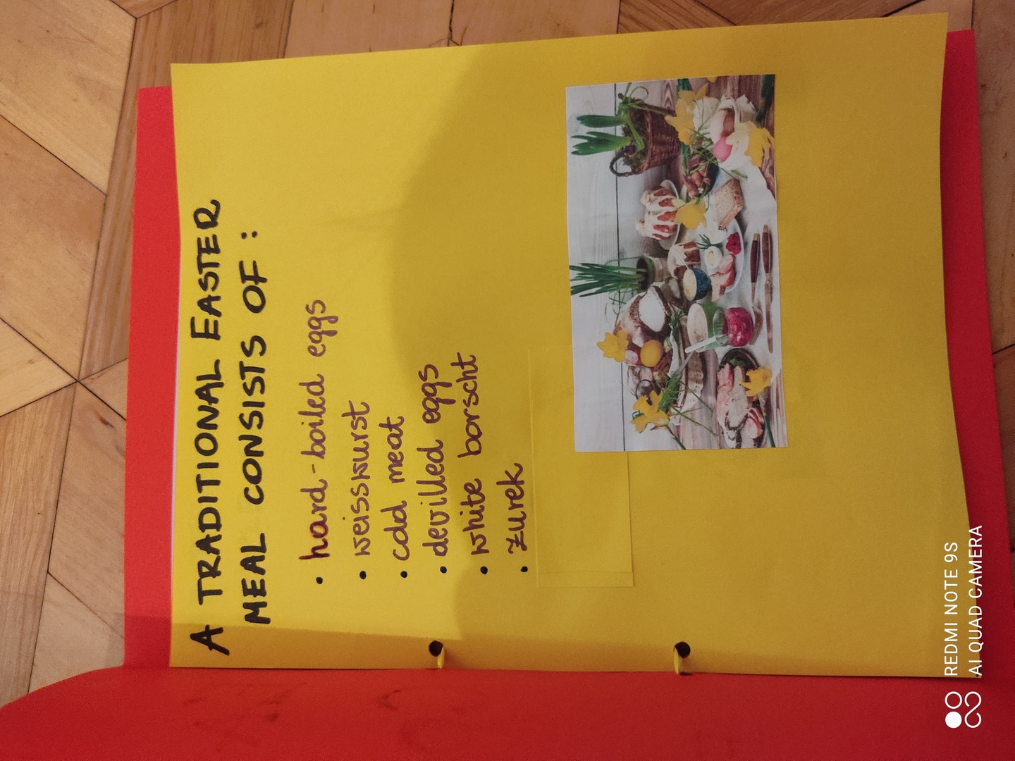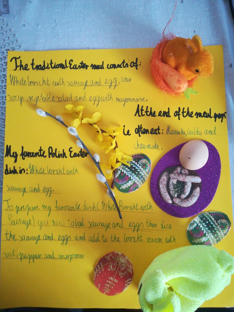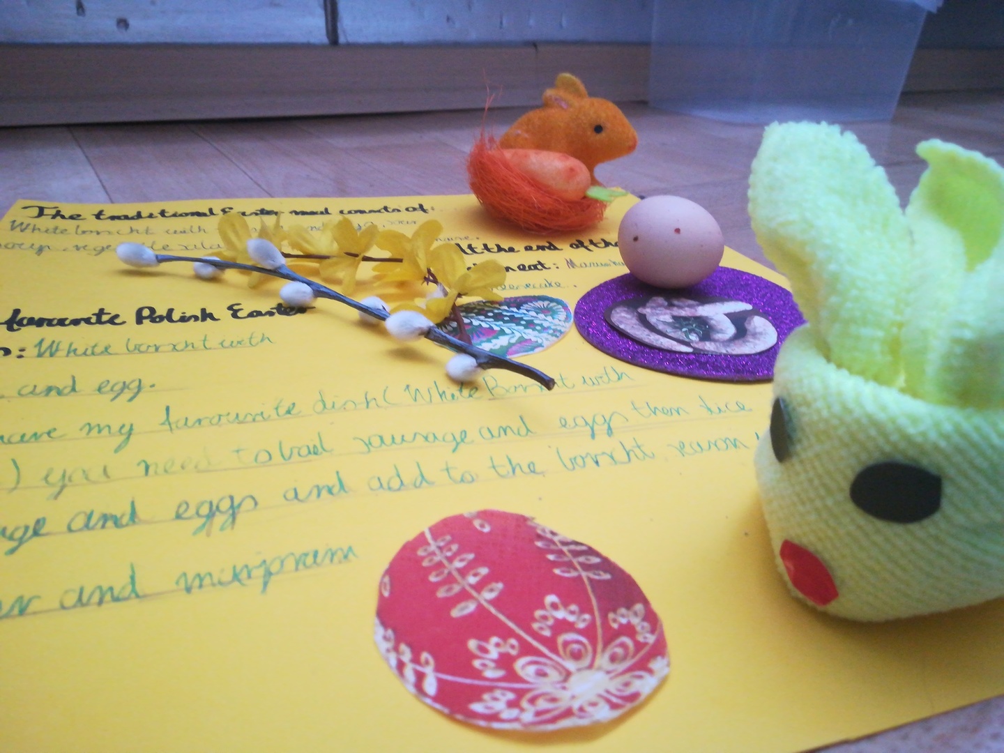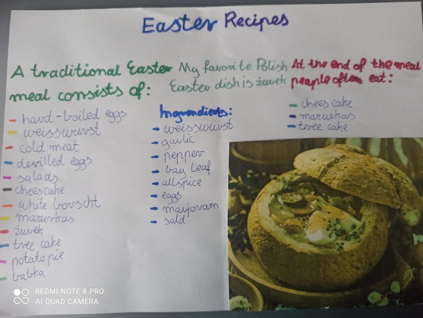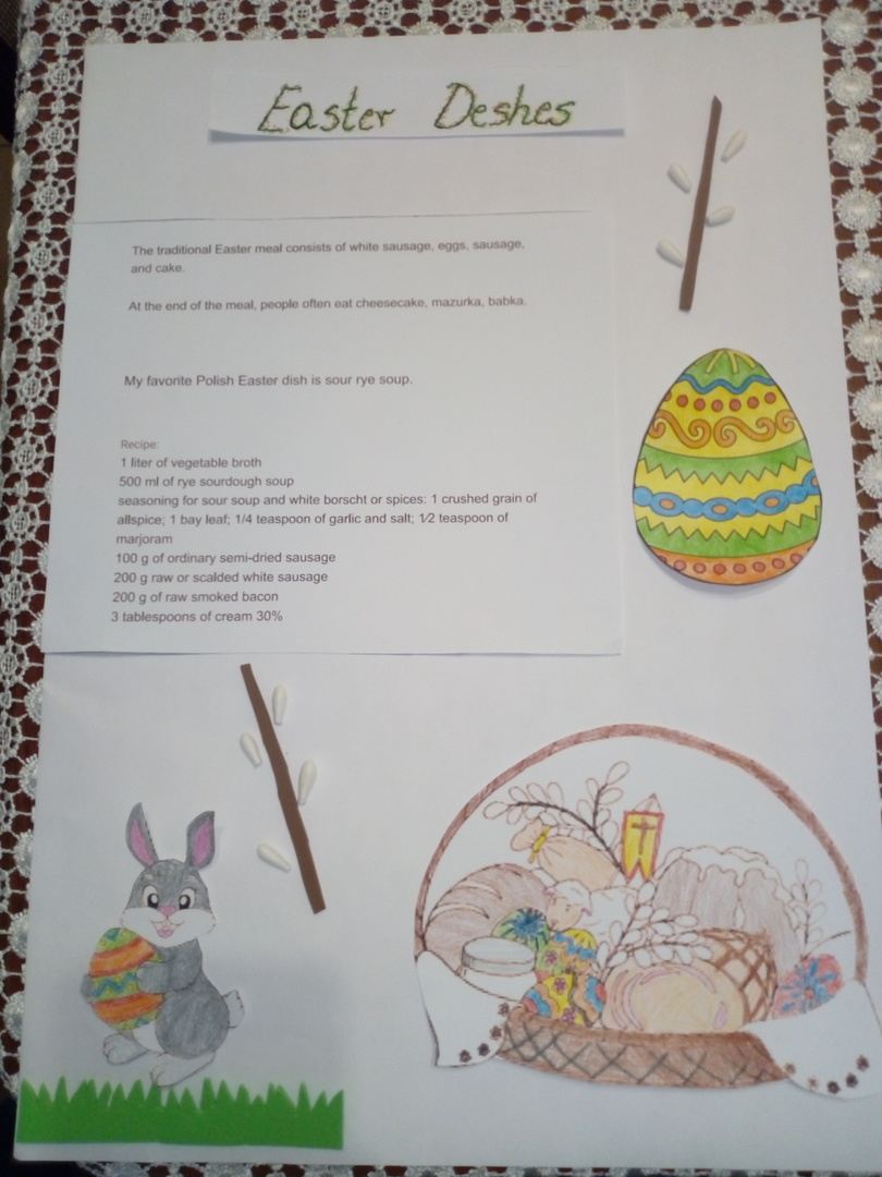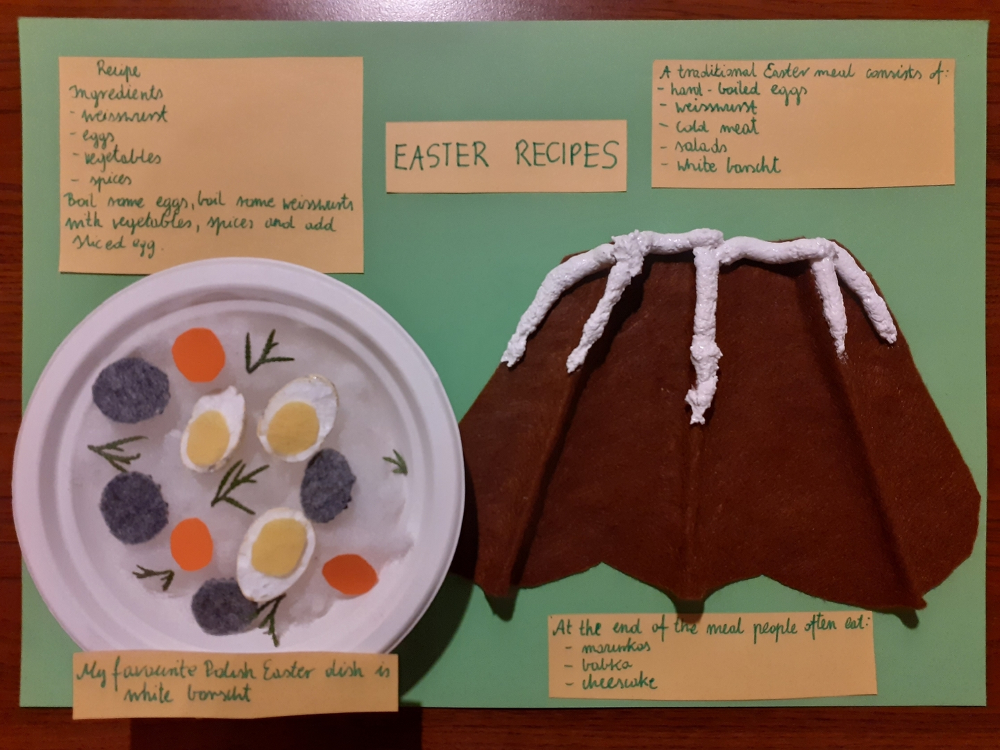 Uczniowie klas szóstych w ramach zajęć z języka angielskiego wykonali smakowity projekt pod tytułem „Easter recipes”. Celem projektu było utrwalenie nowopoznanych struktur (tryb rozkazujący) oraz słownictwa związanego z gotowaniem. Szóstoklasiści życzą wszystkim kolegom, nauczycielom i pozostałym pracownikom szkoły Happy Easter!!!