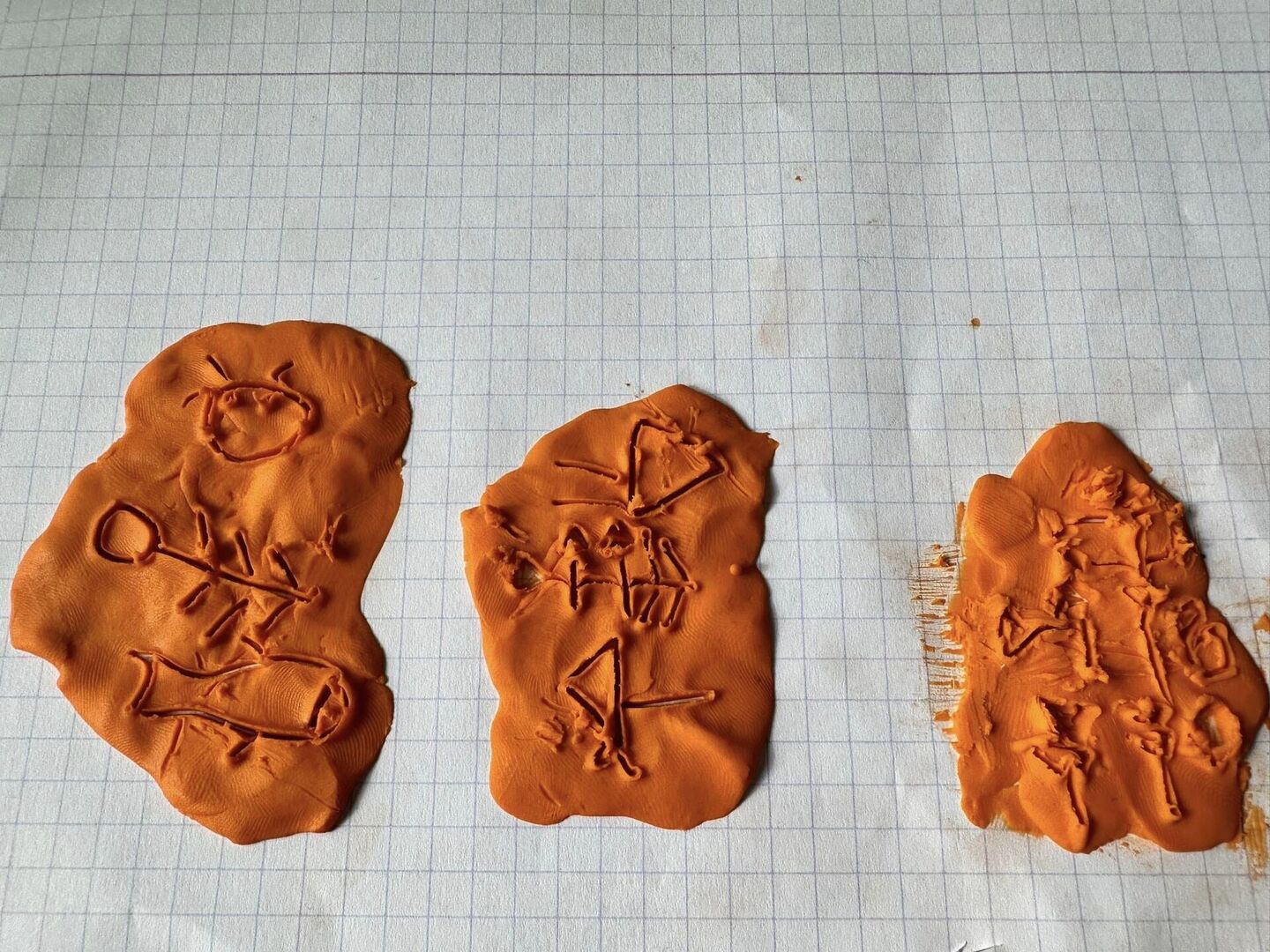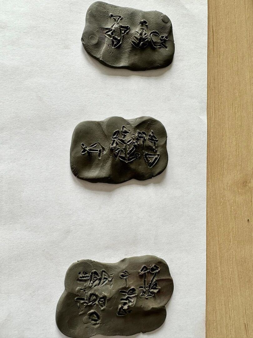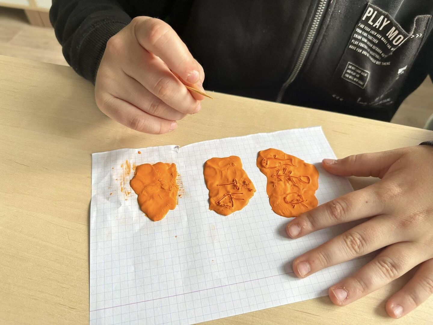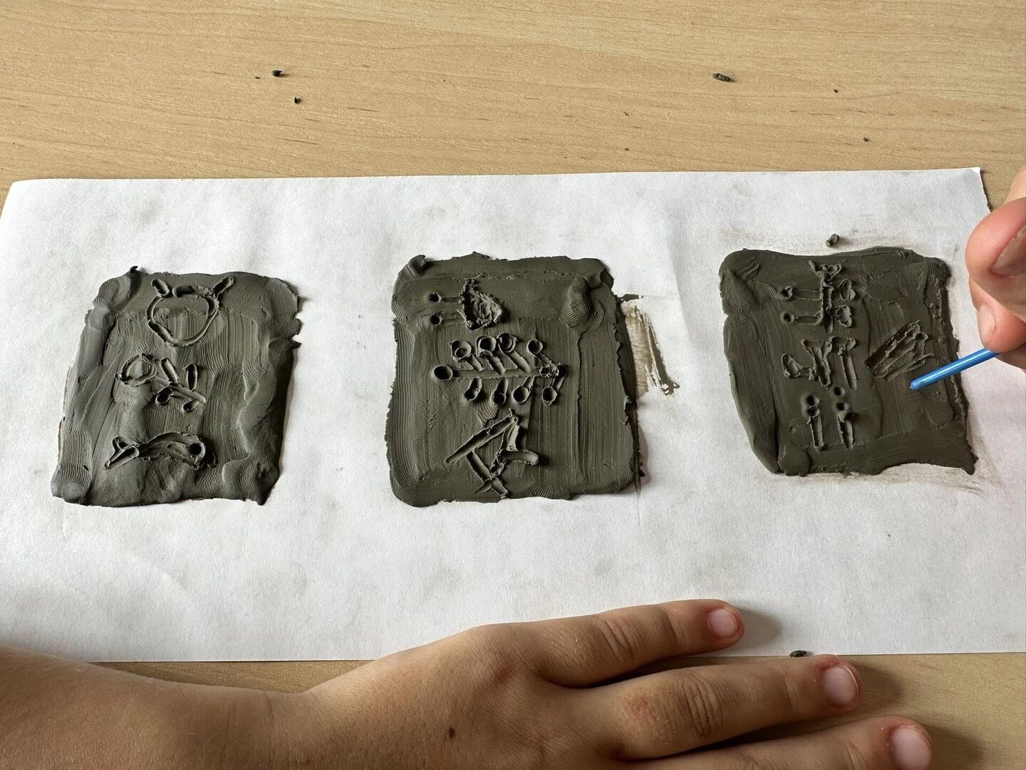 Zwieńczeniem zajęć było wykonanie przy pomocy plasteliny płaskiej powierzchni przypominającej glinianą tabliczkę, a następnie korzystając z wykałaczek dzieci próbowały odwzorować znaki pisma klinowego.