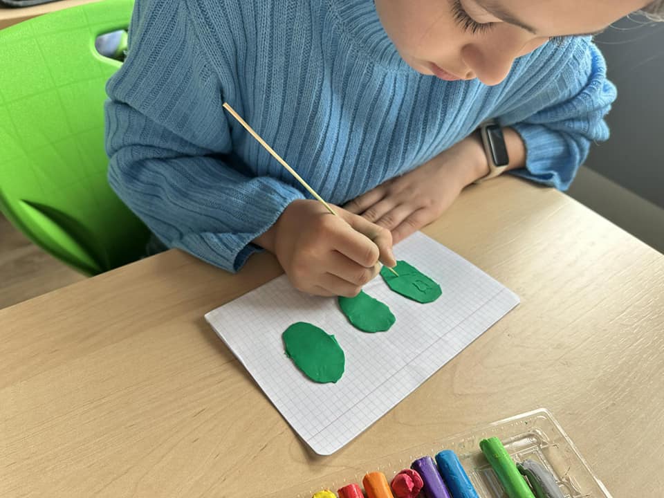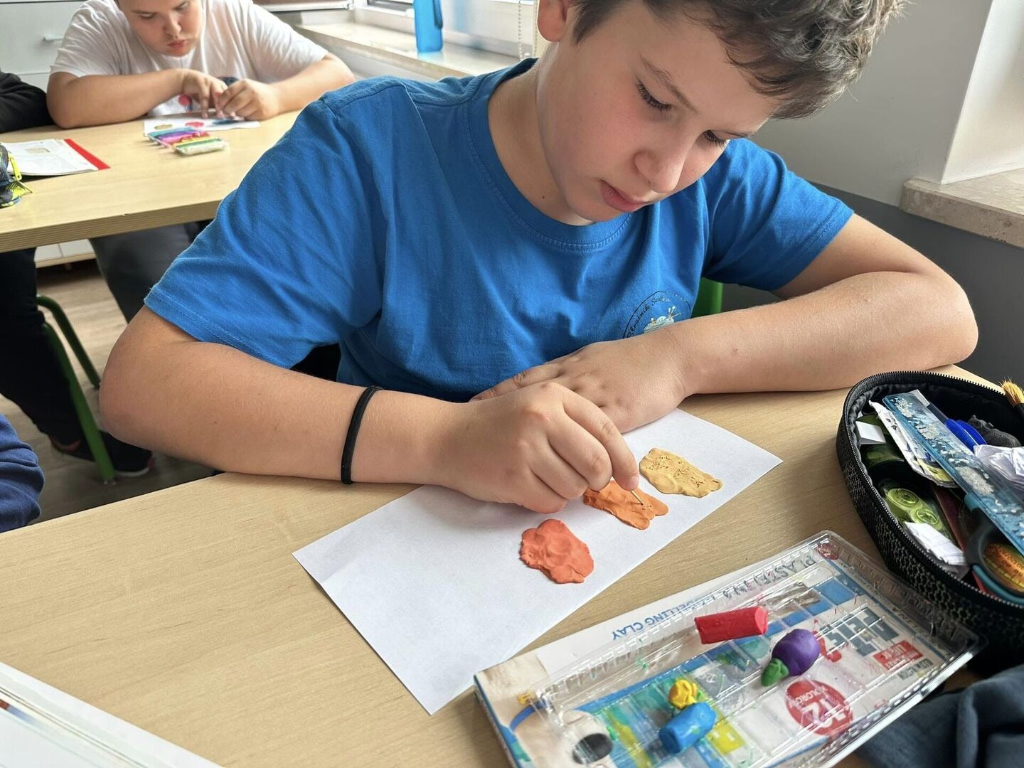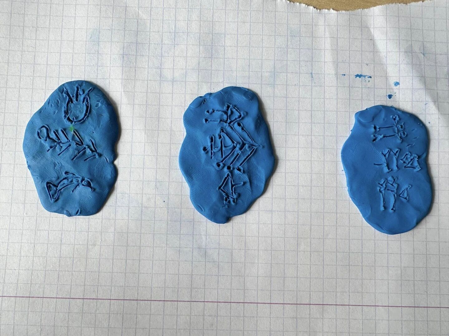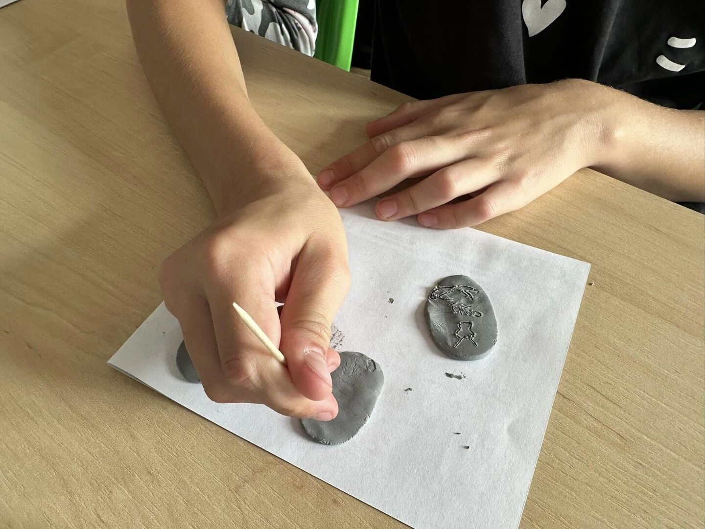 Zwieńczeniem zajęć było wykonanie przy pomocy plasteliny płaskiej powierzchni przypominającej glinianą tabliczkę, a następnie korzystając z wykałaczek dzieci próbowały odwzorować znaki pisma klinowego.