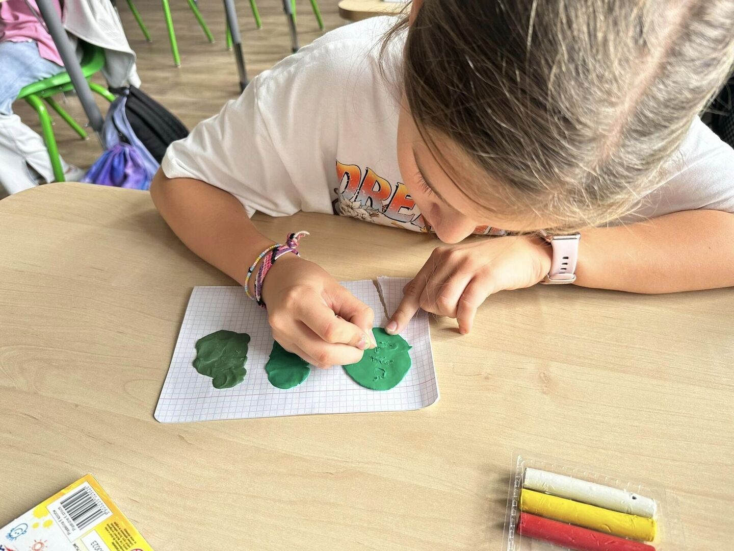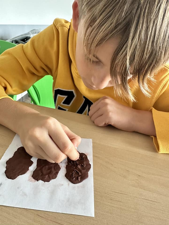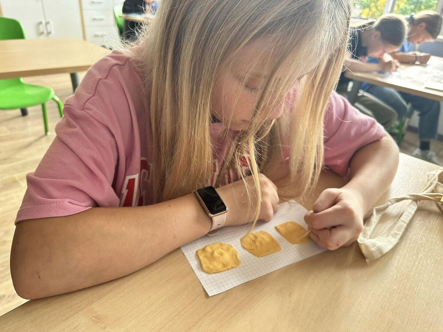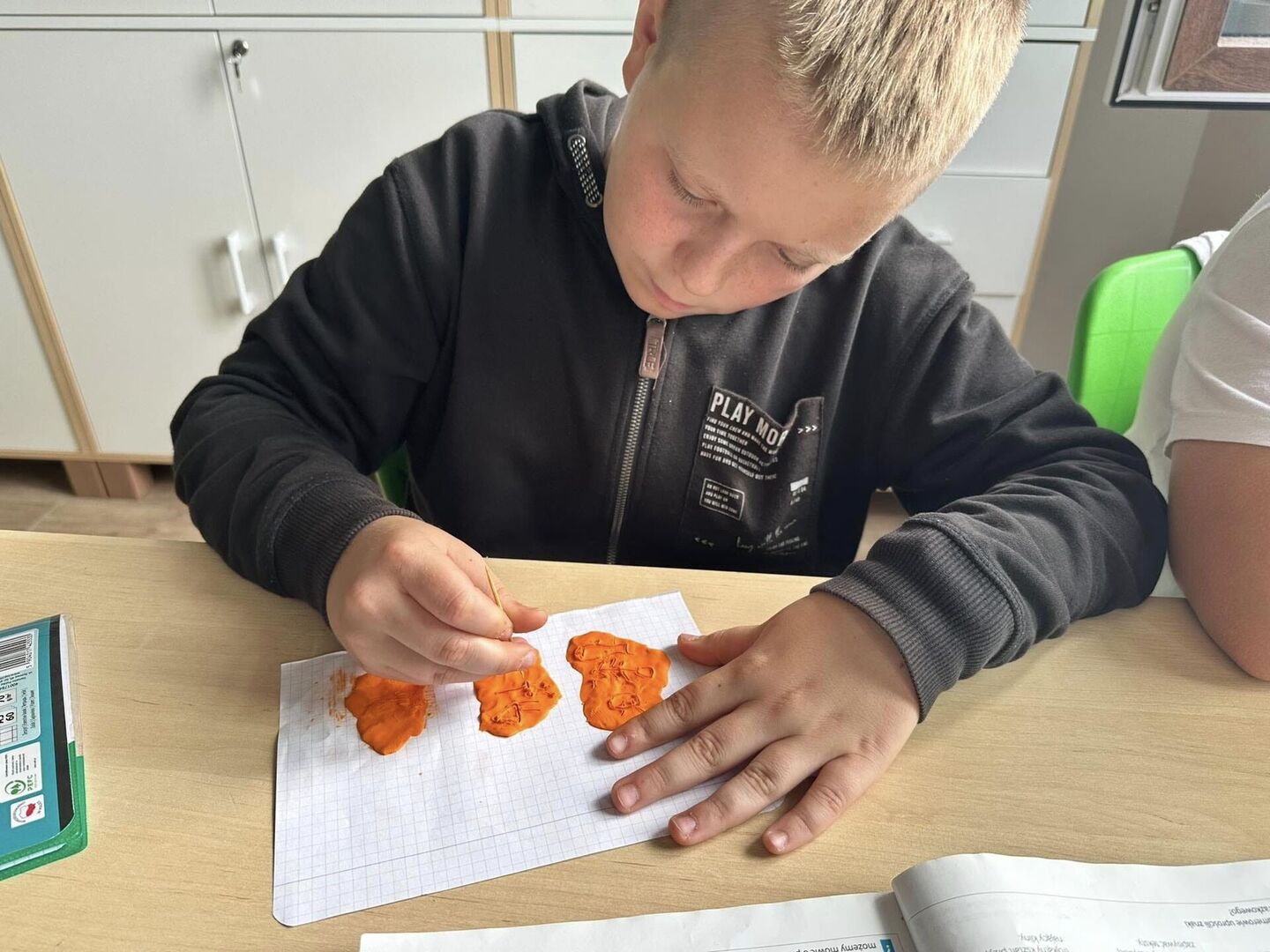 Zwieńczeniem zajęć było wykonanie przy pomocy plasteliny płaskiej powierzchni przypominającej glinianą tabliczkę, a następnie korzystając z wykałaczek dzieci próbowały odwzorować znaki pisma klinowego.