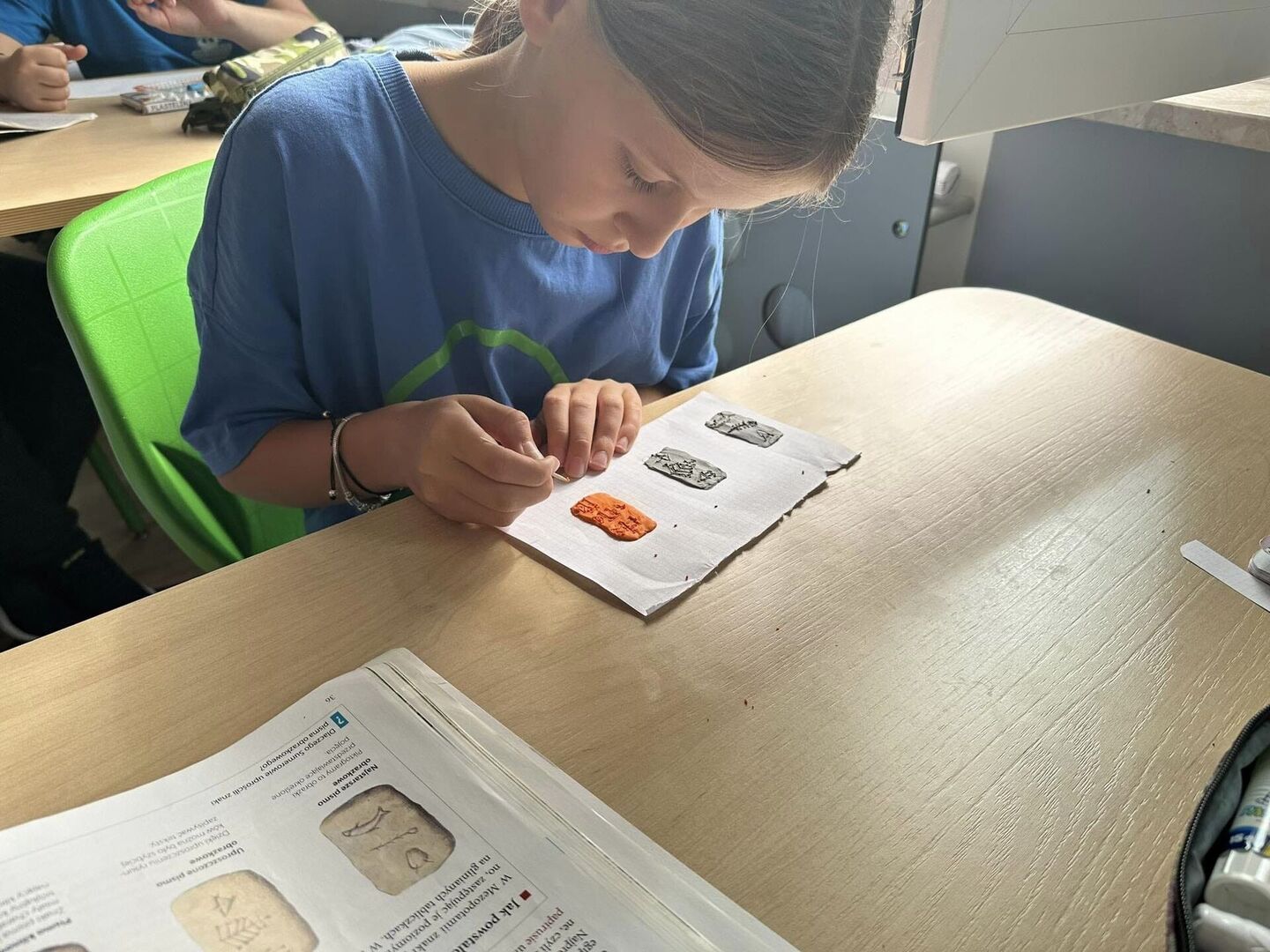 Dzieci dowiedziały się że nazwa pochodzi od sposobu pisania za pomocą trzcinowego rylca, którym wyciskano w glinianych tabliczkach znaki w kształcie klinów.