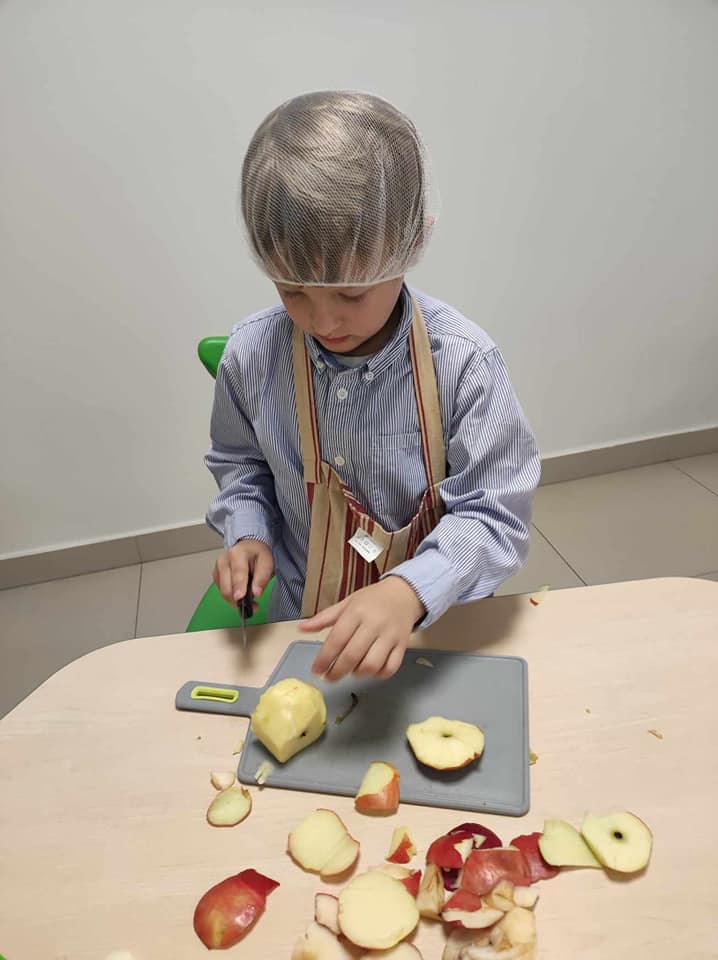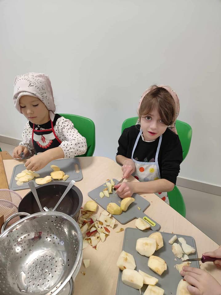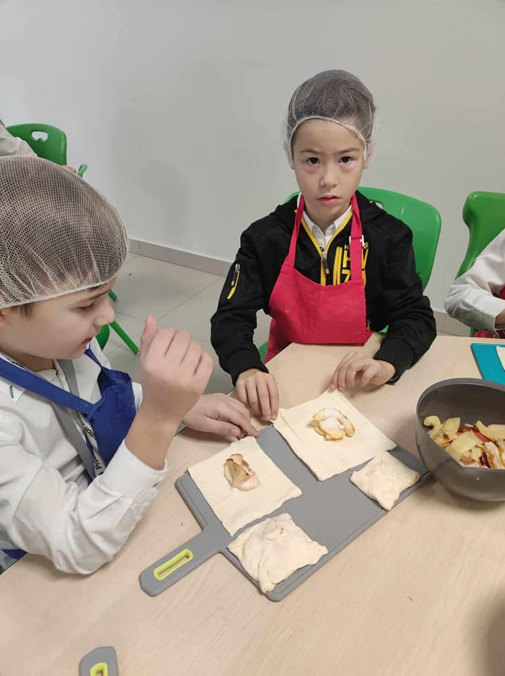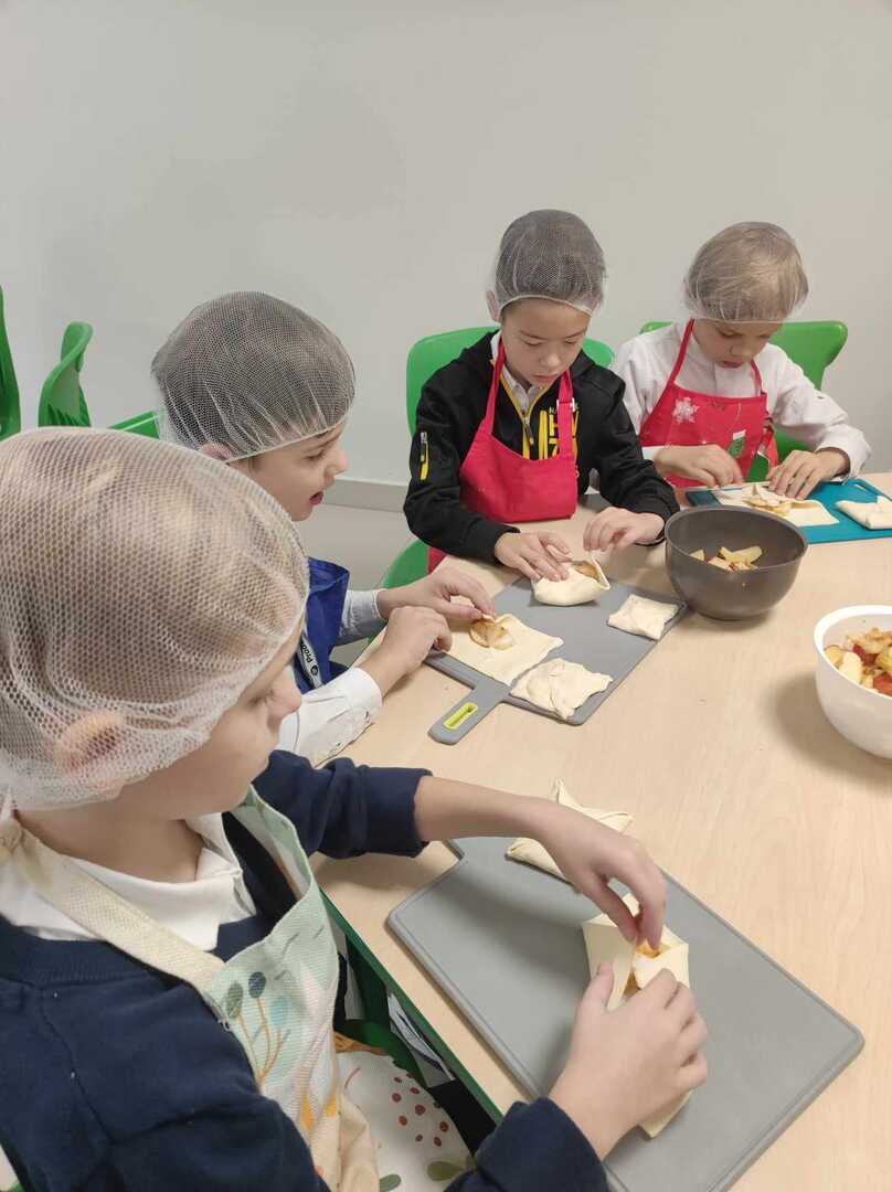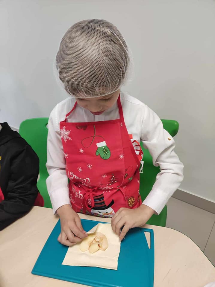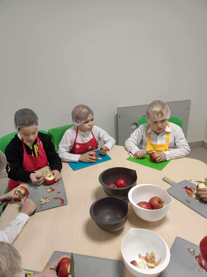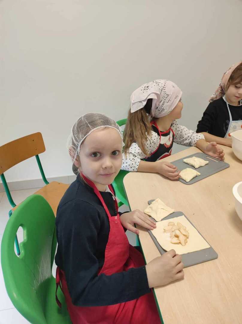 Kolejno dzieci zapoznawały się z różnymi składnikami, takimi jak ciasto francuskie, jabłka, cukier i cynamon. Wyjaśniono, skąd pochodzą i jak wpływają na smak ciasteczek. Następnie przystąpiono do przygotowywania ciasteczek.