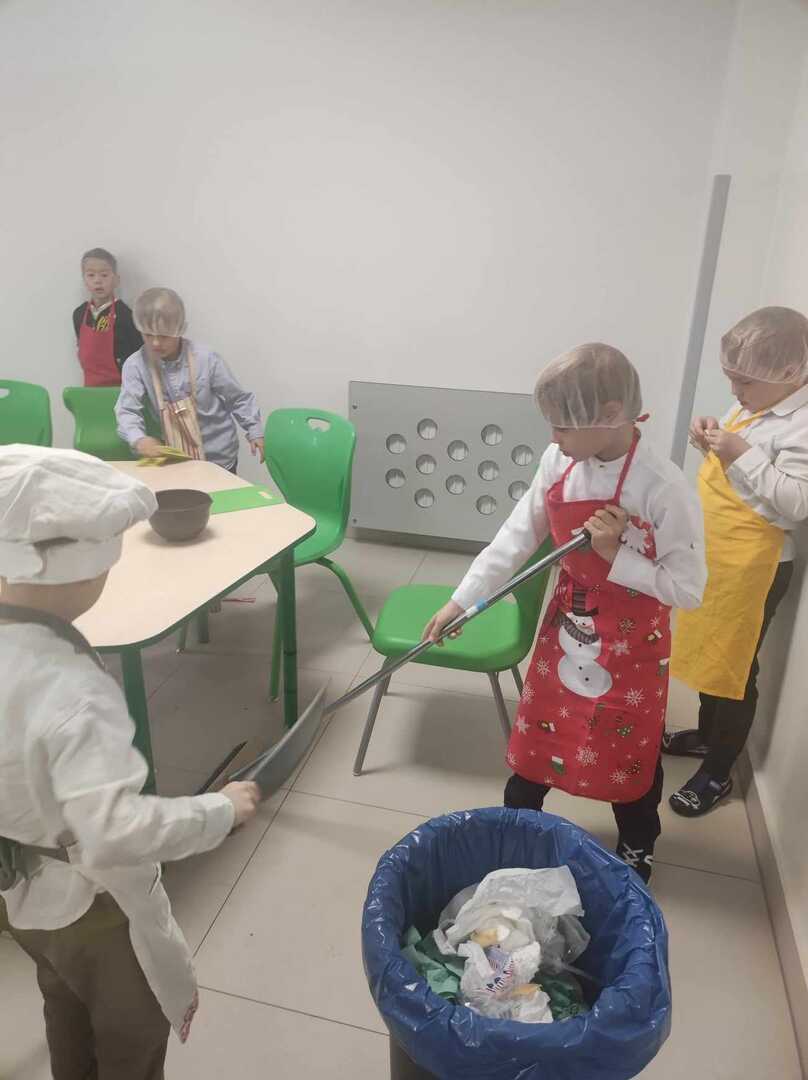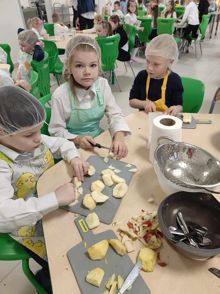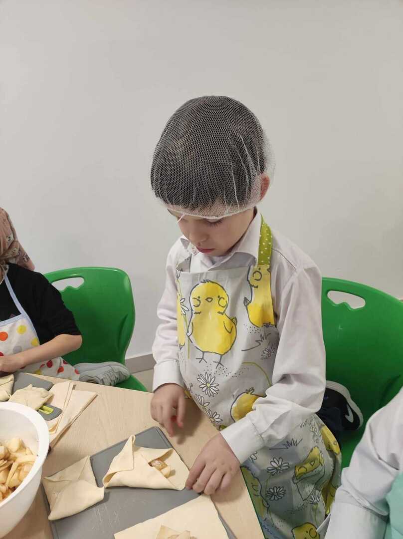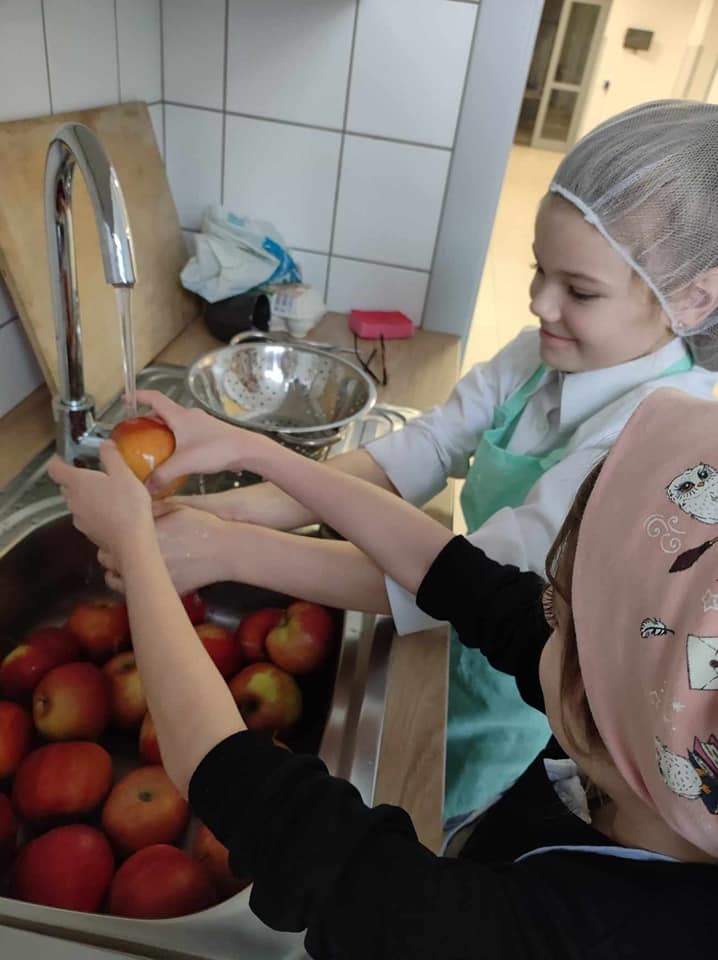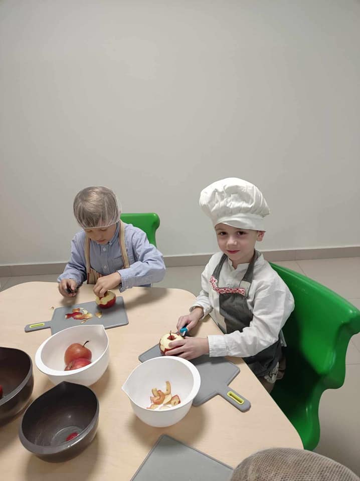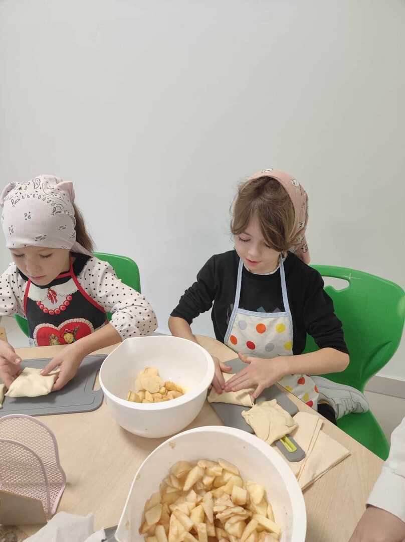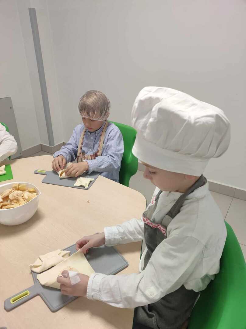 Kolejno dzieci zapoznawały się z różnymi składnikami, takimi jak ciasto francuskie, jabłka, cukier i cynamon. Wyjaśniono, skąd pochodzą i jak wpływają na smak ciasteczek. Następnie przystąpiono do przygotowywania ciasteczek.