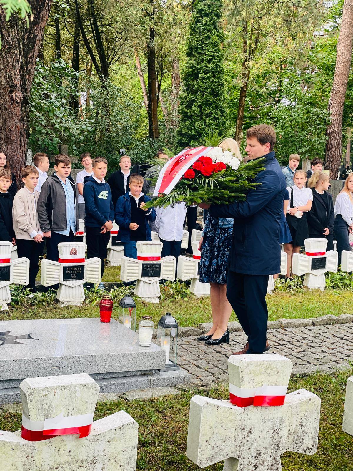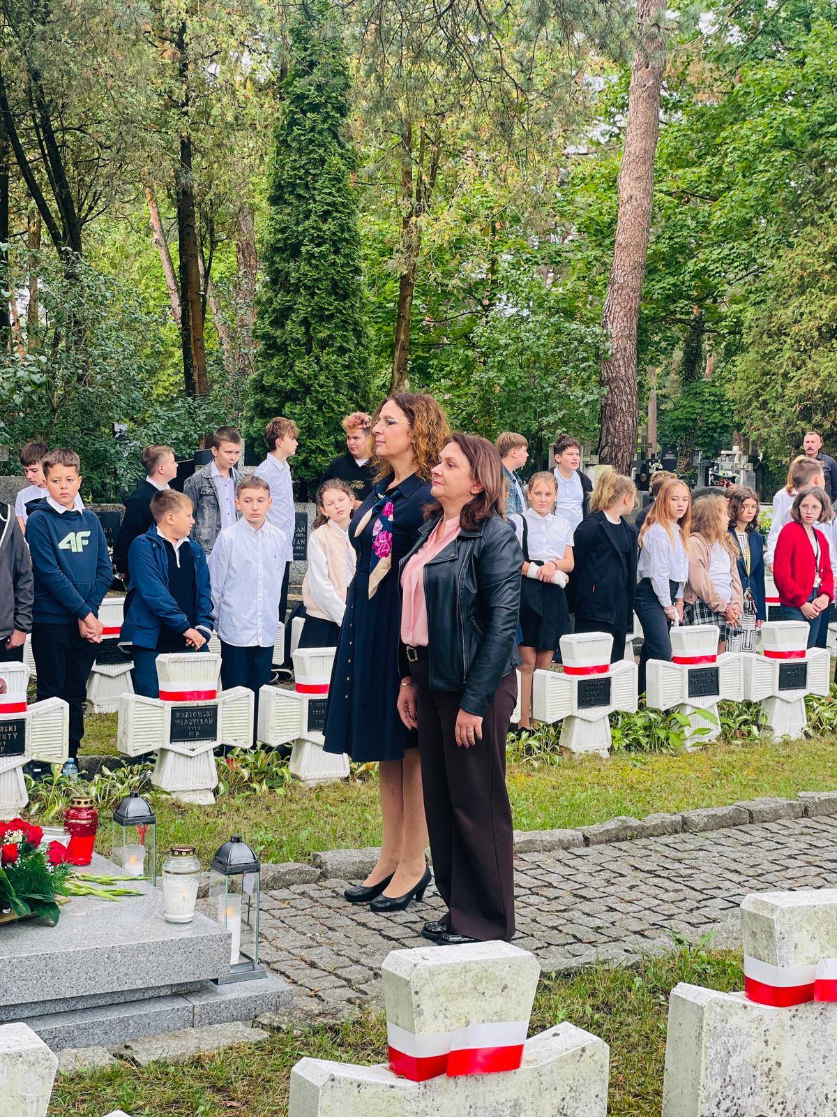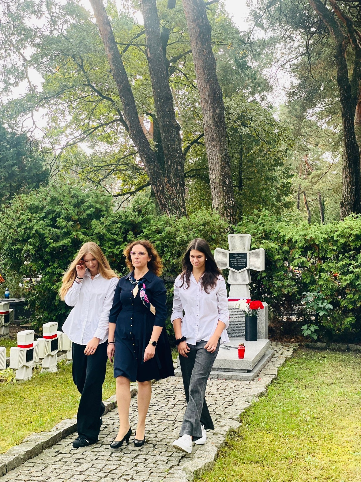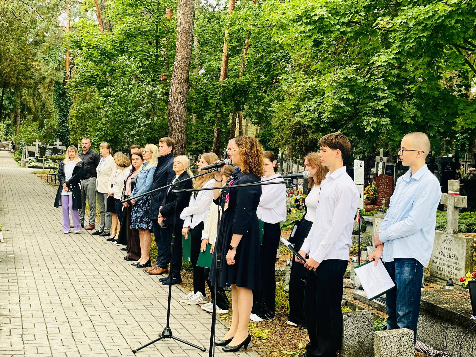 Obchody rozpoczęliśmy od uroczystości na cmentarzu, gdzie oddaliśmy hołd Generałowi Filipowiczowi w towarzystwie wyjątkowych gości: Prezydenta Miasta Otwocka, pana Jarosława Margielskiego, Przewodniczącej Komisji Oświaty, Kultury i Sportu, pani Joanny Chmielewskiej a także Dyrektor Oświaty, pani Hanny Skrzypczak. Wśród nas był również pan Artur Piętka oraz przedstawicielka rodziny generała, pani Joanna Filipowicz, która dzieliła z nami ten wzruszający moment w towarzystwie naszych uczniów.
