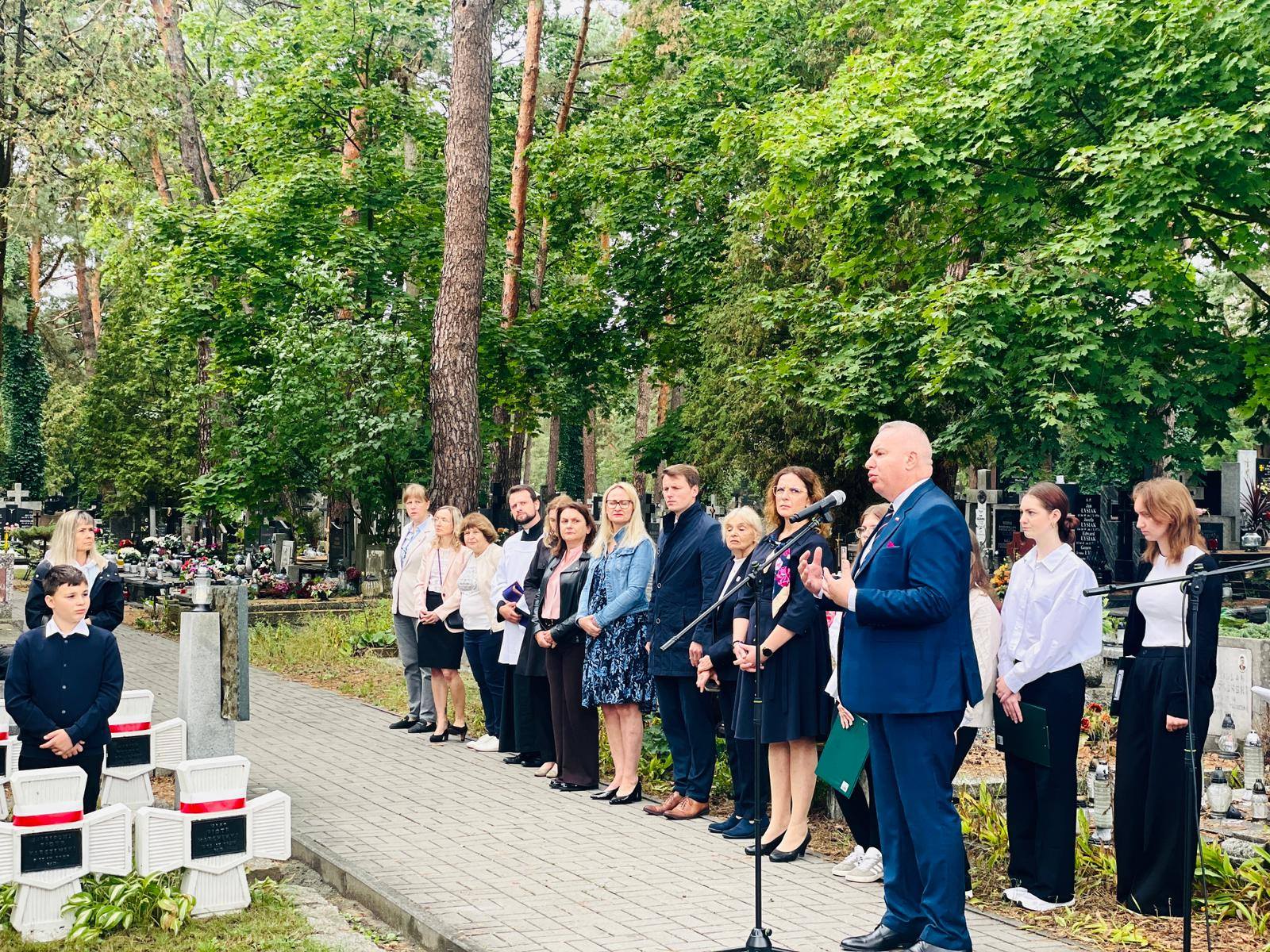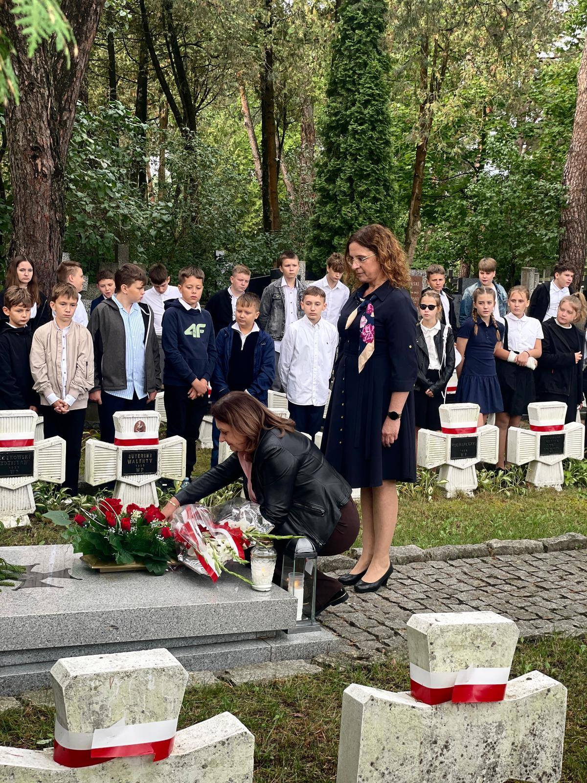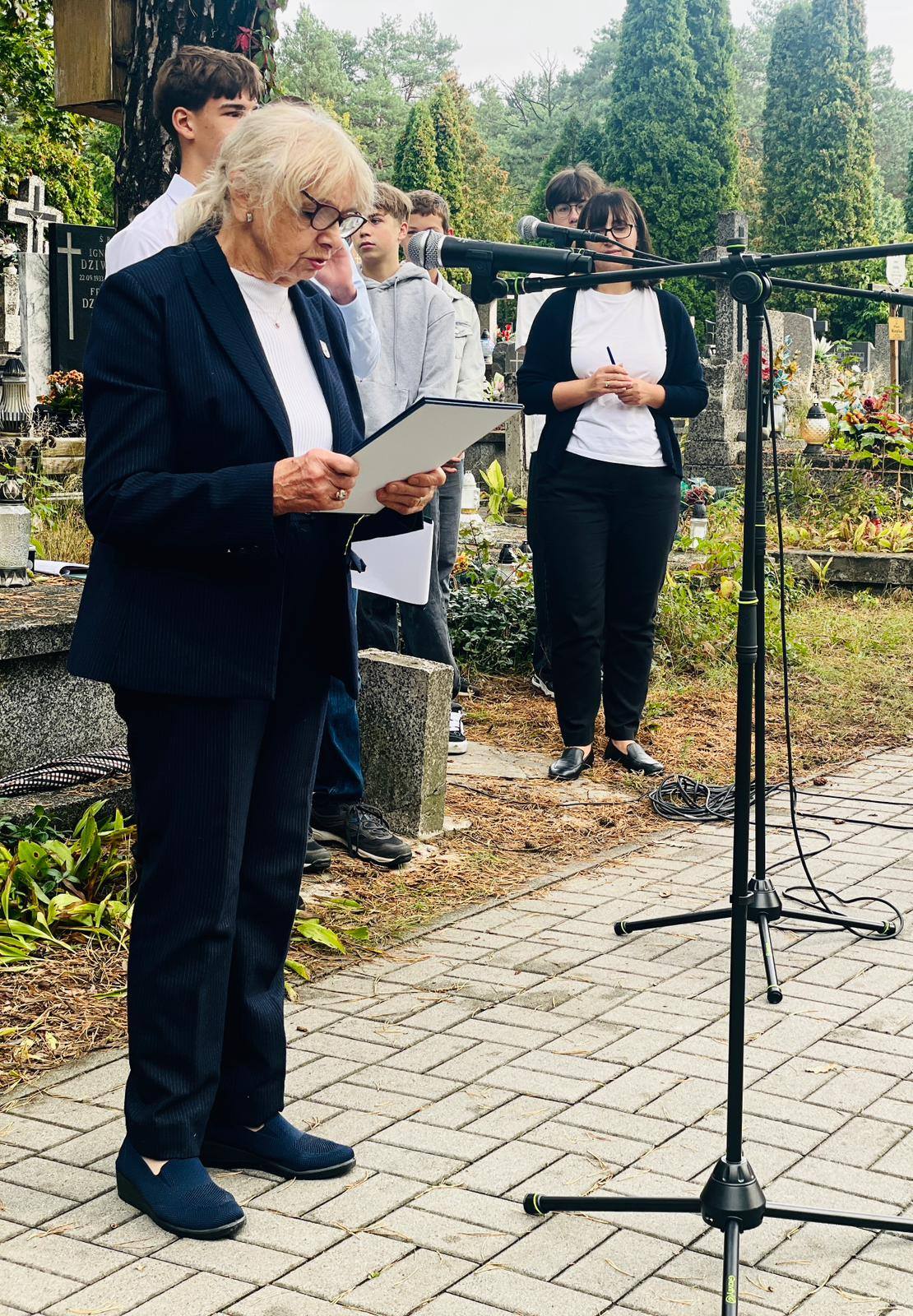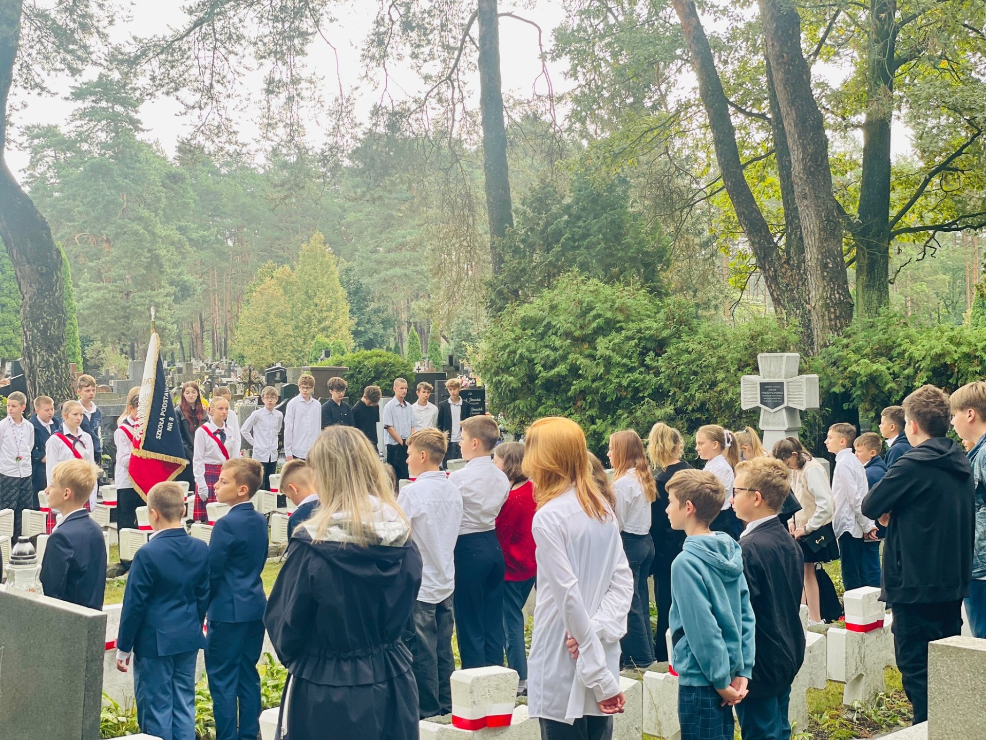 Obchody rozpoczęliśmy od uroczystości na cmentarzu, gdzie oddaliśmy hołd Generałowi Filipowiczowi w towarzystwie wyjątkowych gości: Prezydenta Miasta Otwocka, pana Jarosława Margielskiego, Przewodniczącej Komisji Oświaty, Kultury i Sportu, pani Joanny Chmielewskiej a także Dyrektor Oświaty, pani Hanny Skrzypczak. Wśród nas był również pan Artur Piętka oraz przedstawicielka rodziny generała, pani Joanna Filipowicz, która dzieliła z nami ten wzruszający moment w towarzystwie naszych uczniów.