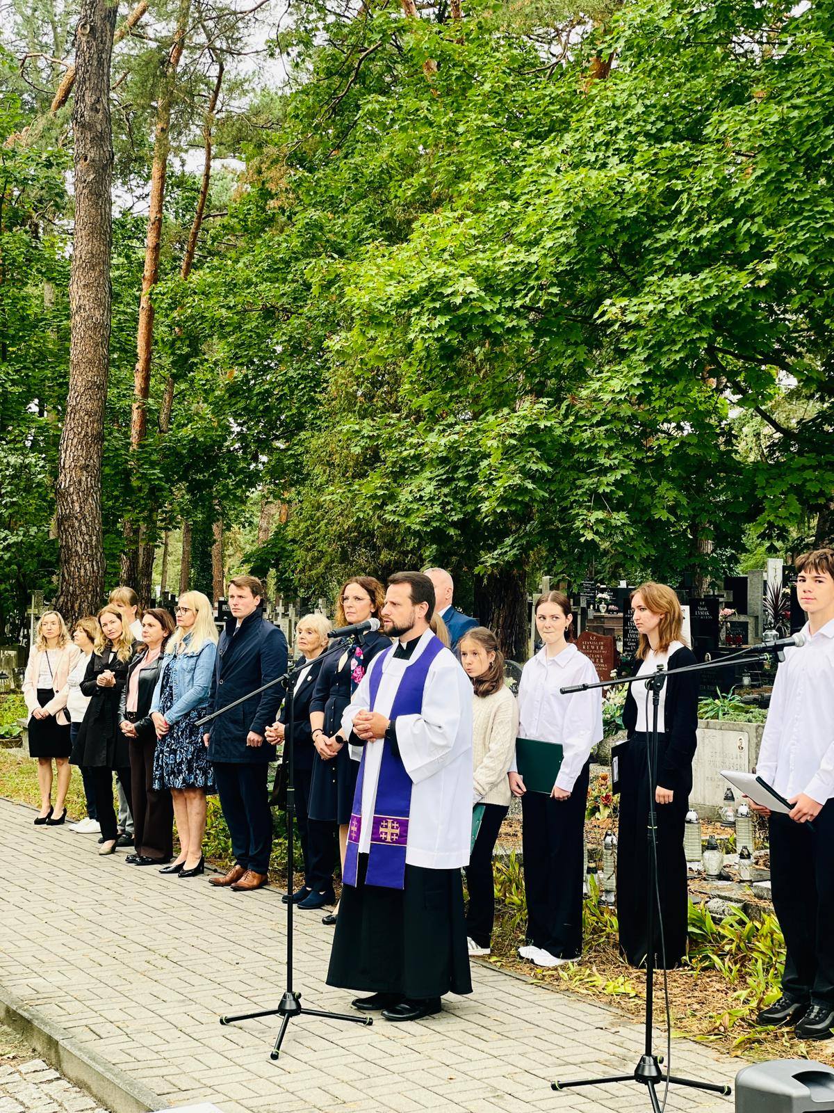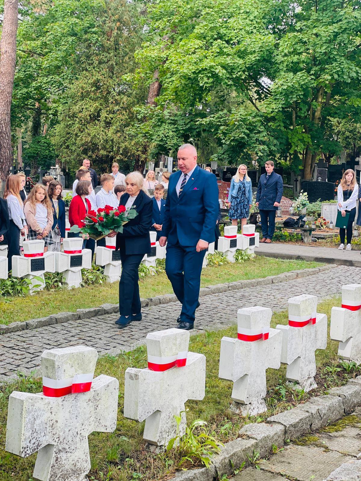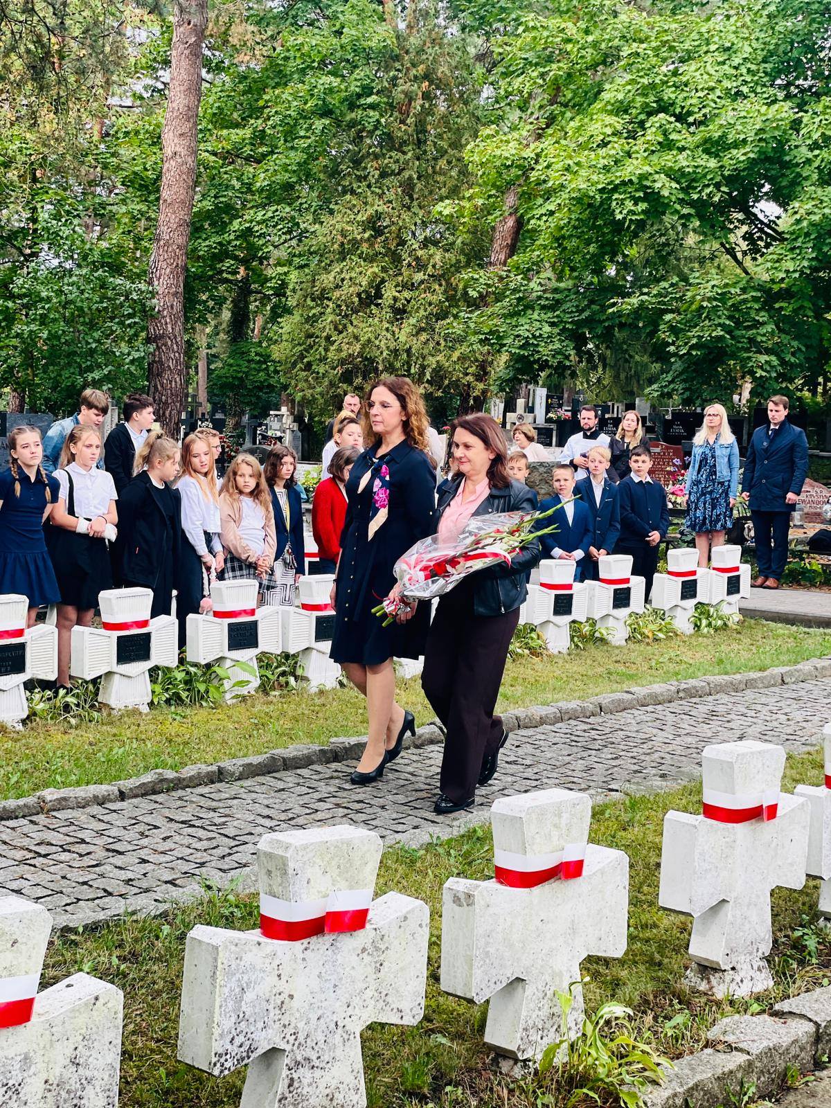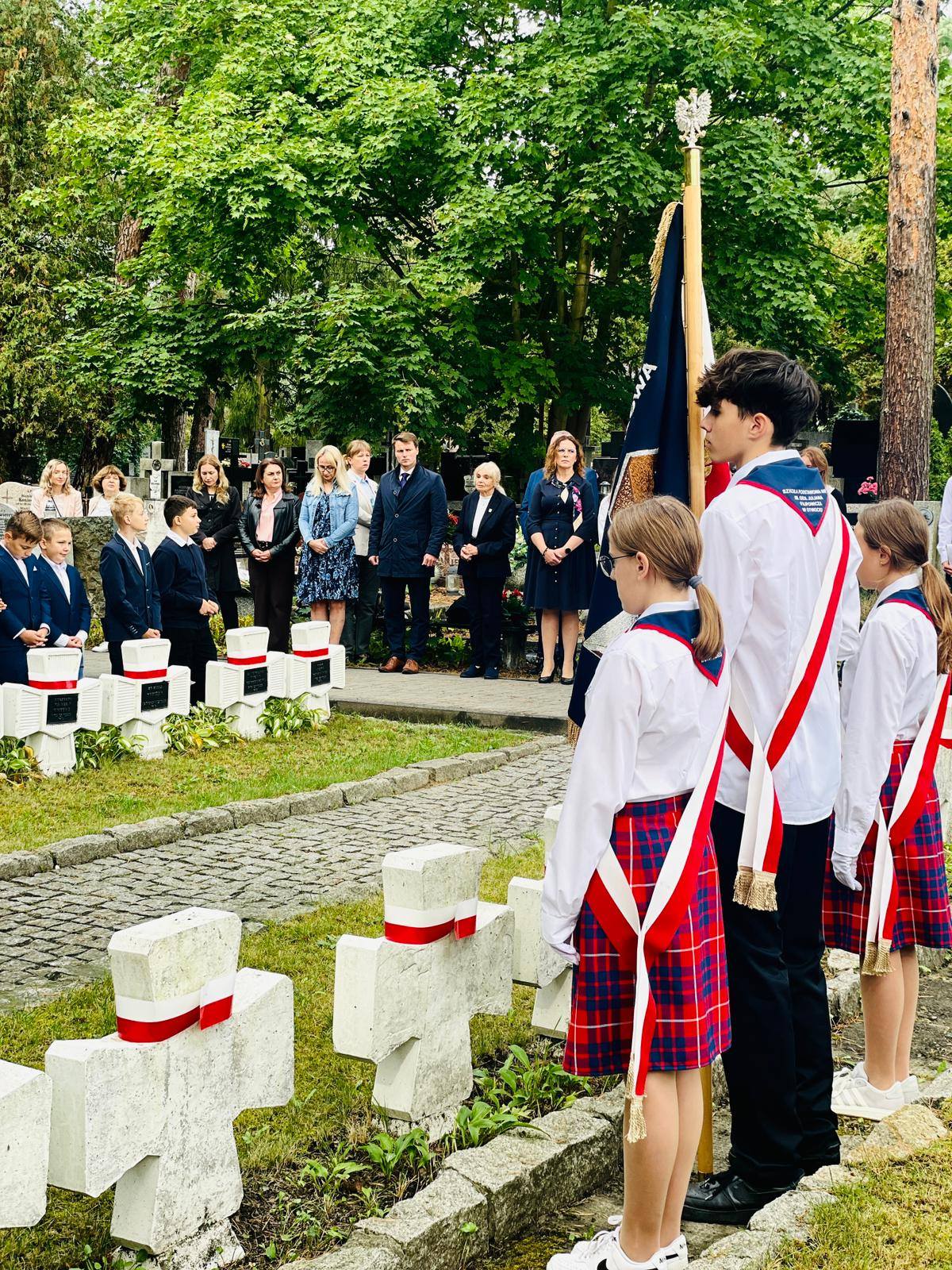Obchody rozpoczęliśmy od uroczystości na cmentarzu, gdzie oddaliśmy hołd Generałowi Filipowiczowi w towarzystwie wyjątkowych gości: Prezydenta Miasta Otwocka, pana Jarosława Margielskiego, Przewodniczącej Komisji Oświaty, Kultury i Sportu, pani Joanny Chmielewskiej a także Dyrektor Oświaty, pani Hanny Skrzypczak. Wśród nas był również pan Artur Piętka oraz przedstawicielka rodziny generała, pani Joanna Filipowicz, która dzieliła z nami ten wzruszający moment w towarzystwie naszych uczniów.
