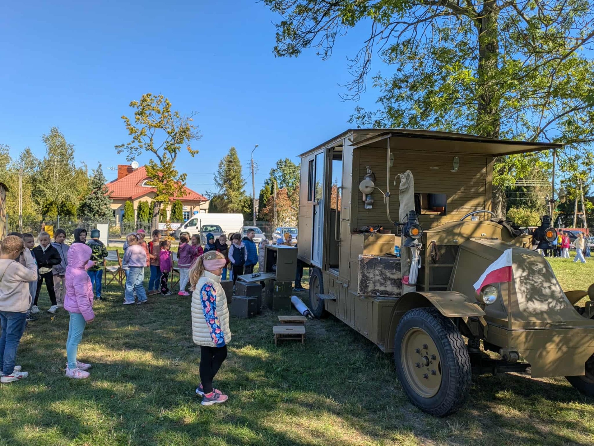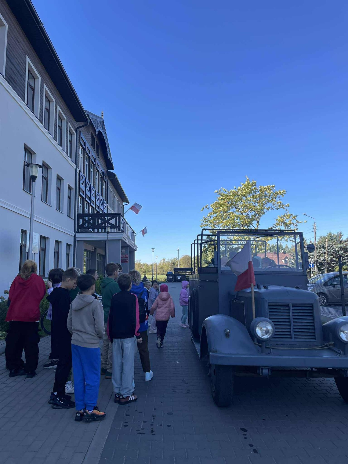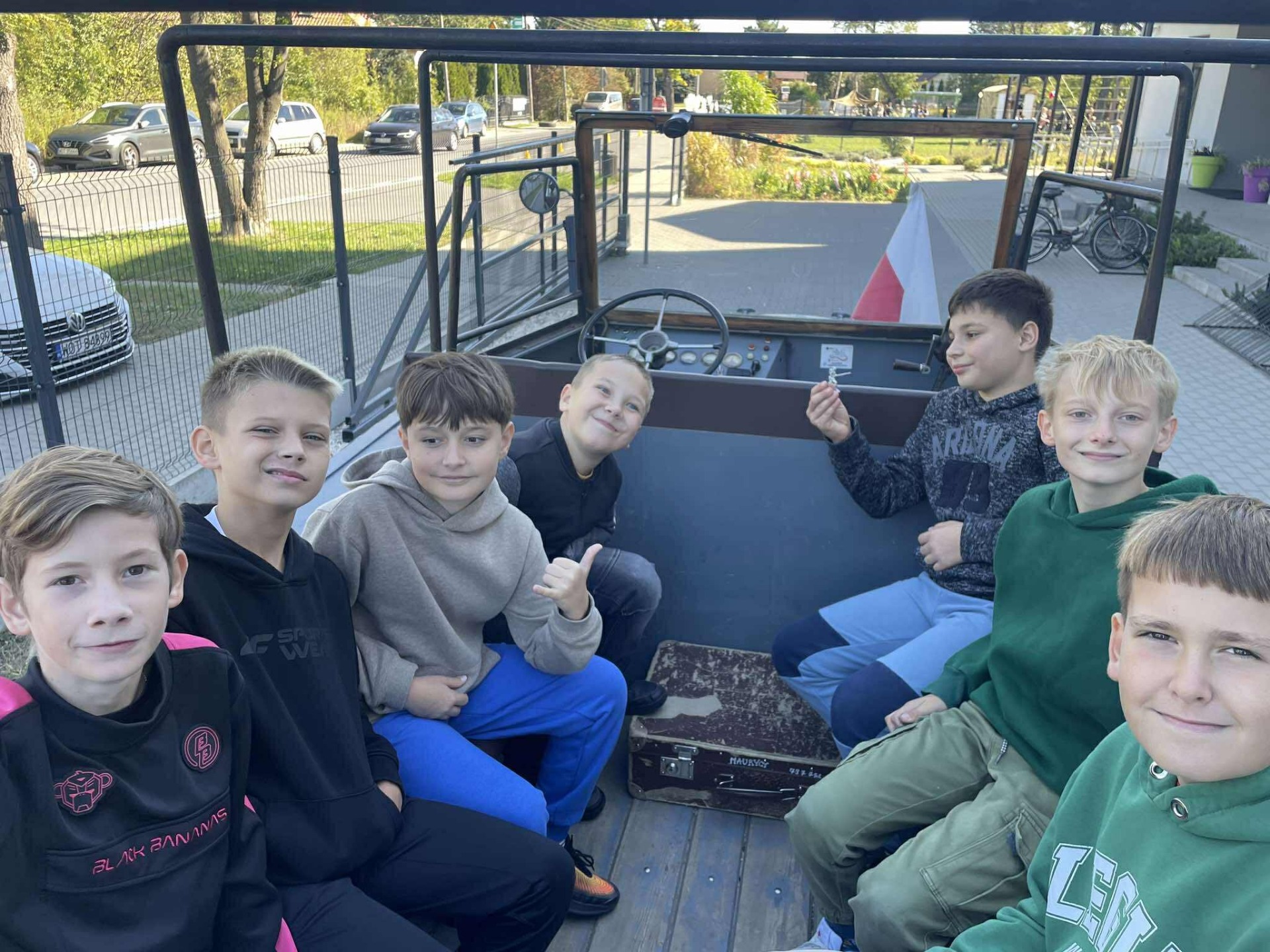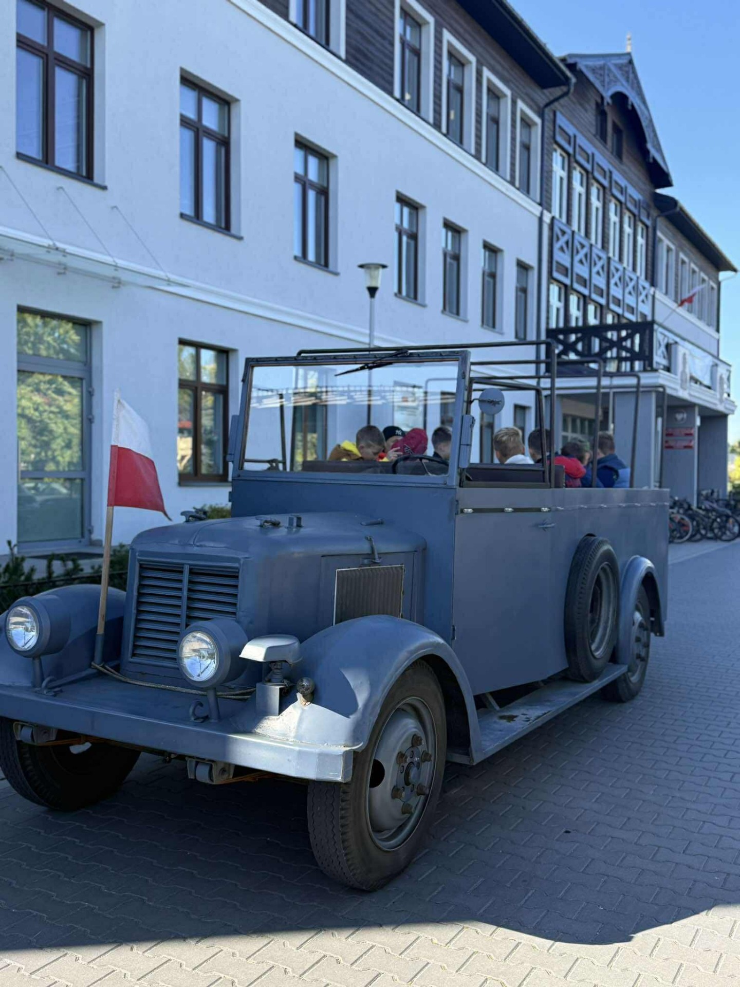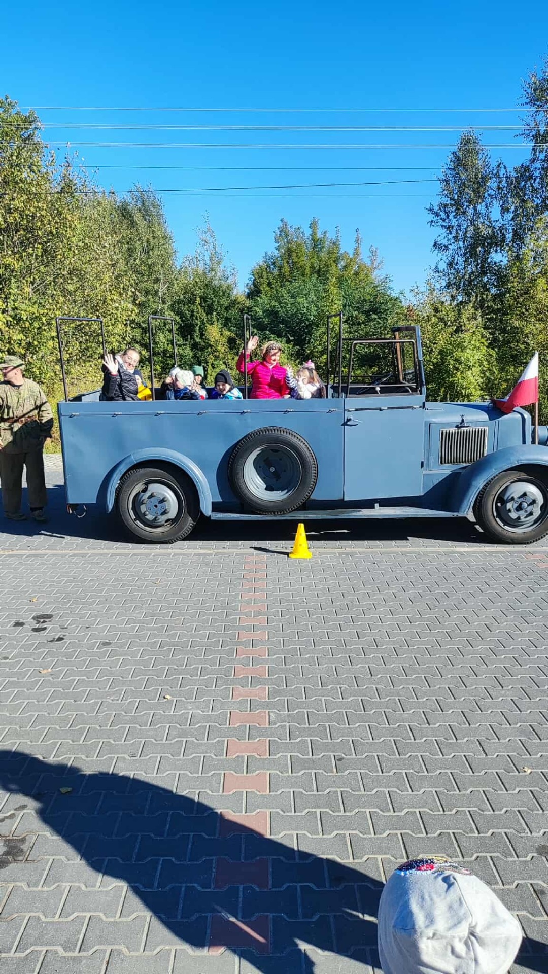 Na zakończenie, przejazd wojskową ciężarówką „Phanomen Granit” – niemieckim pojazdem zdobytym przez powstańców warszawskich! To był prawdziwy hit! Uczniowie mieli okazję poczuć się jak w czasie II wojny światowej, siedząc w tej historycznej maszynie.