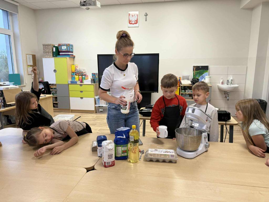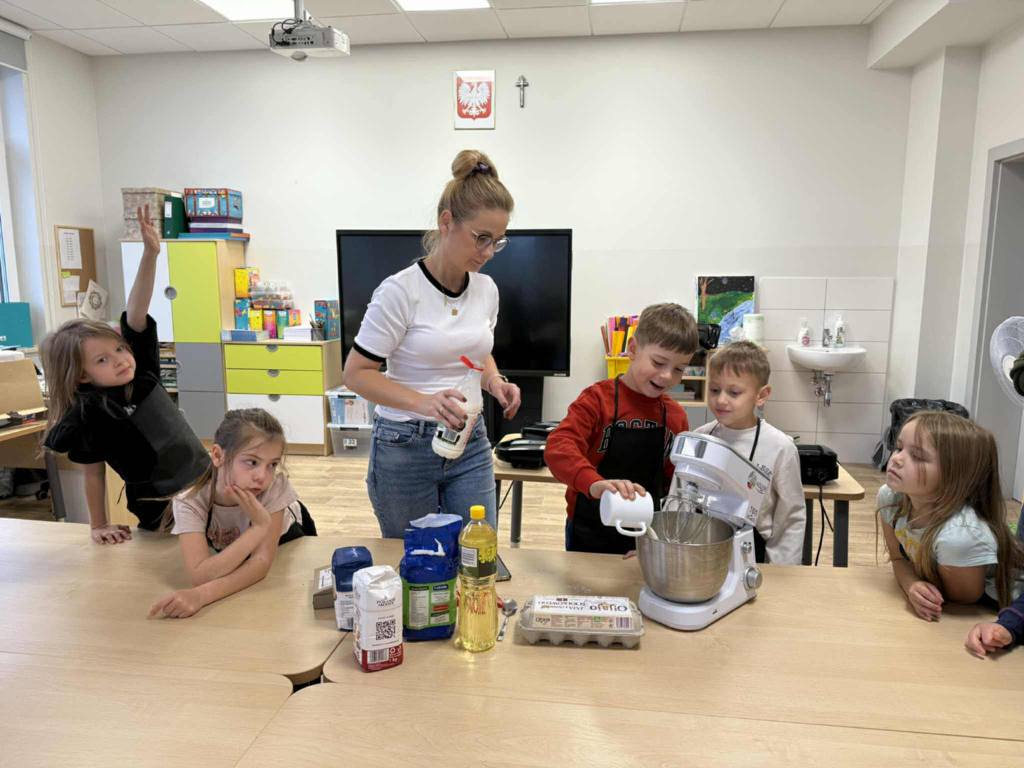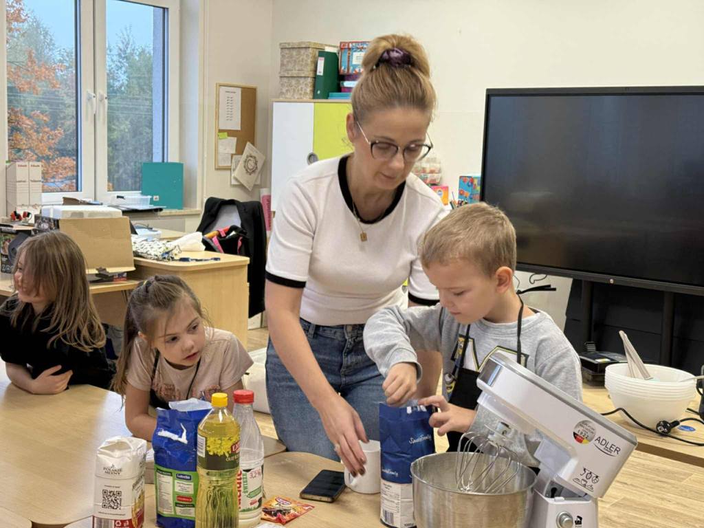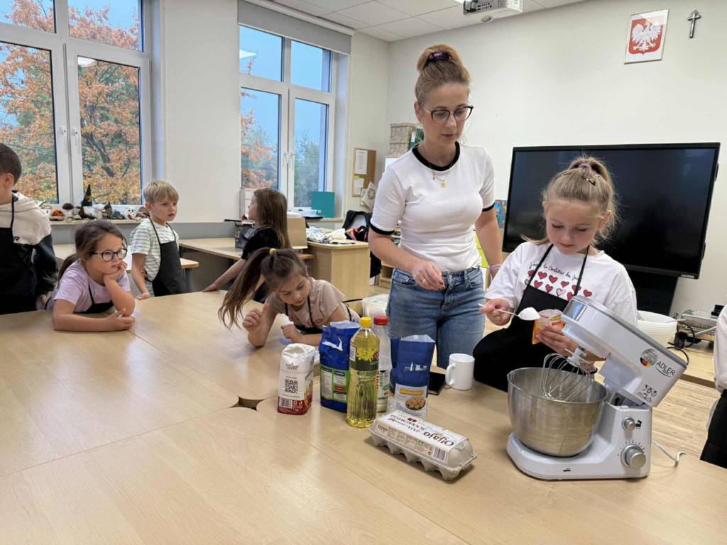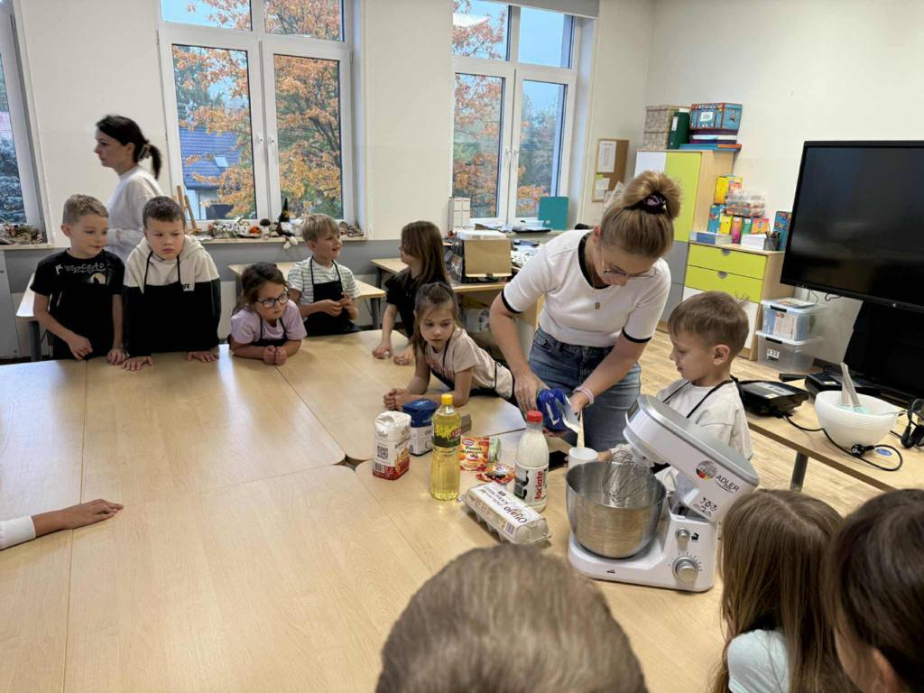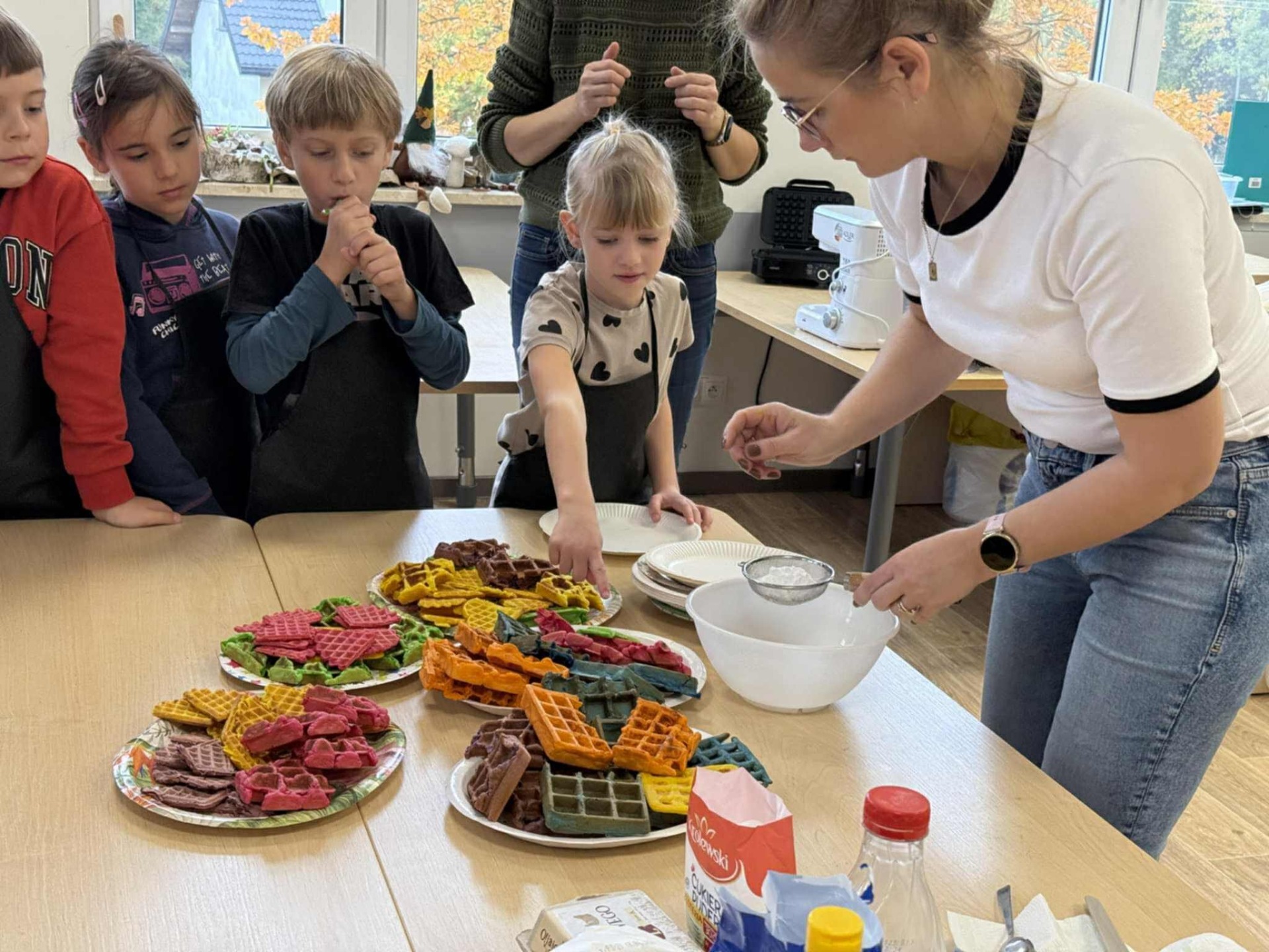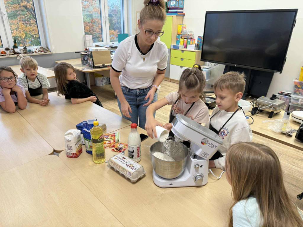 Następnie z wielkim zapałem zabrali się do pracy: odmierzali składniki, wsypywali do miski i mieszali używając robota kuchennego. Upieczone gofry były przepyszne!!!