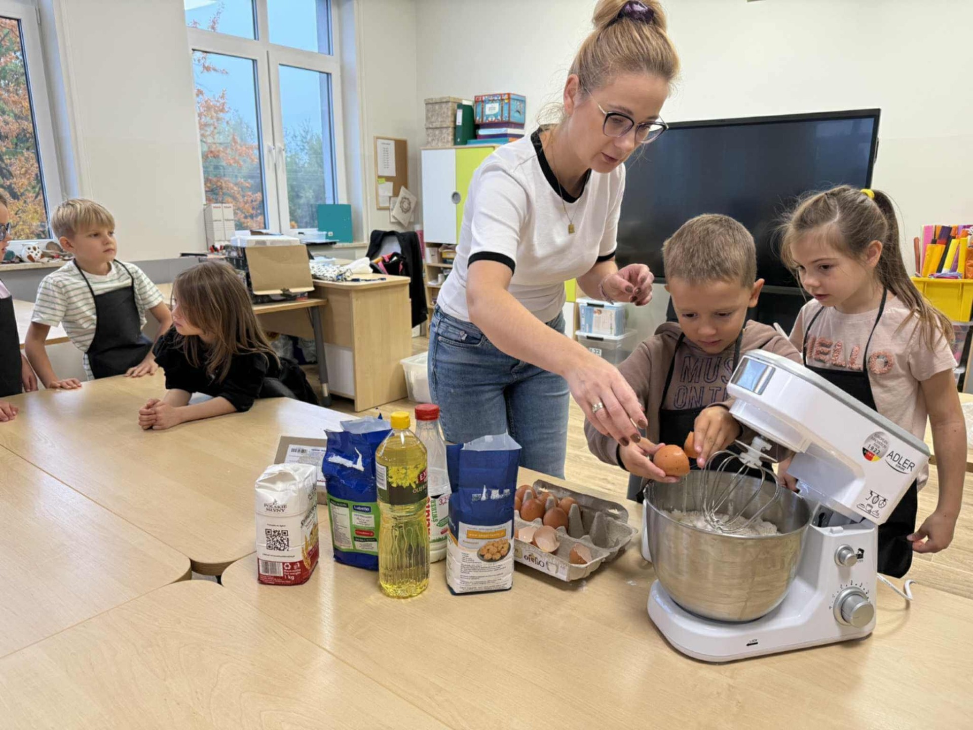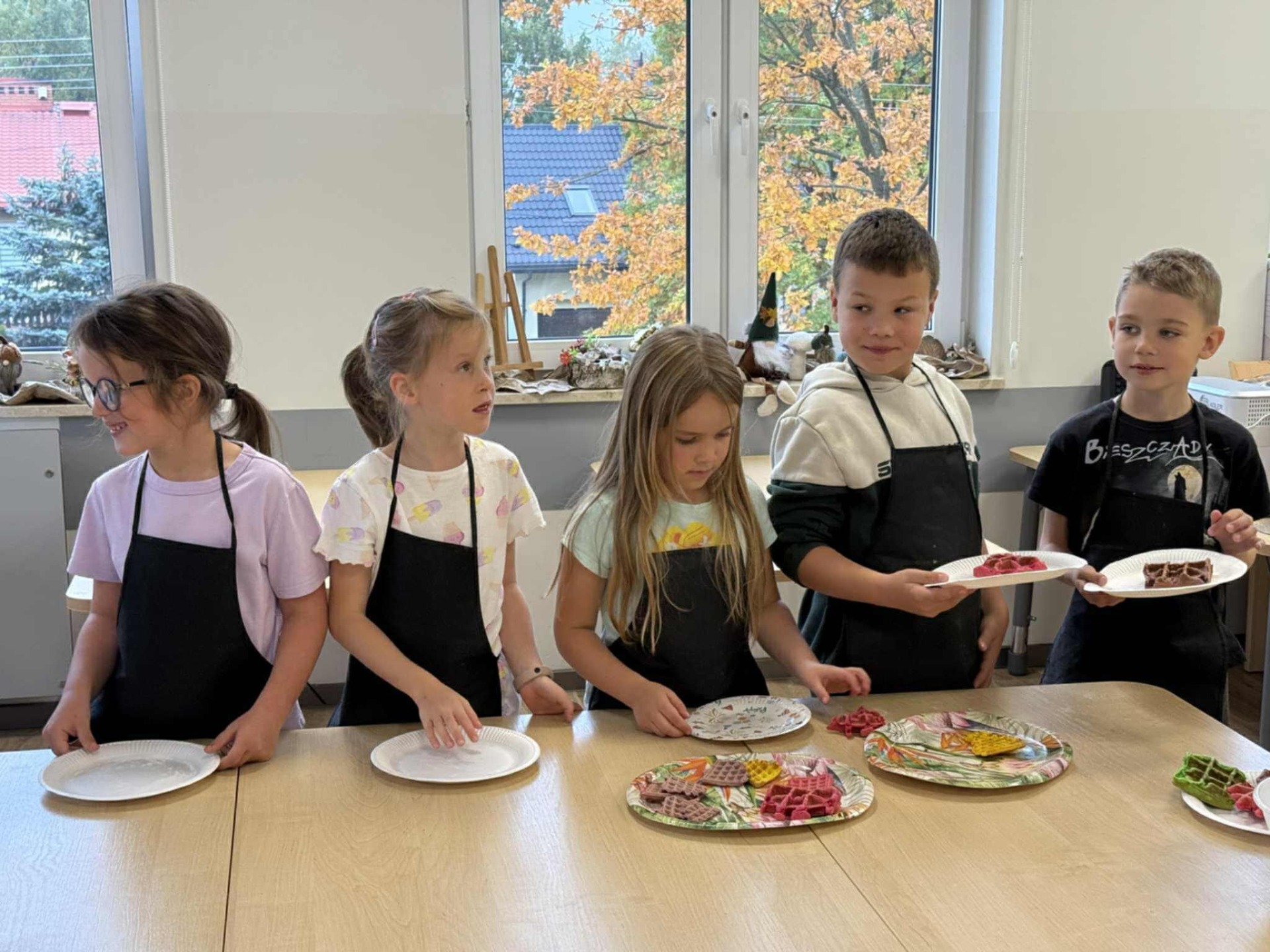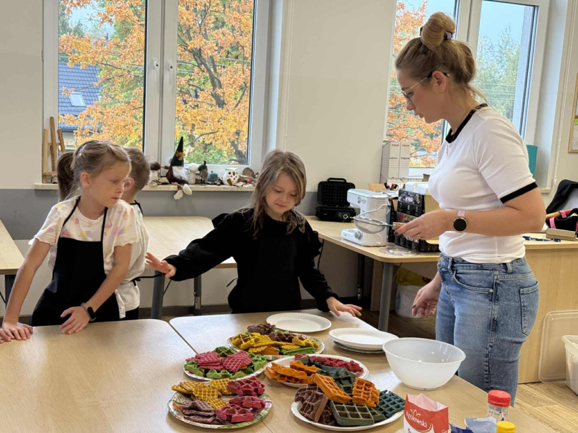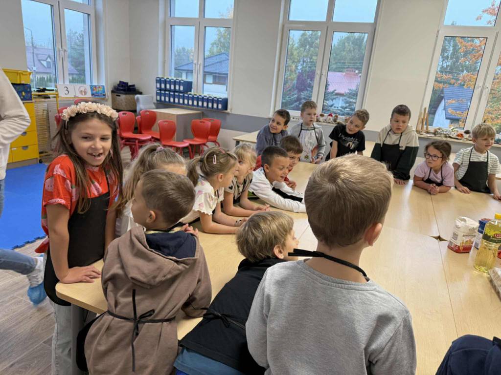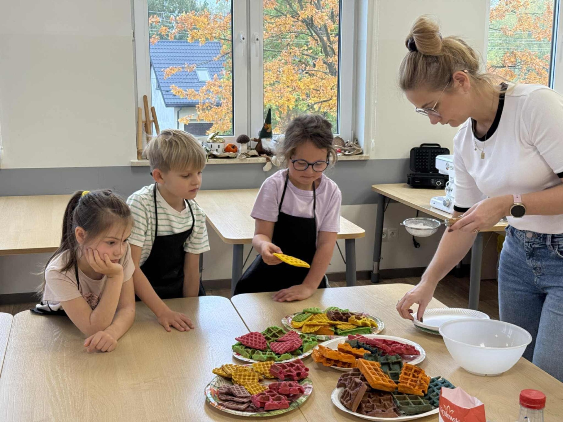 Następnie z wielkim zapałem zabrali się do pracy: odmierzali składniki, wsypywali do miski i mieszali używając robota kuchennego. Upieczone gofry były przepyszne!!!