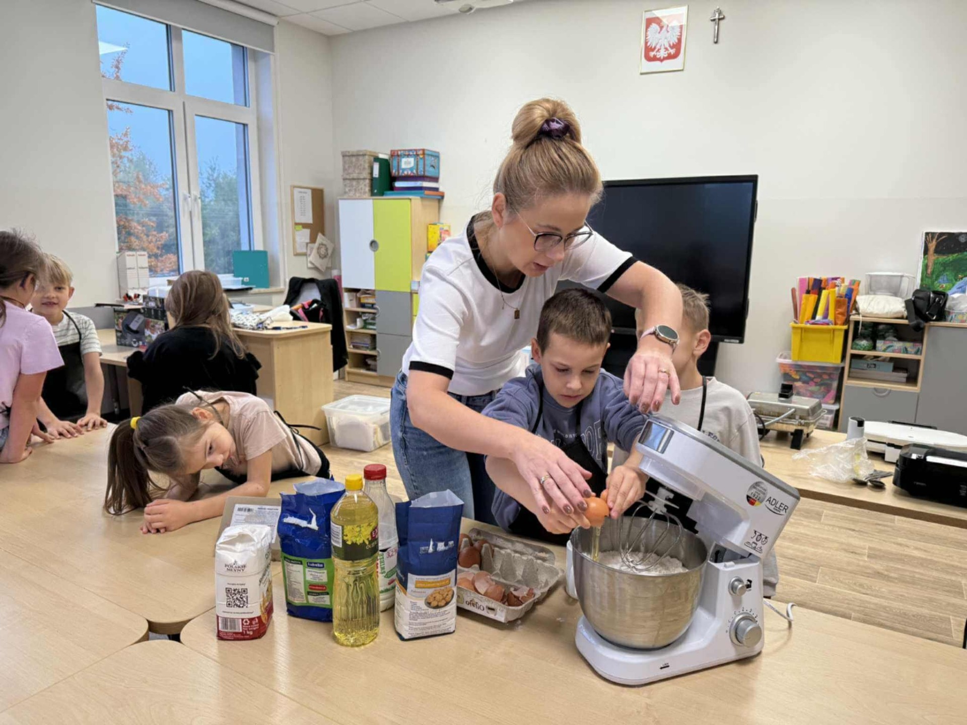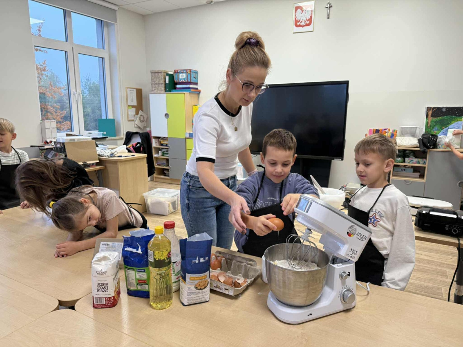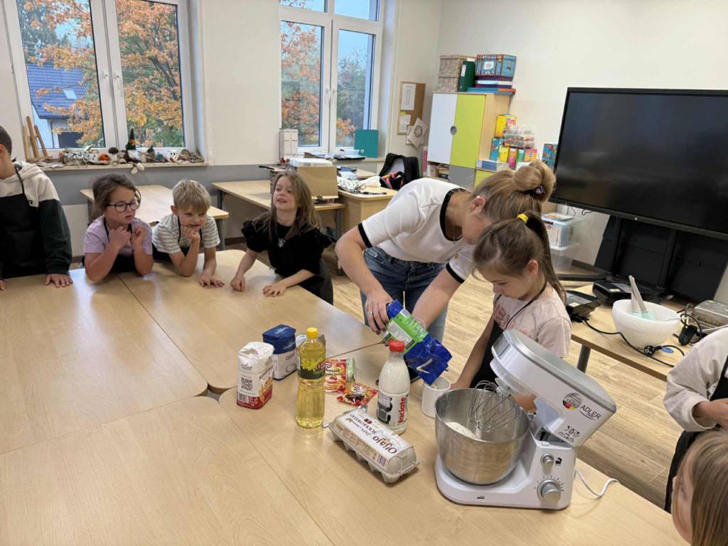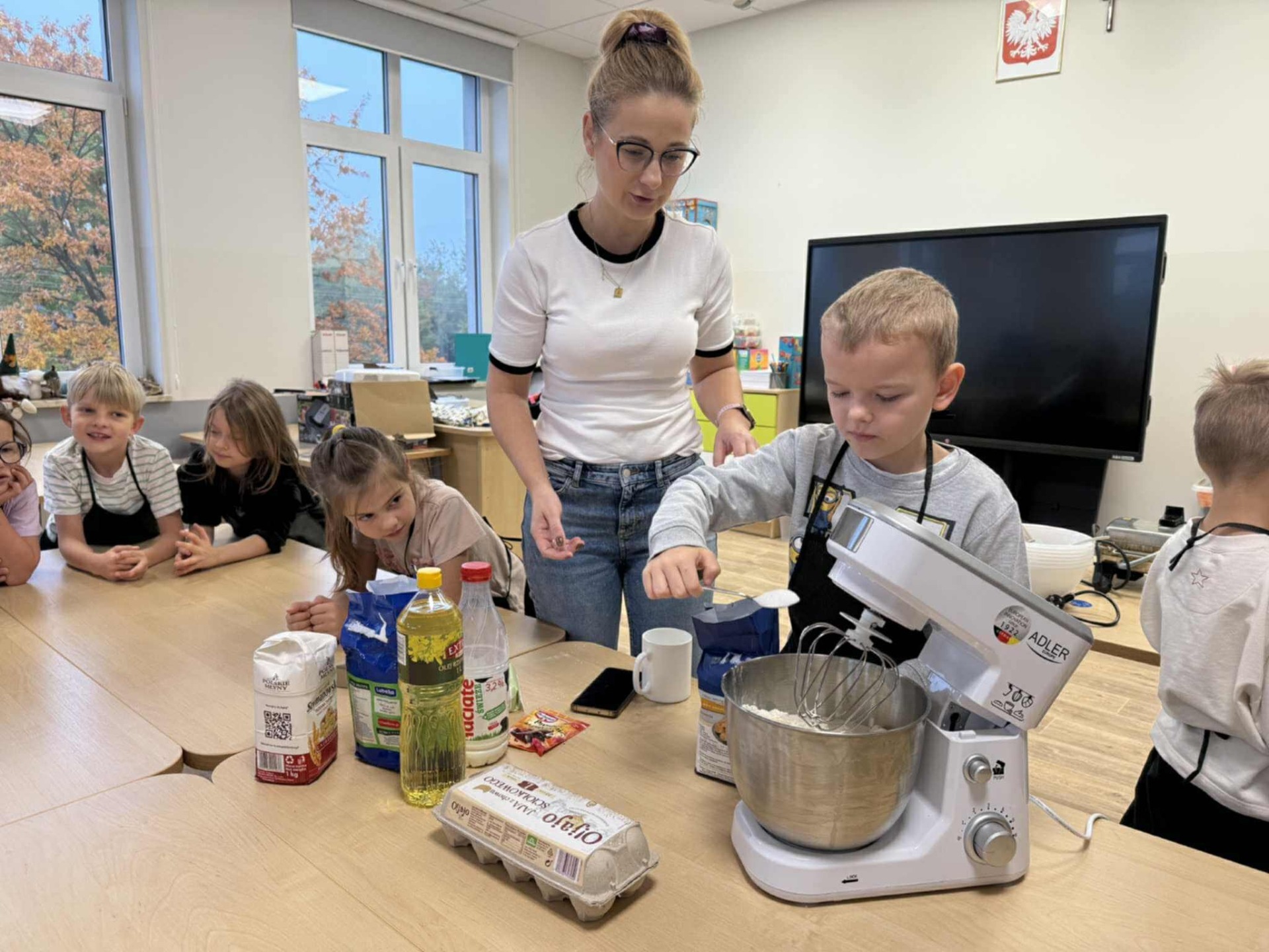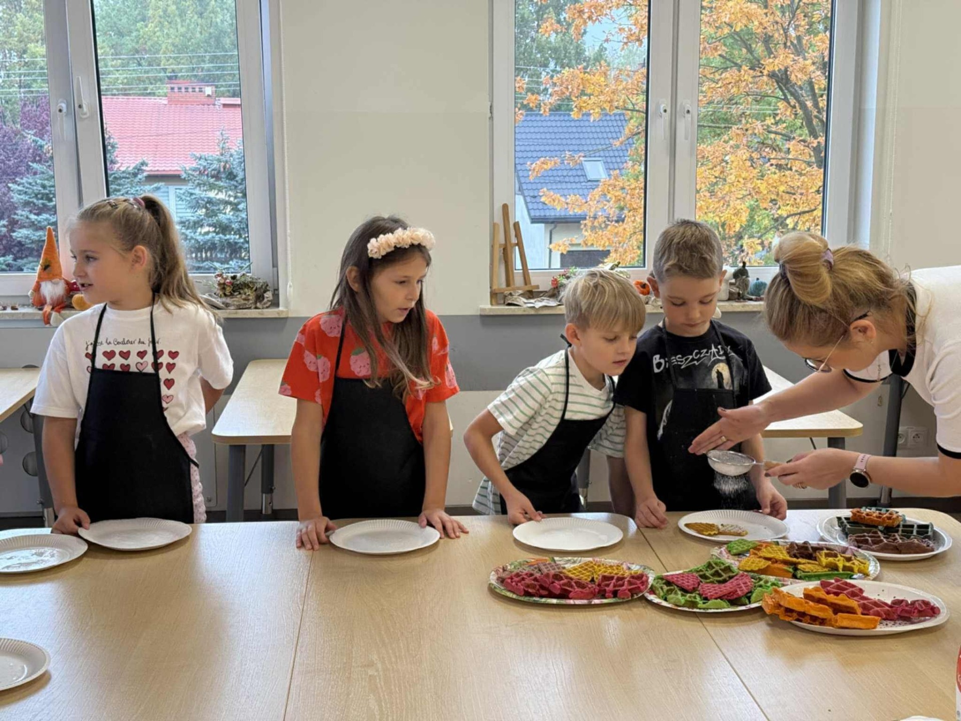 Następnie z wielkim zapałem zabrali się do pracy: odmierzali składniki, wsypywali do miski i mieszali używając robota kuchennego. Upieczone gofry były przepyszne!!!