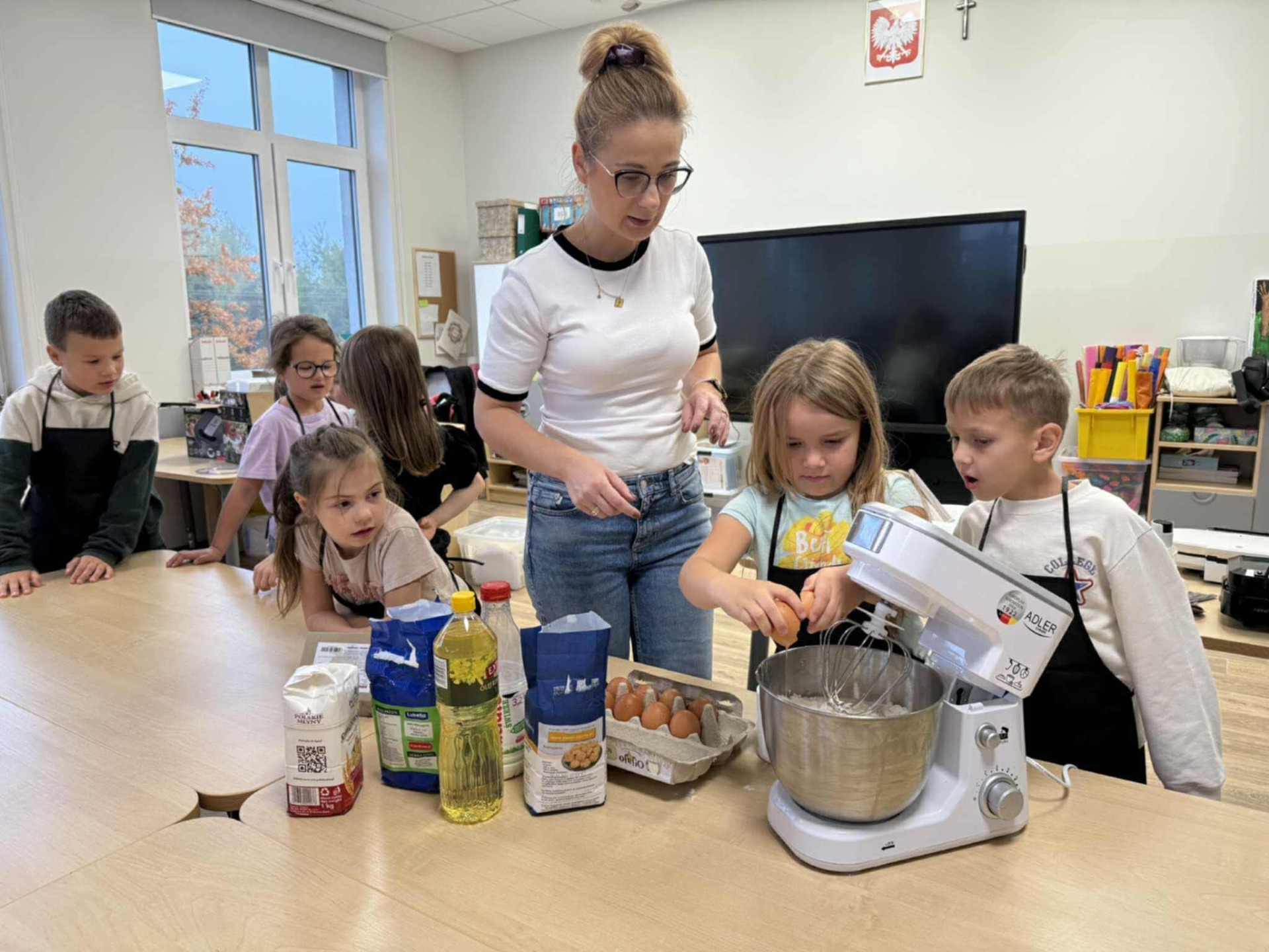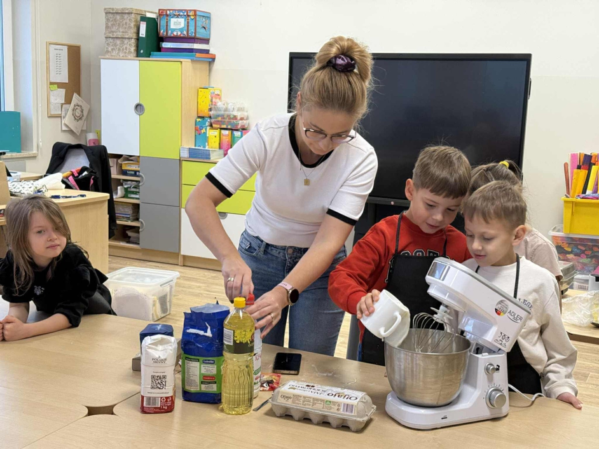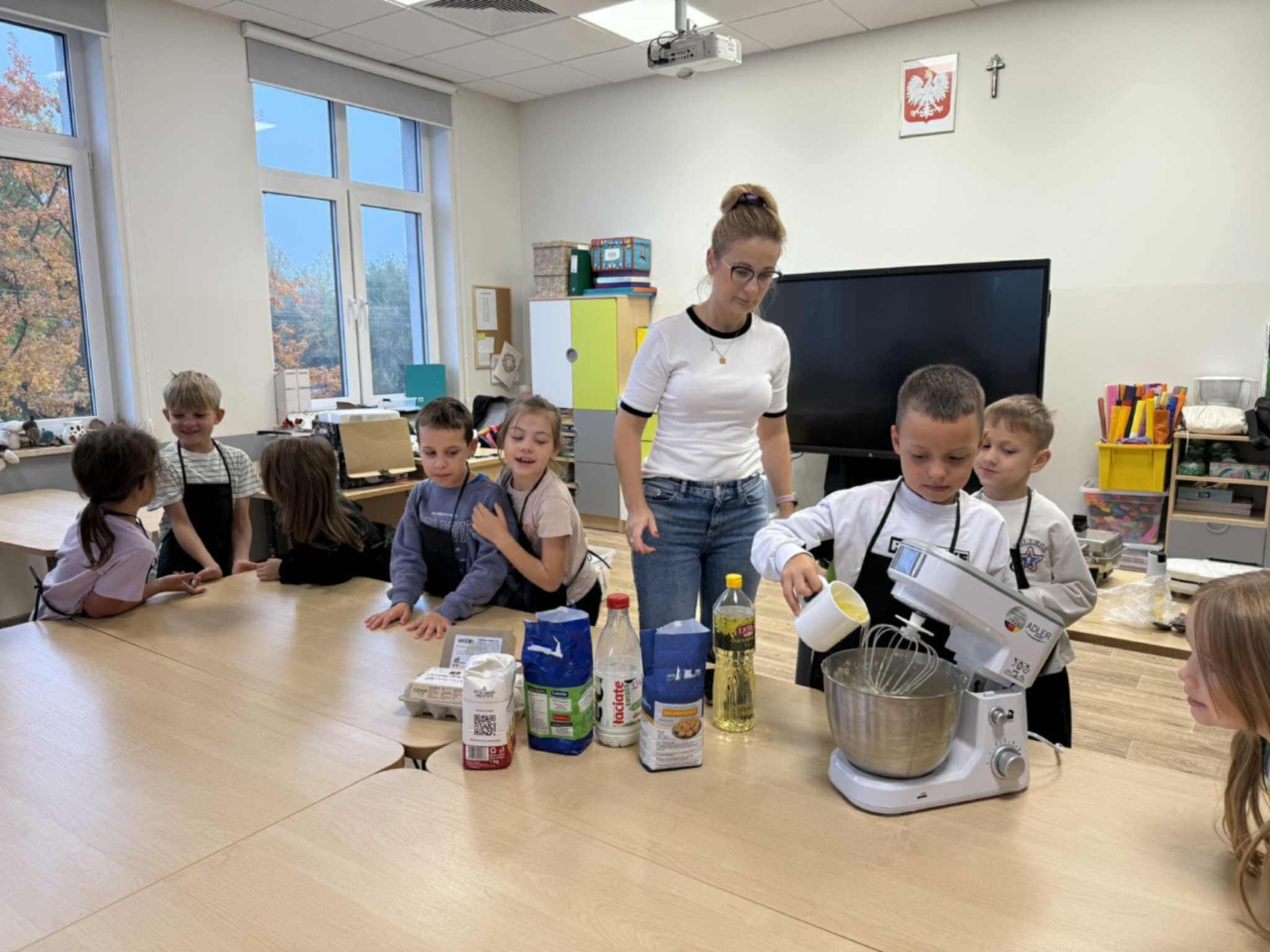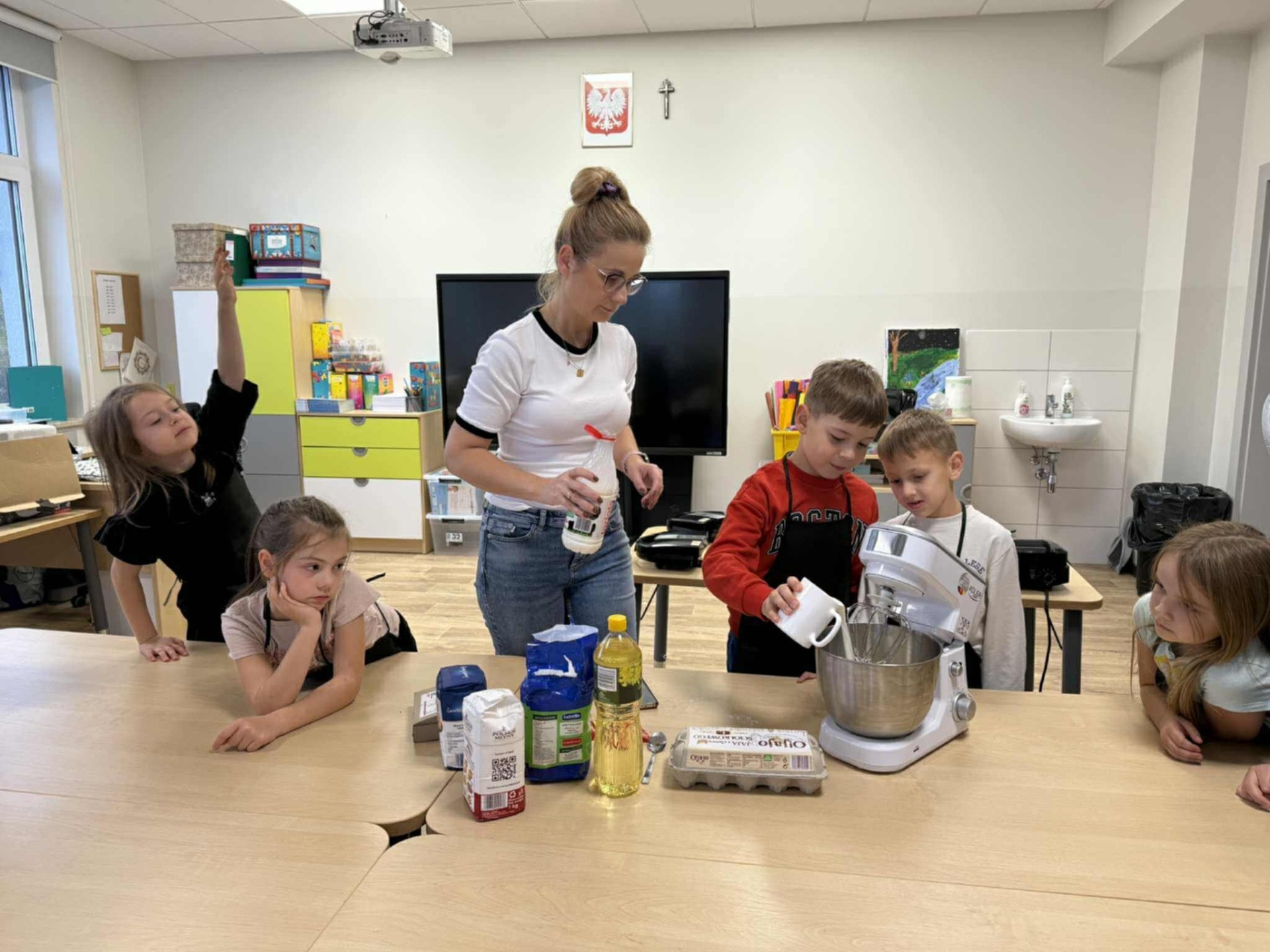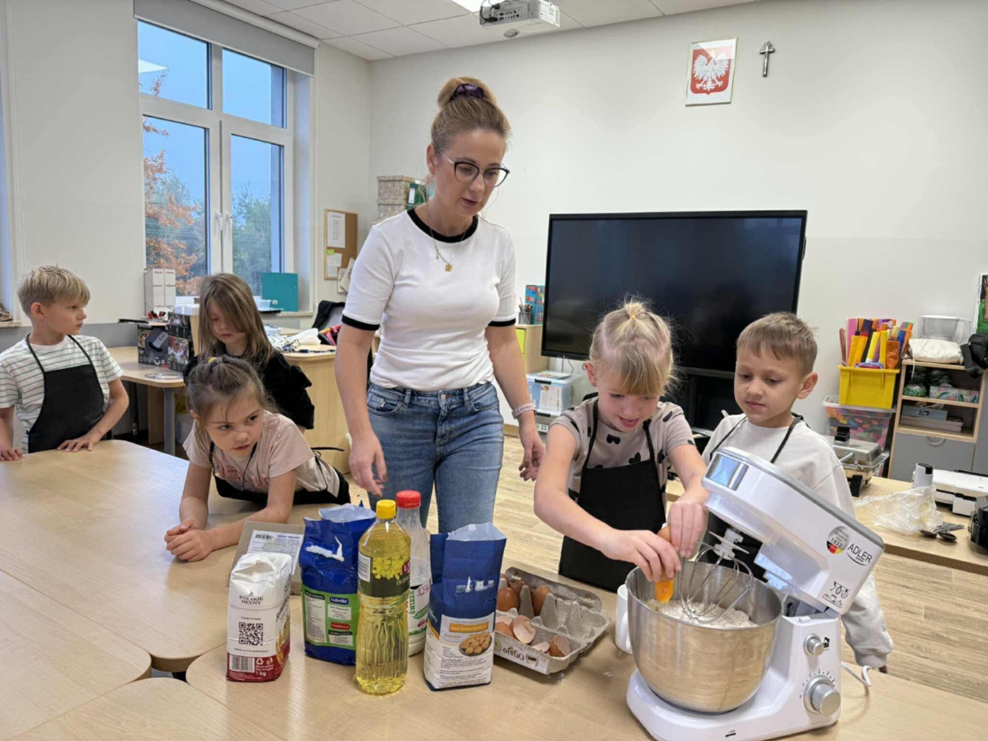 Następnie z wielkim zapałem zabrali się do pracy: odmierzali składniki, wsypywali do miski i mieszali używając robota kuchennego. Upieczone gofry były przepyszne!!!