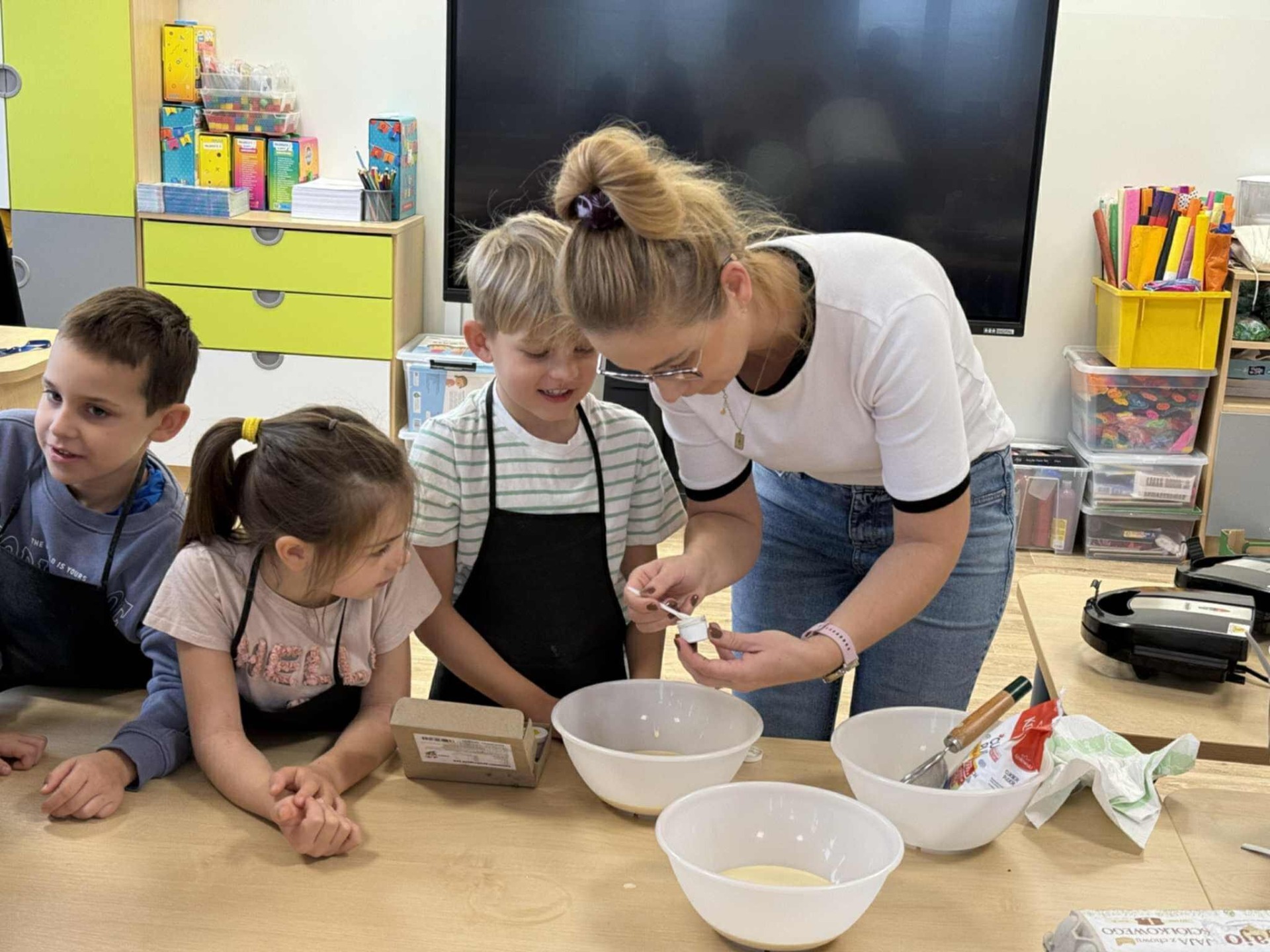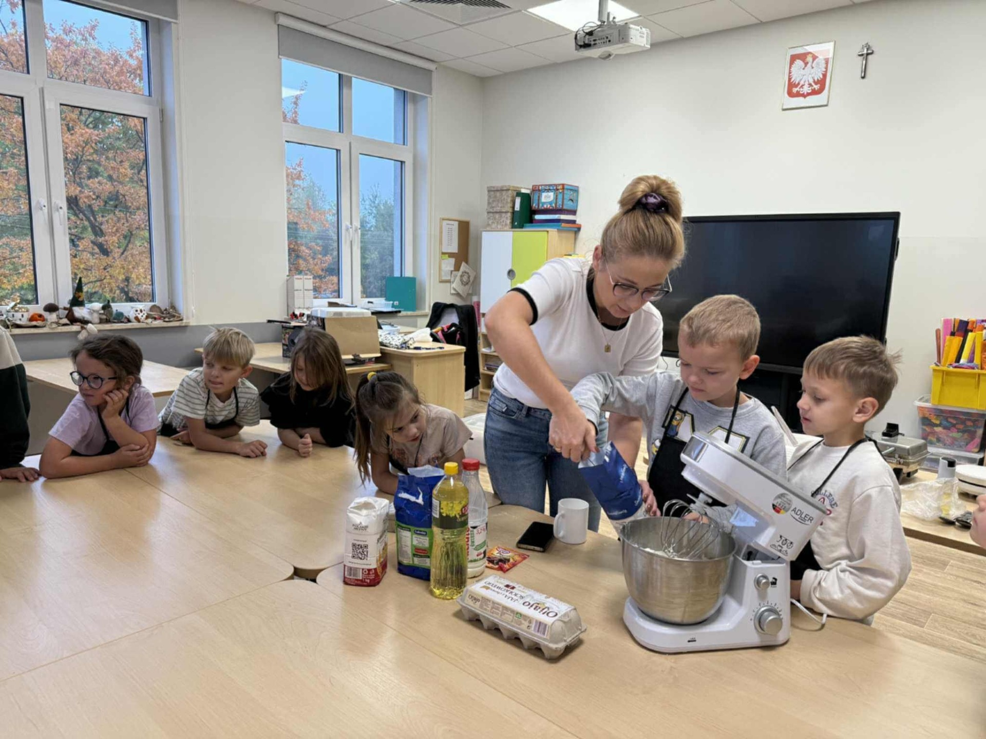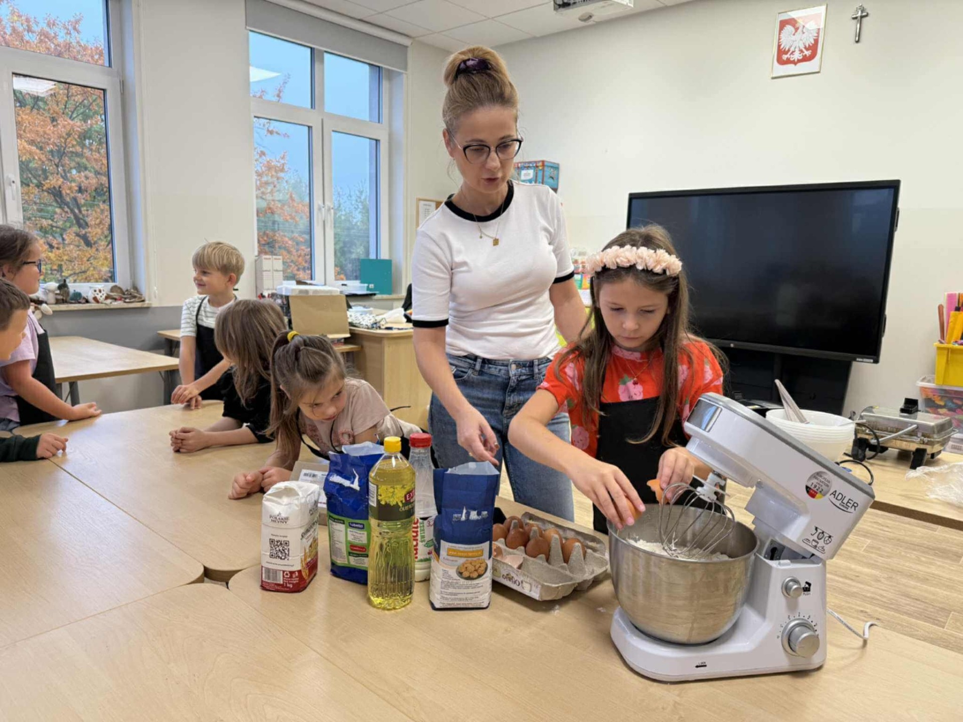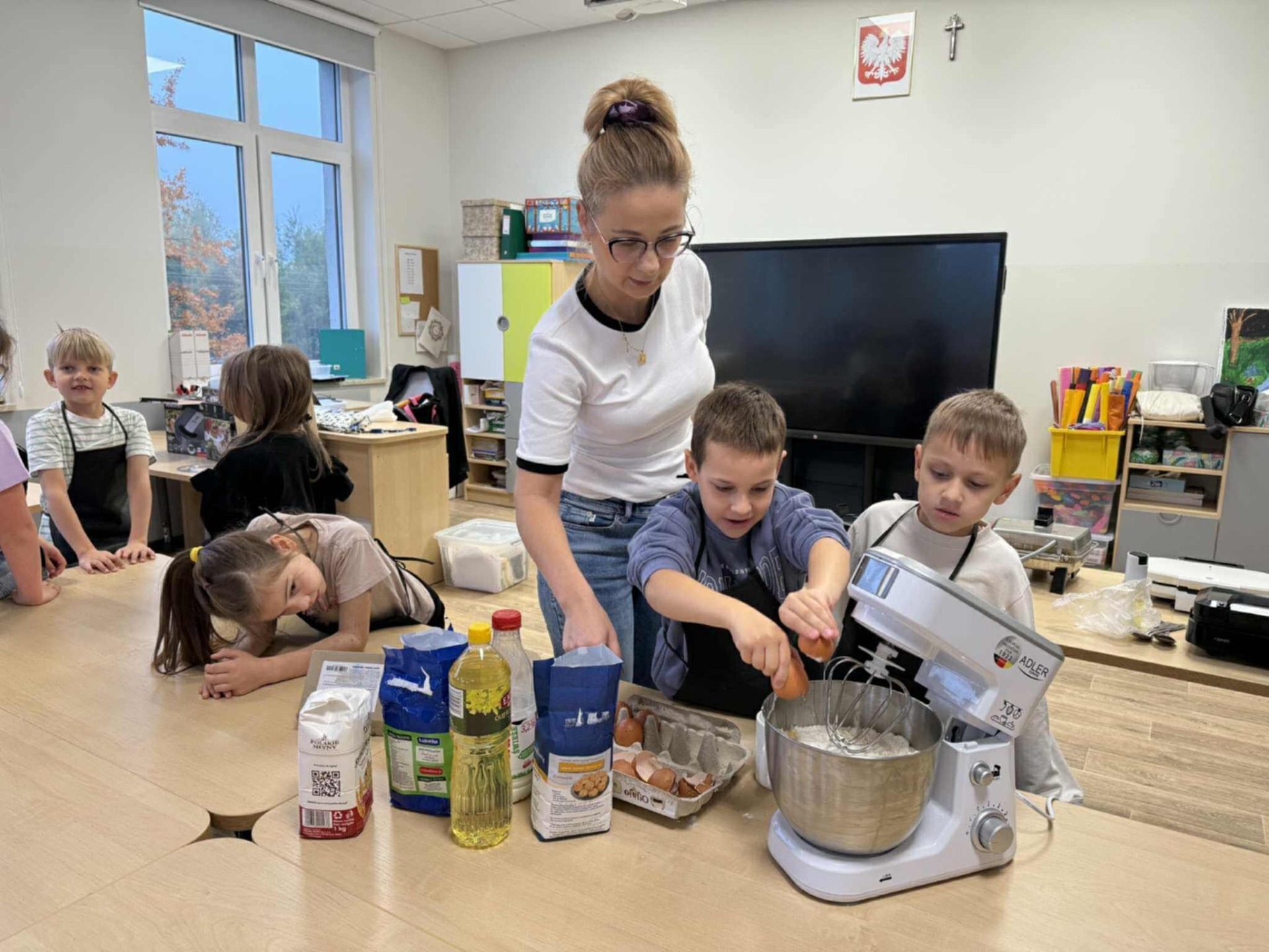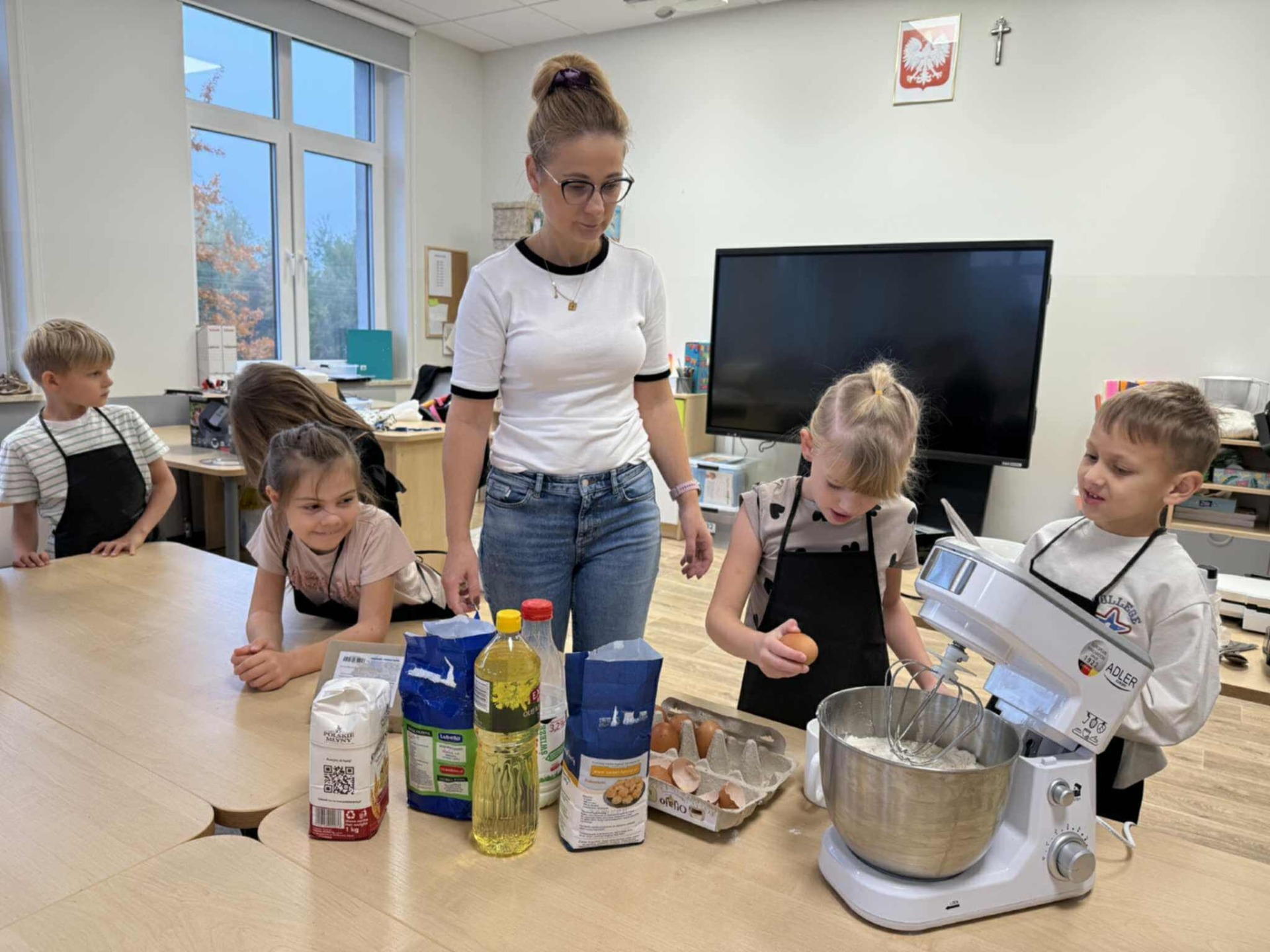 Następnie z wielkim zapałem zabrali się do pracy: odmierzali składniki, wsypywali do miski i mieszali używając robota kuchennego. Upieczone gofry były przepyszne!!!