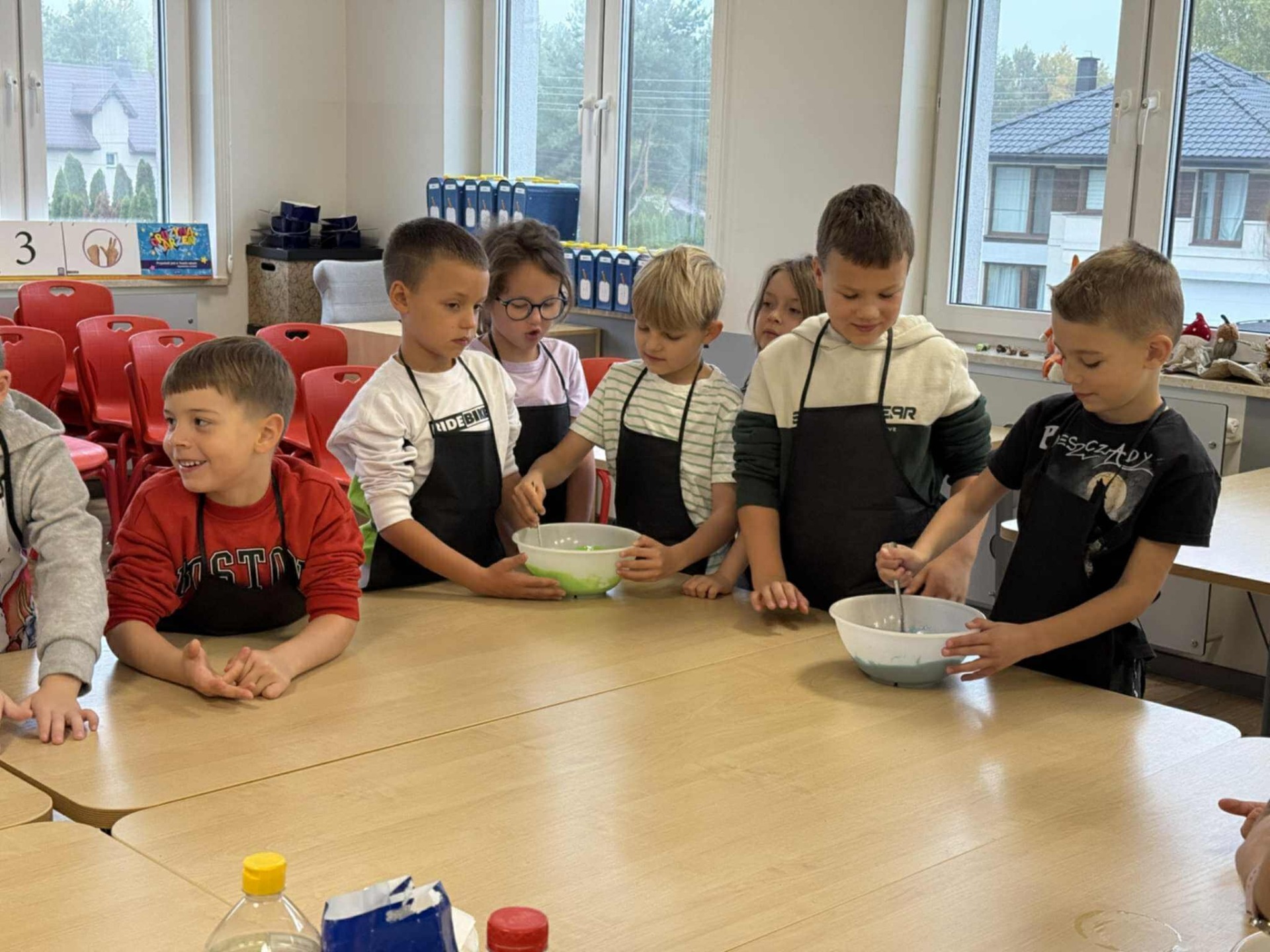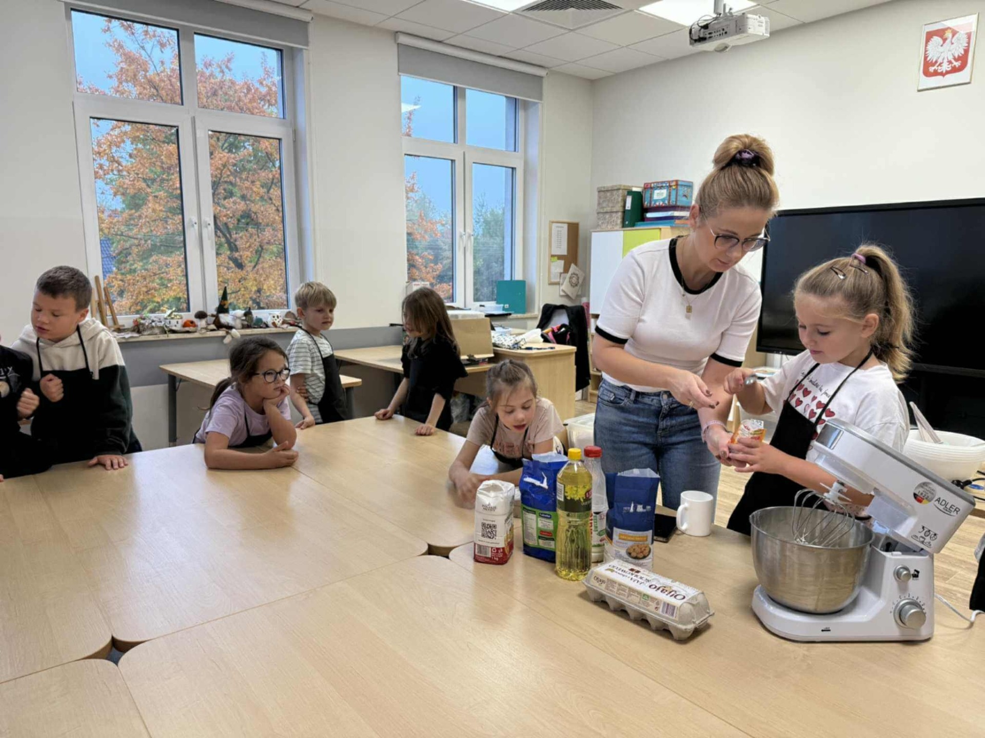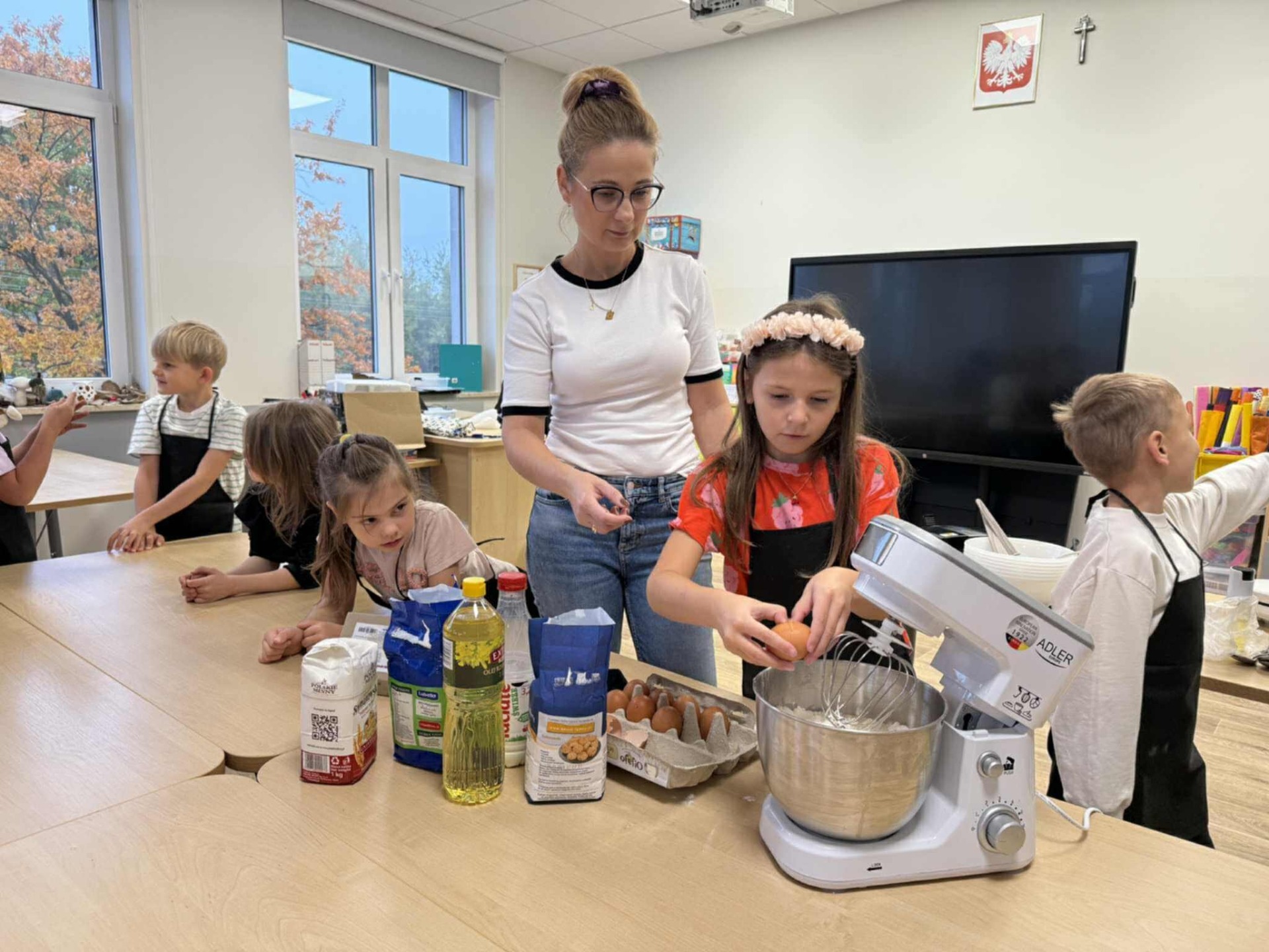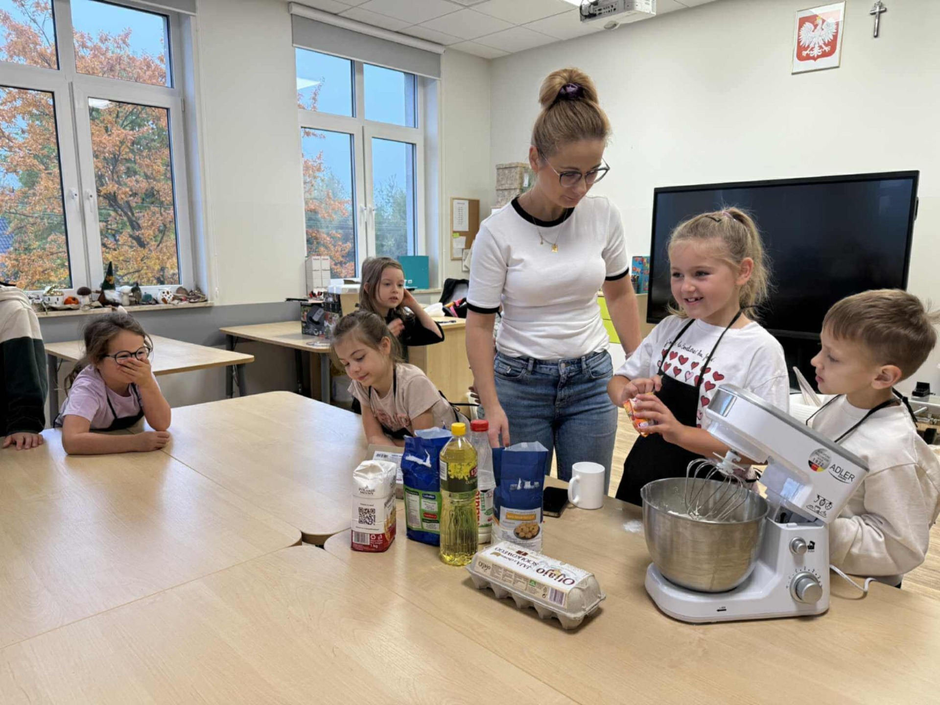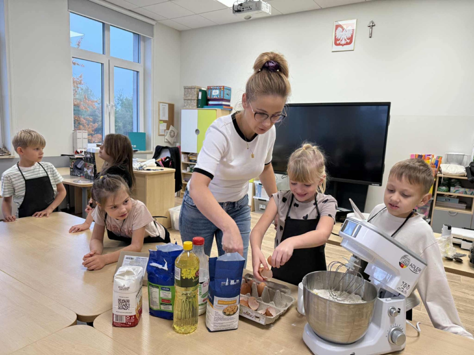 Następnie z wielkim zapałem zabrali się do pracy: odmierzali składniki, wsypywali do miski i mieszali używając robota kuchennego. Upieczone gofry były przepyszne!!!