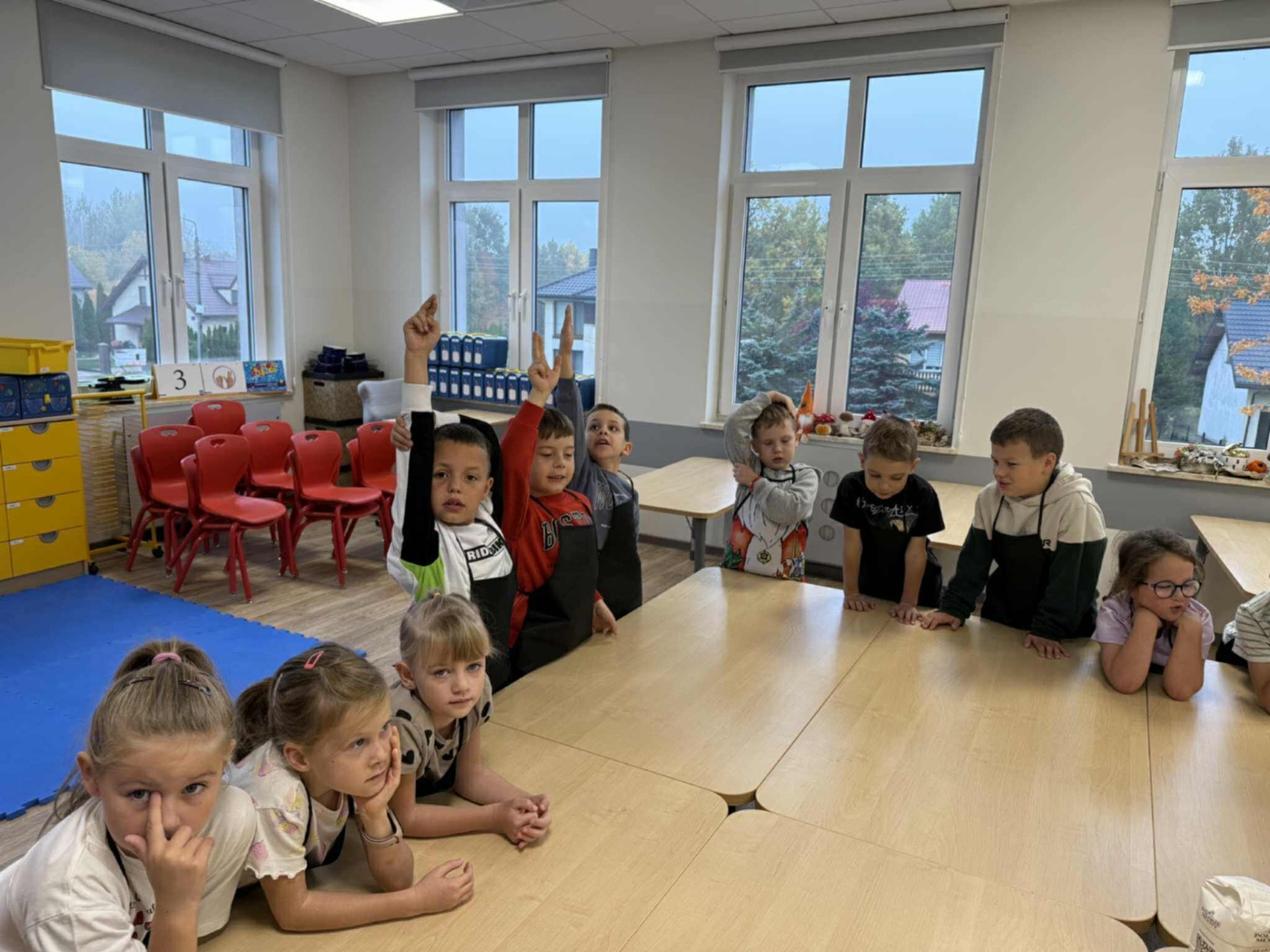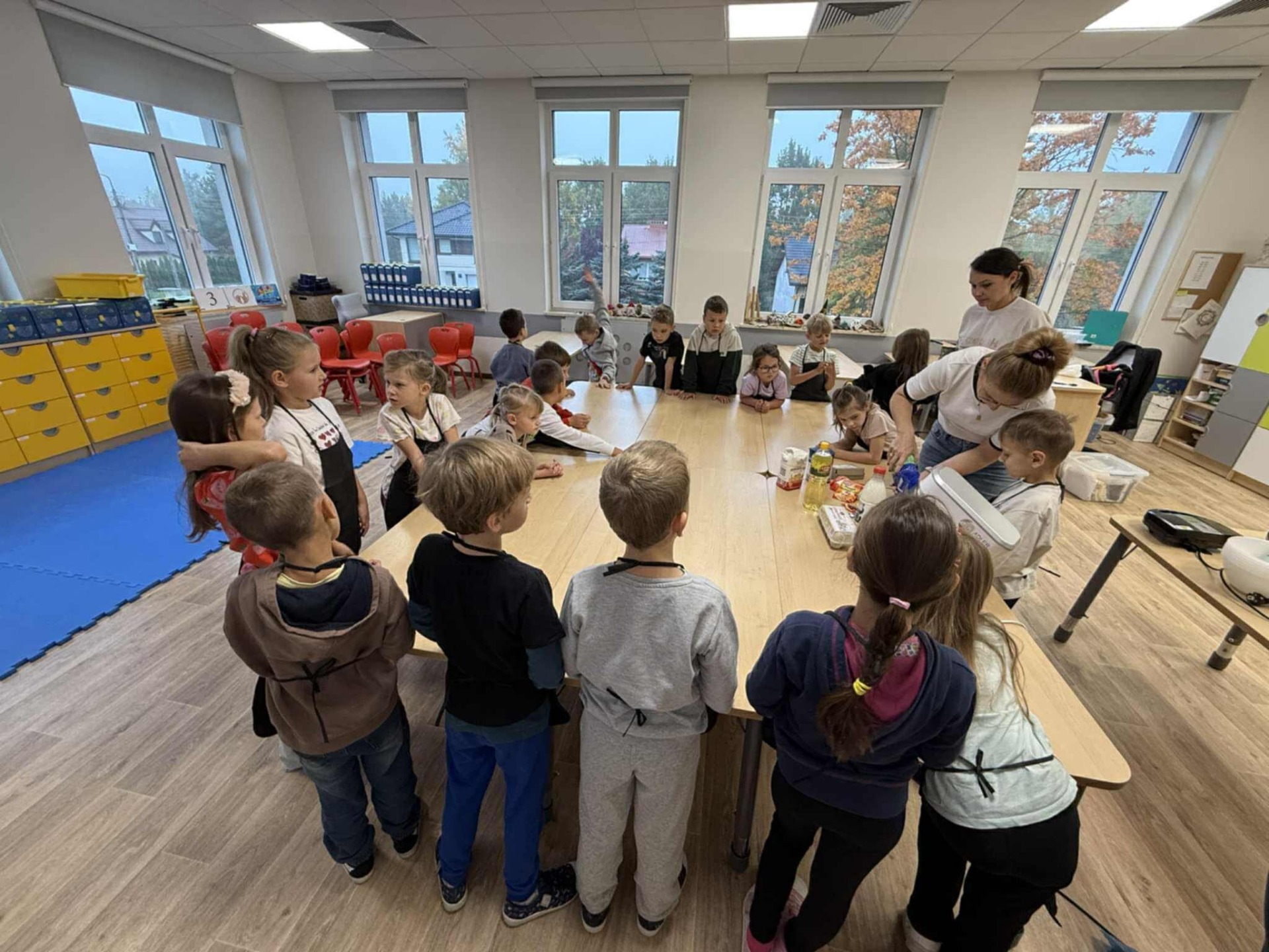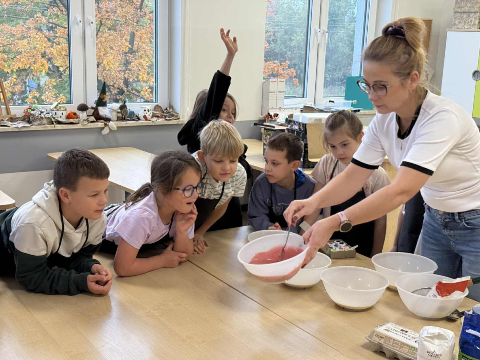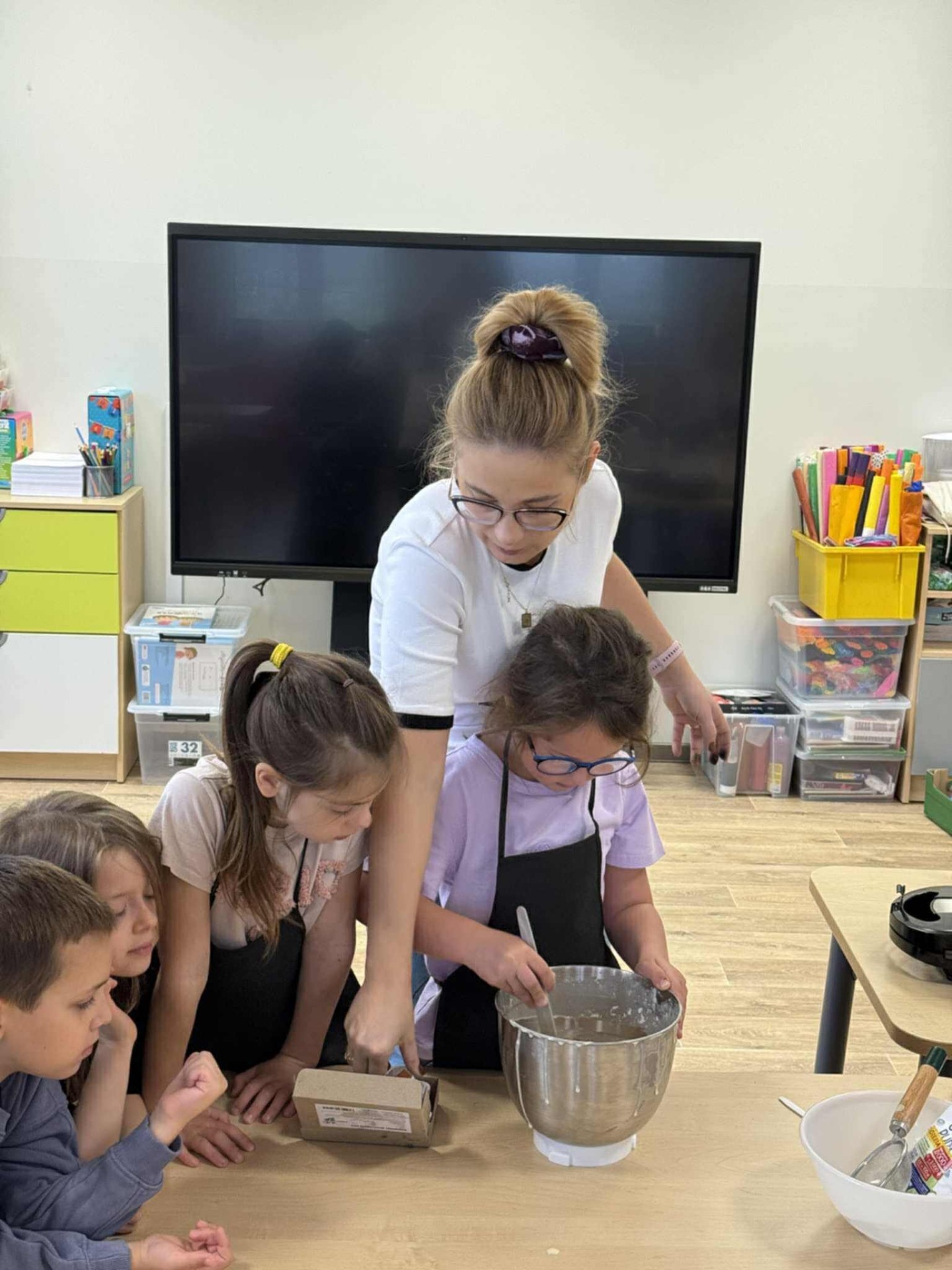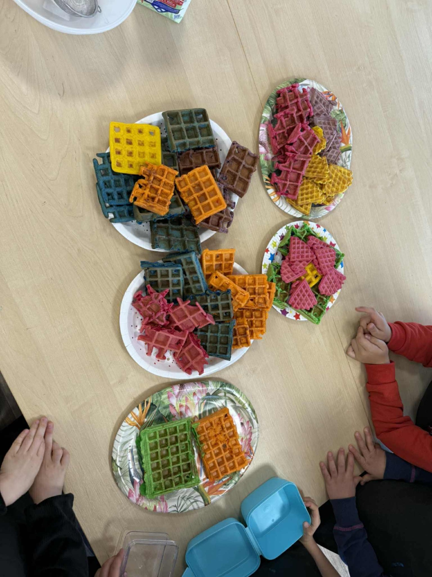 Następnie z wielkim zapałem zabrali się do pracy: odmierzali składniki, wsypywali do miski i mieszali używając robota kuchennego. Upieczone gofry były przepyszne!!!