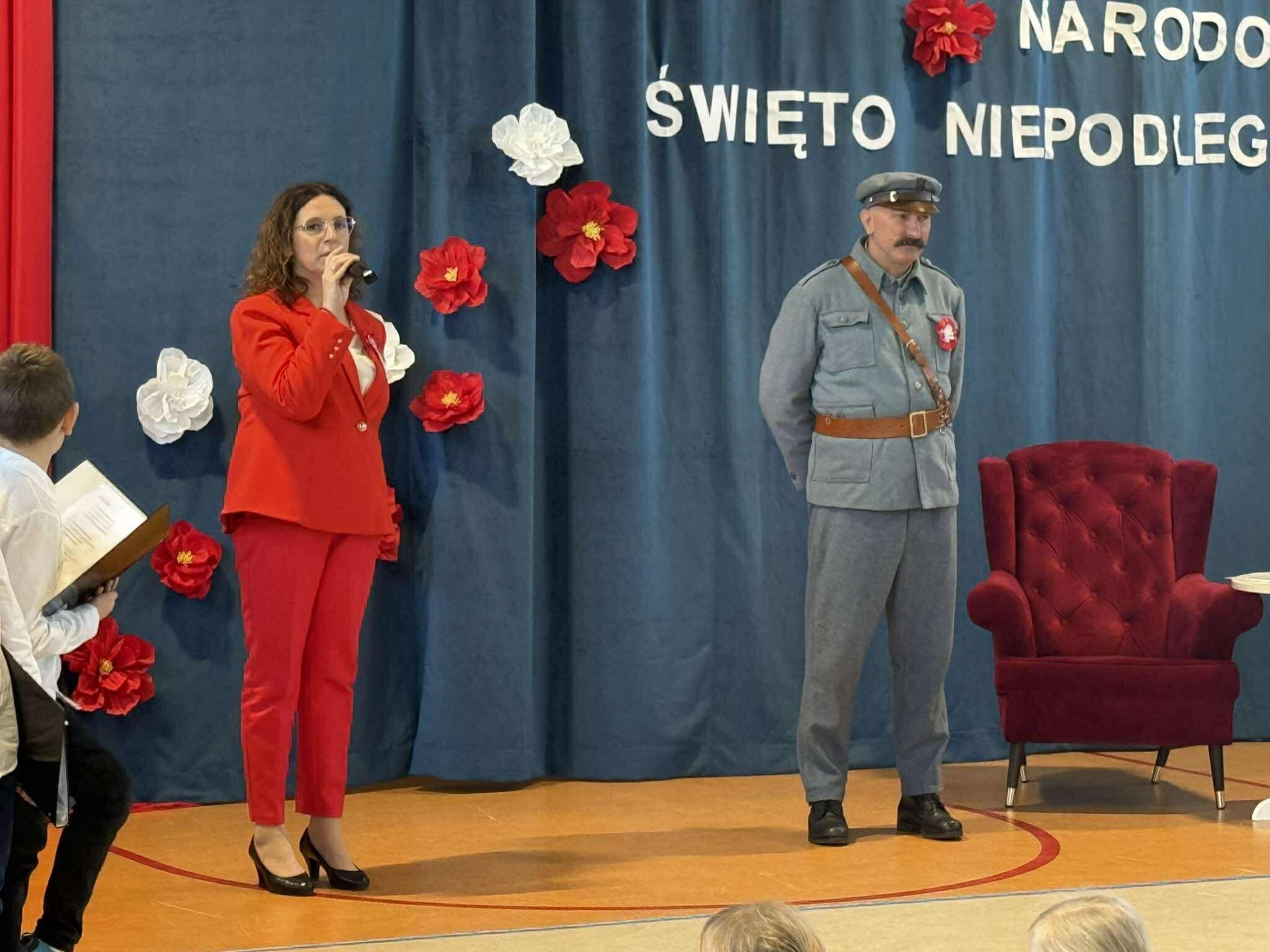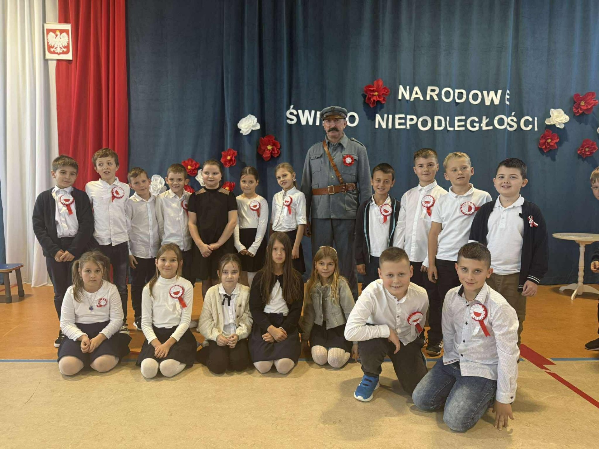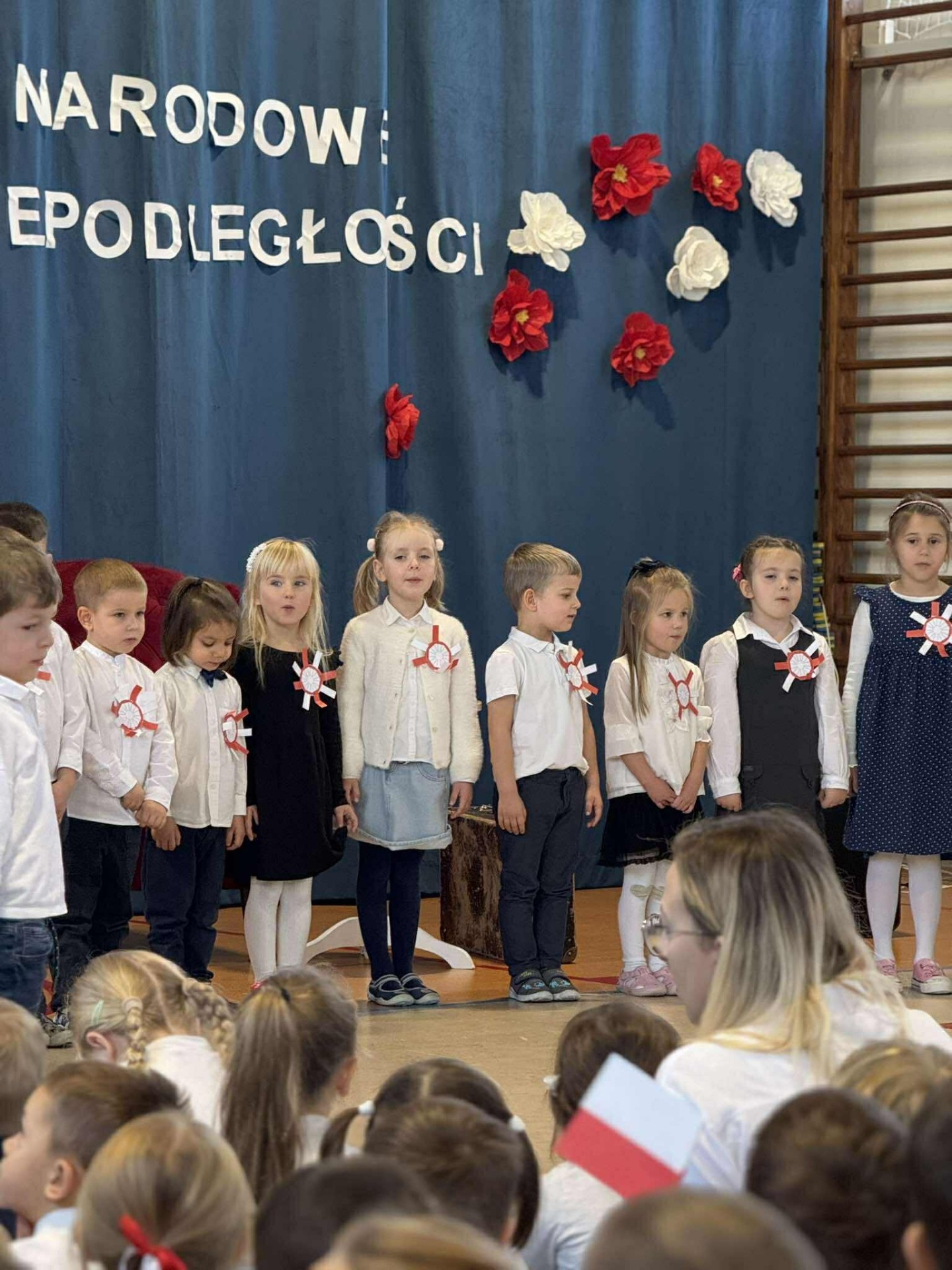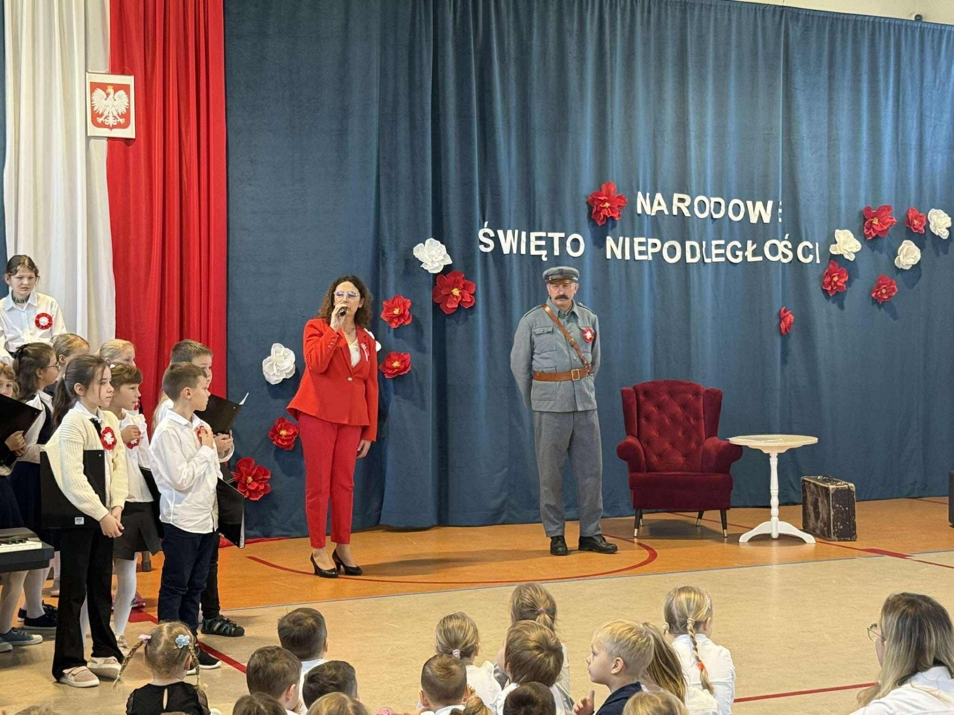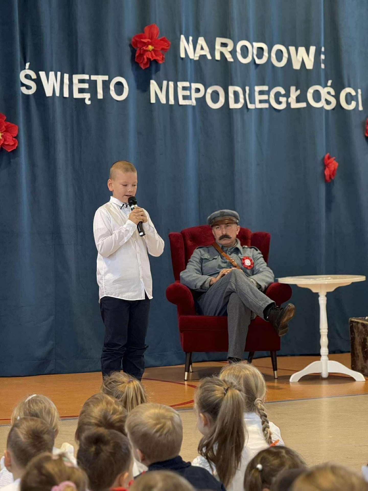 6 listopada 2025r. odbyła się w naszej szkole uroczysta akademia z okazji Narodowego Święta Niepodległości. Apel przygotowali uczniowie klasy 2a, chór szkolny oraz przedszkolaki z grupy Sówek. Uroczystość zaszczycił swoją obecnością Marszałek Polski - Józef Piłsudski, w którego rolę wcielił się pan pedagog Mariusz Wilk. Przedszkolaki zaśpiewały jedną z pieśni legionowych „ Jedzie na Kasztance”. Uczniowie klasy 2a recytowali wiersze o wolności i symbolach narodowych, a także przybliżyli historię walki