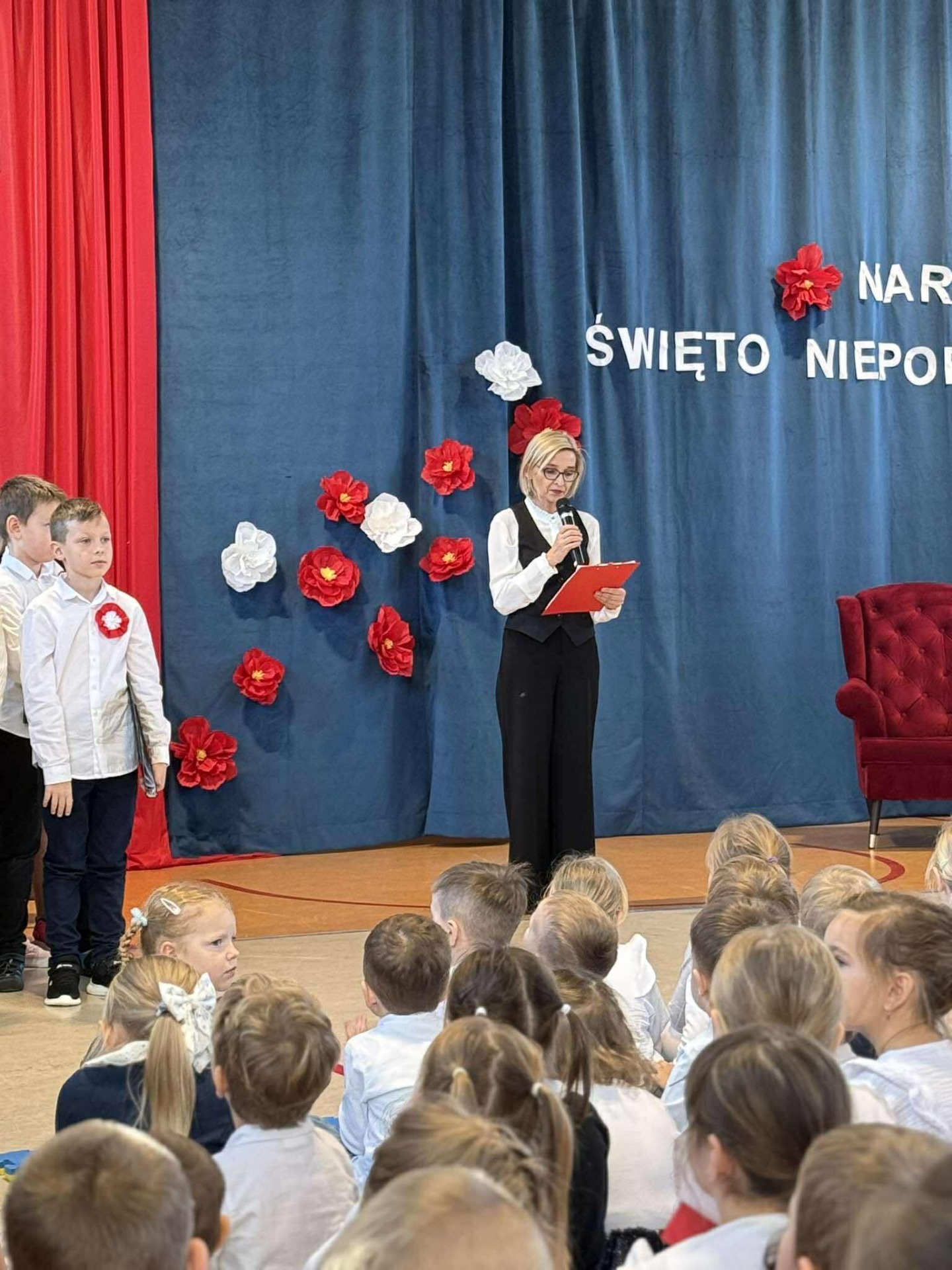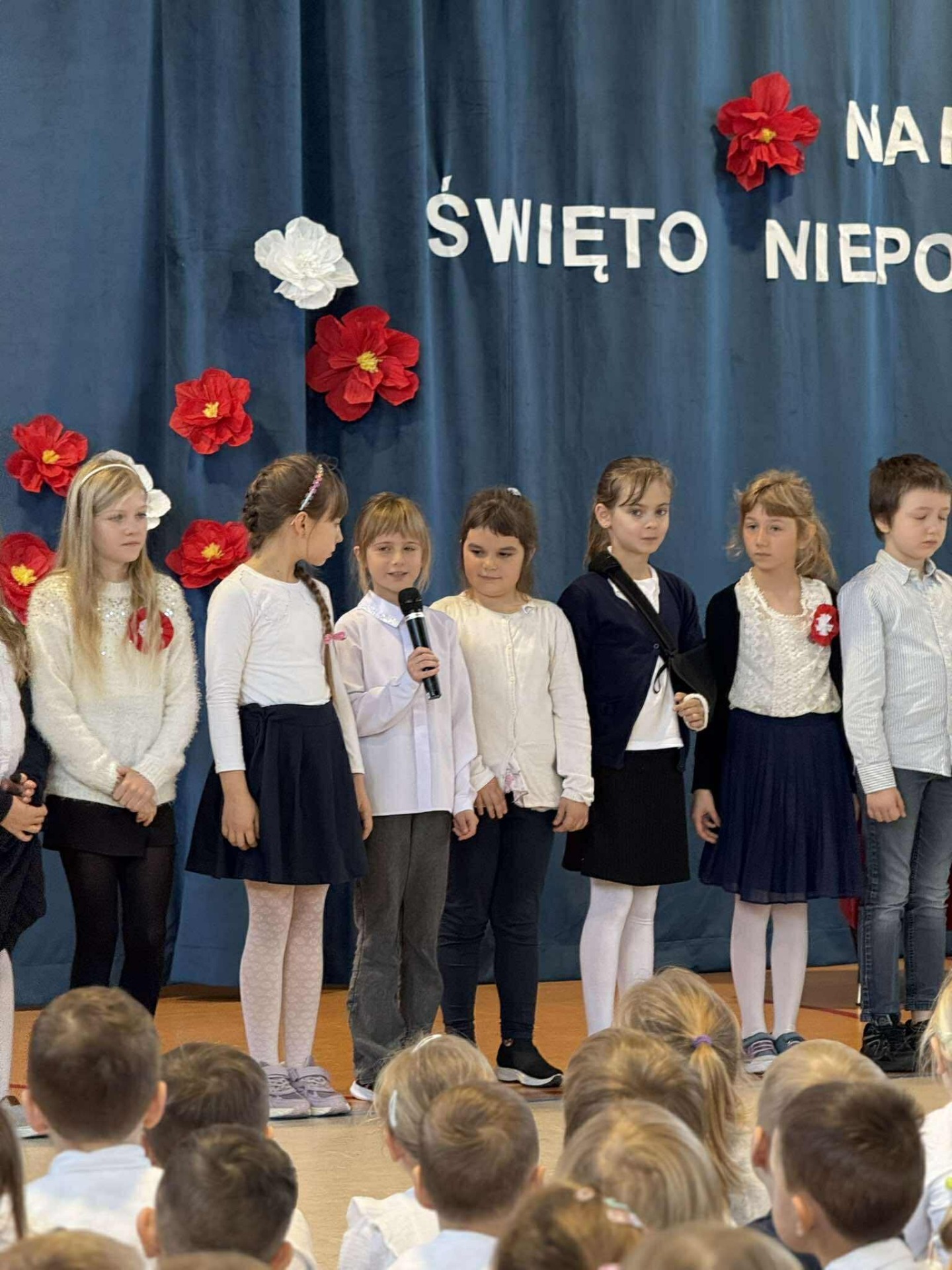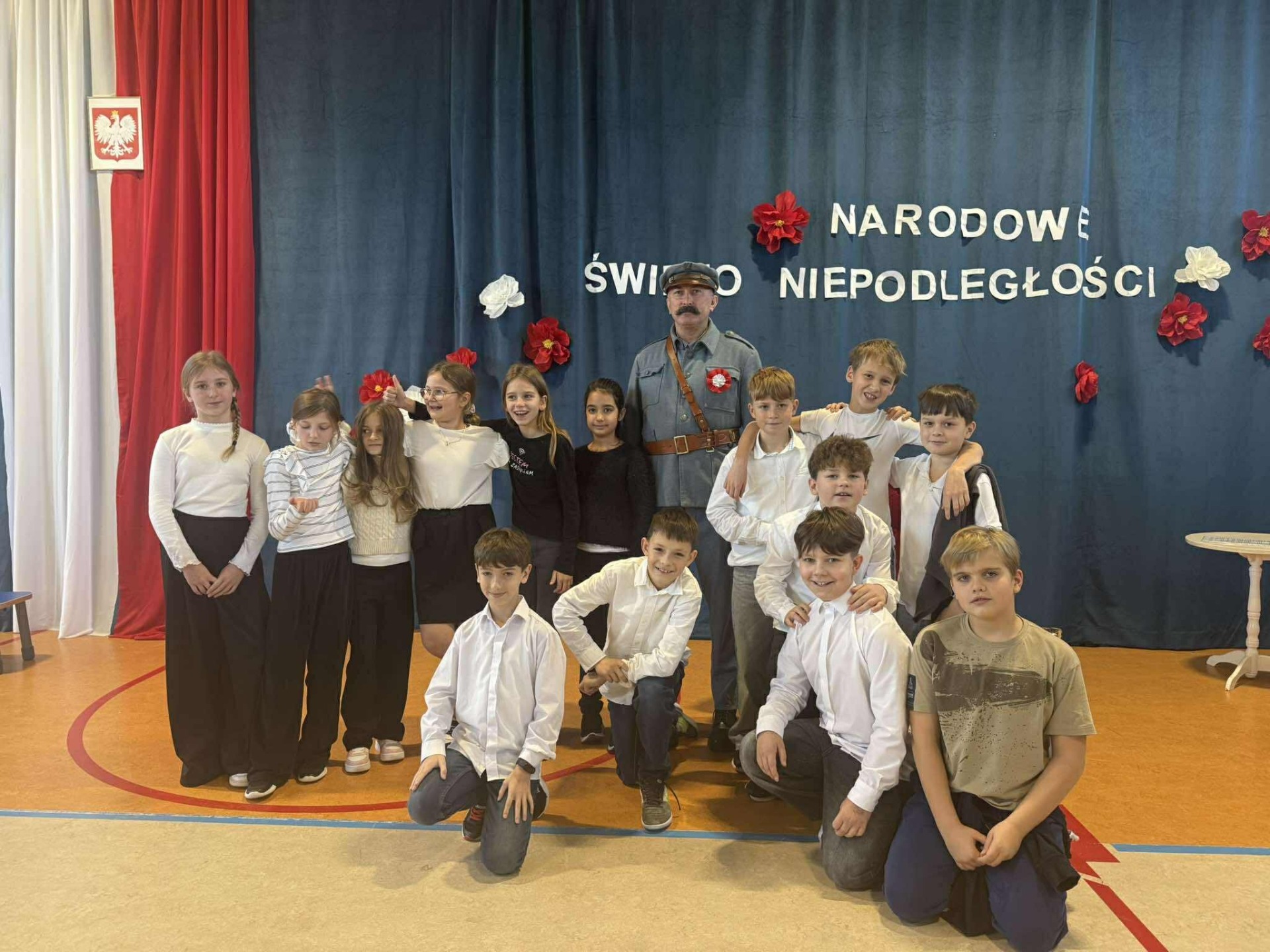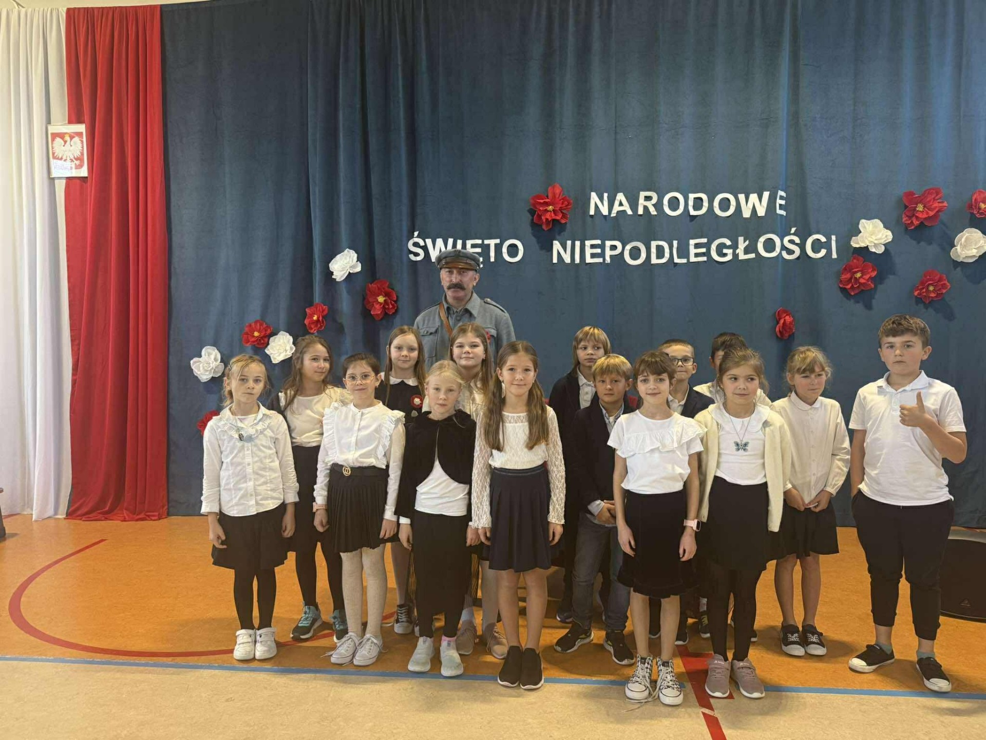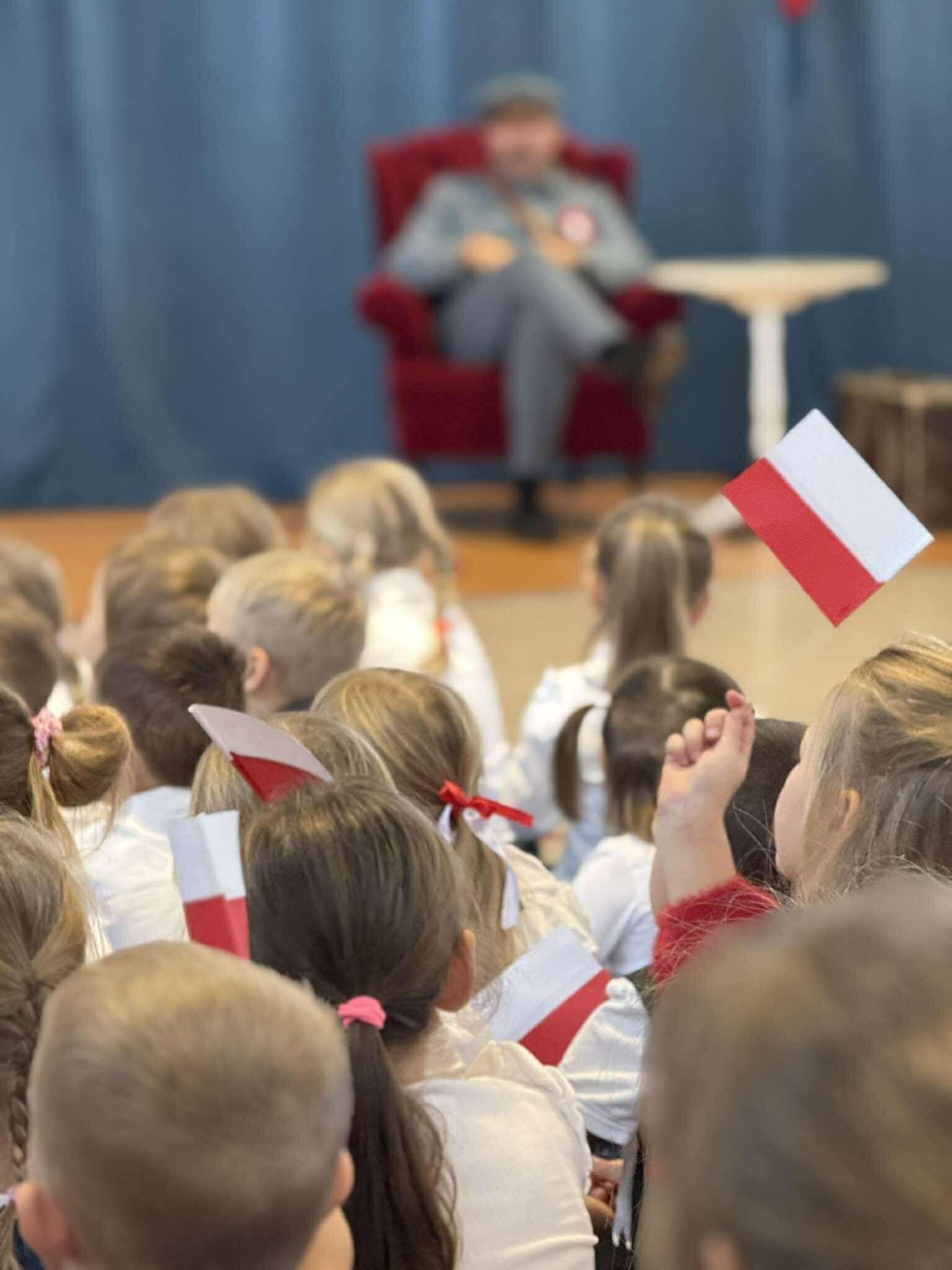 6 listopada 2025r. odbyła się w naszej szkole uroczysta akademia z okazji Narodowego Święta Niepodległości. Apel przygotowali uczniowie klasy 2a, chór szkolny oraz przedszkolaki z grupy Sówek. Uroczystość zaszczycił swoją obecnością Marszałek Polski - Józef Piłsudski, w którego rolę wcielił się pan pedagog Mariusz Wilk. Przedszkolaki zaśpiewały jedną z pieśni legionowych „ Jedzie na Kasztance”. Uczniowie klasy 2a recytowali wiersze o wolności i symbolach narodowych, a także przybliżyli historię walki