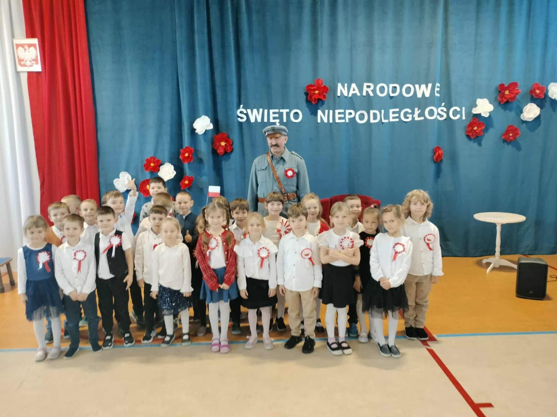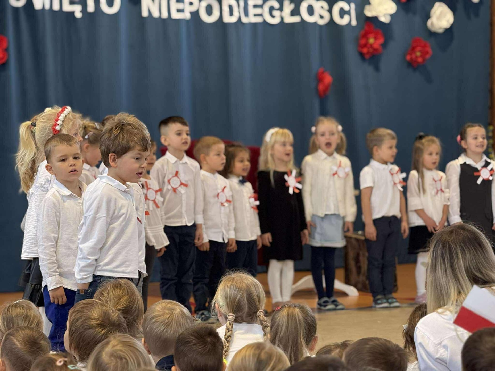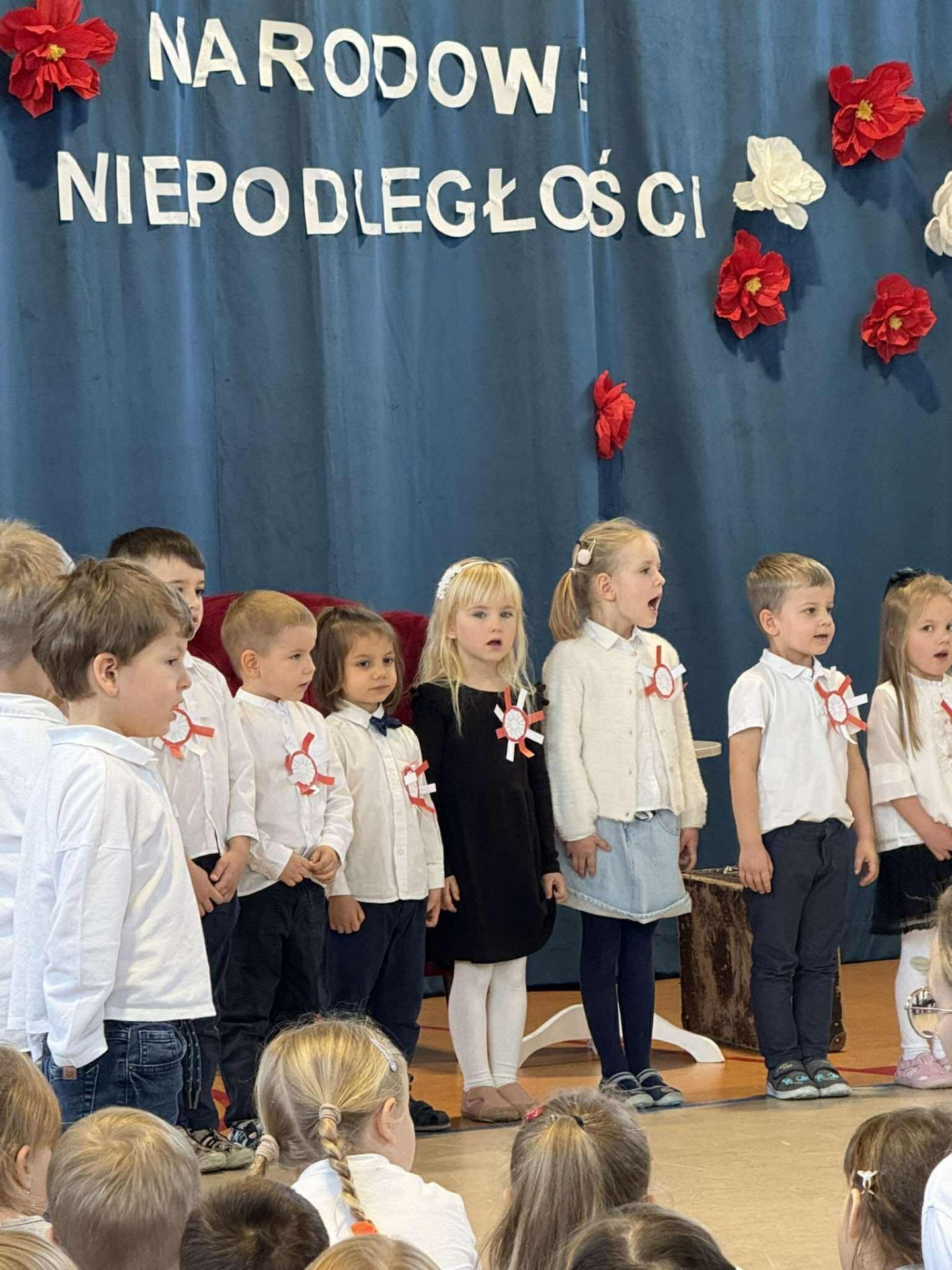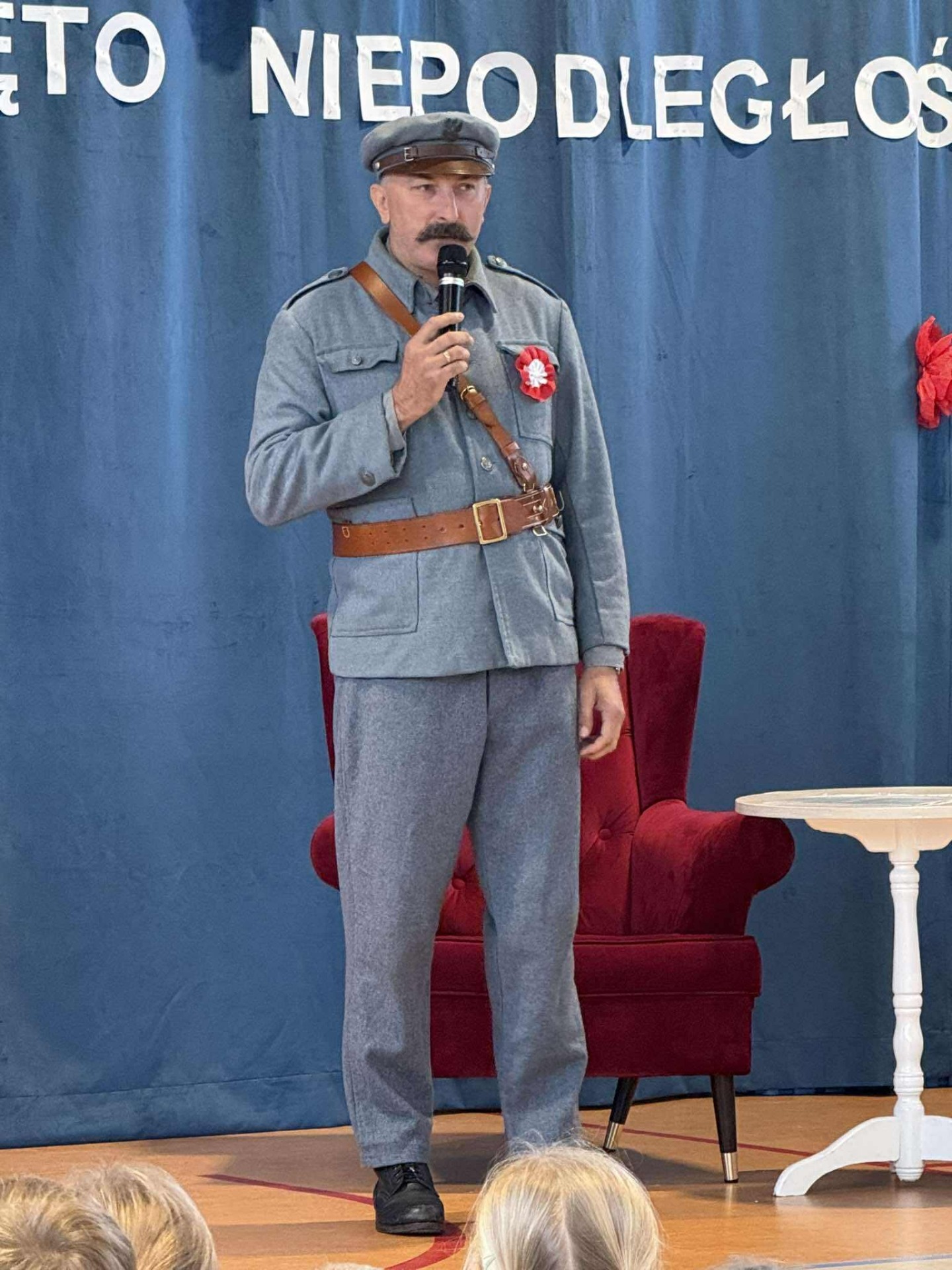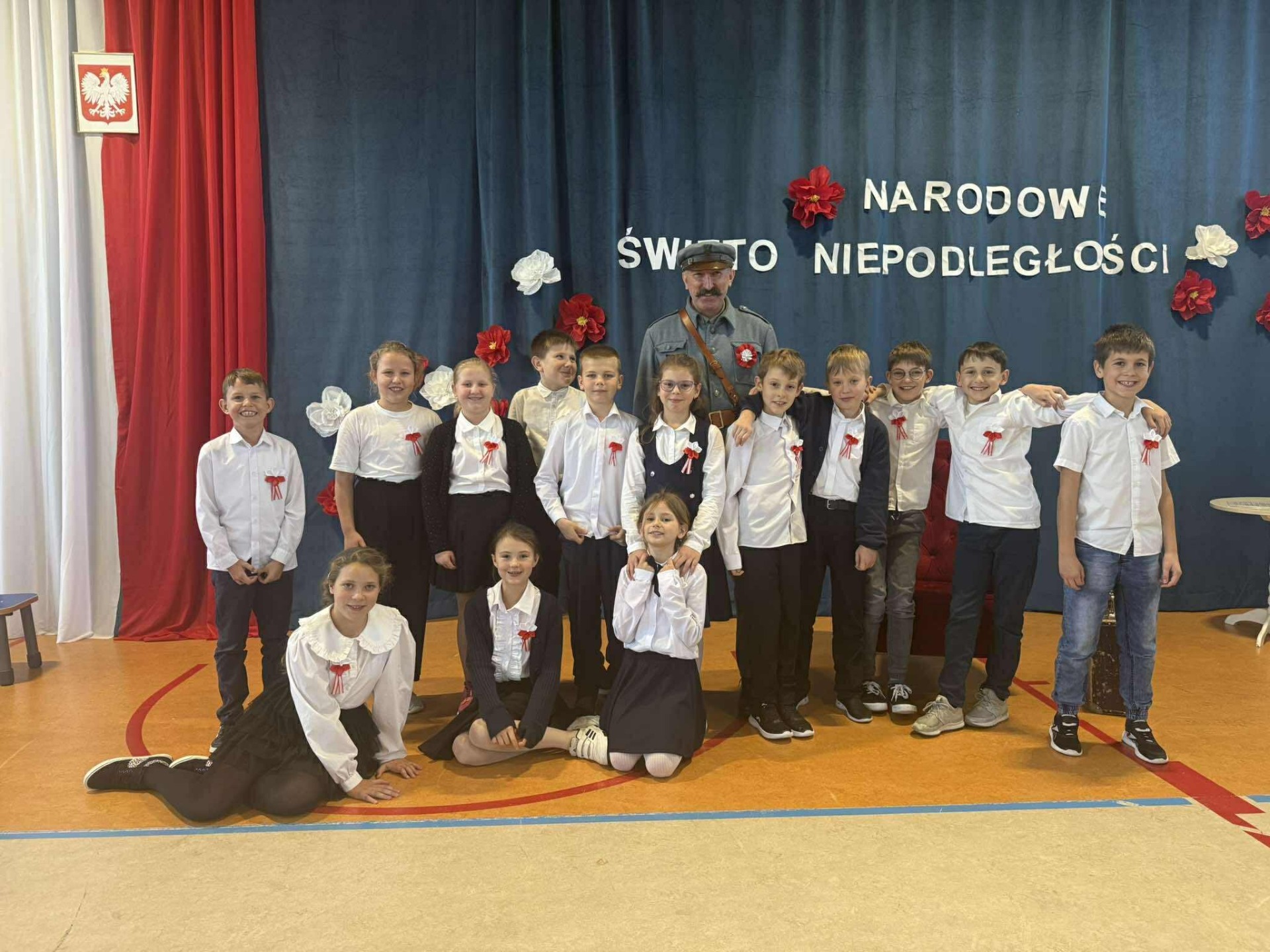 6 listopada 2025r. odbyła się w naszej szkole uroczysta akademia z okazji Narodowego Święta Niepodległości. Apel przygotowali uczniowie klasy 2a, chór szkolny oraz przedszkolaki z grupy Sówek. Uroczystość zaszczycił swoją obecnością Marszałek Polski - Józef Piłsudski, w którego rolę wcielił się pan pedagog Mariusz Wilk. Przedszkolaki zaśpiewały jedną z pieśni legionowych „ Jedzie na Kasztance”. Uczniowie klasy 2a recytowali wiersze o wolności i symbolach narodowych, a także przybliżyli historię walki