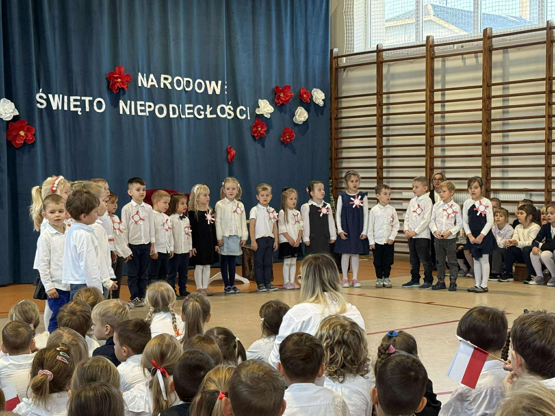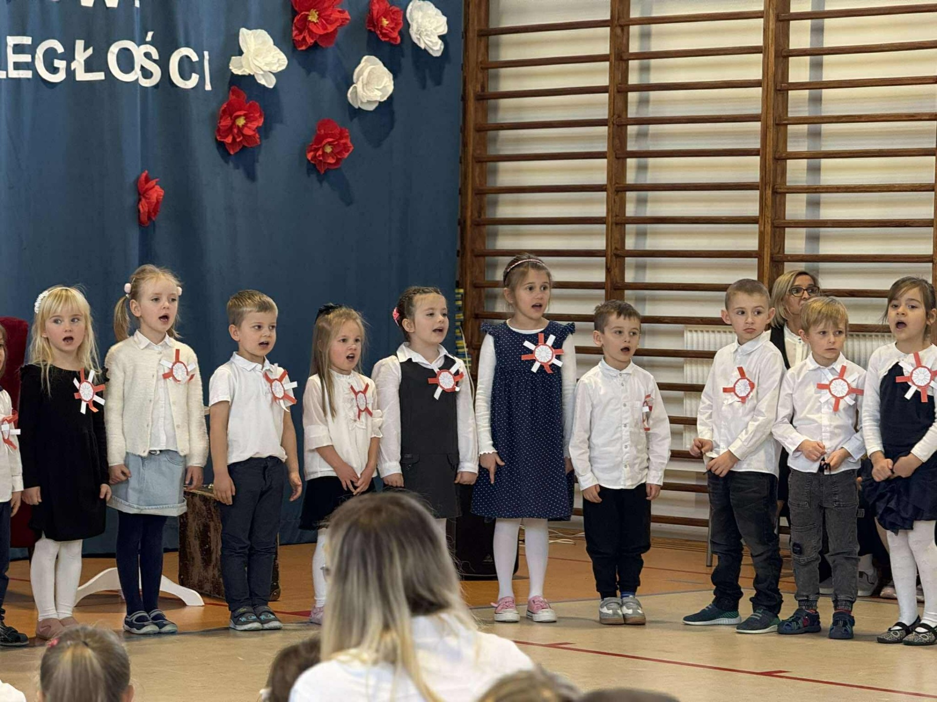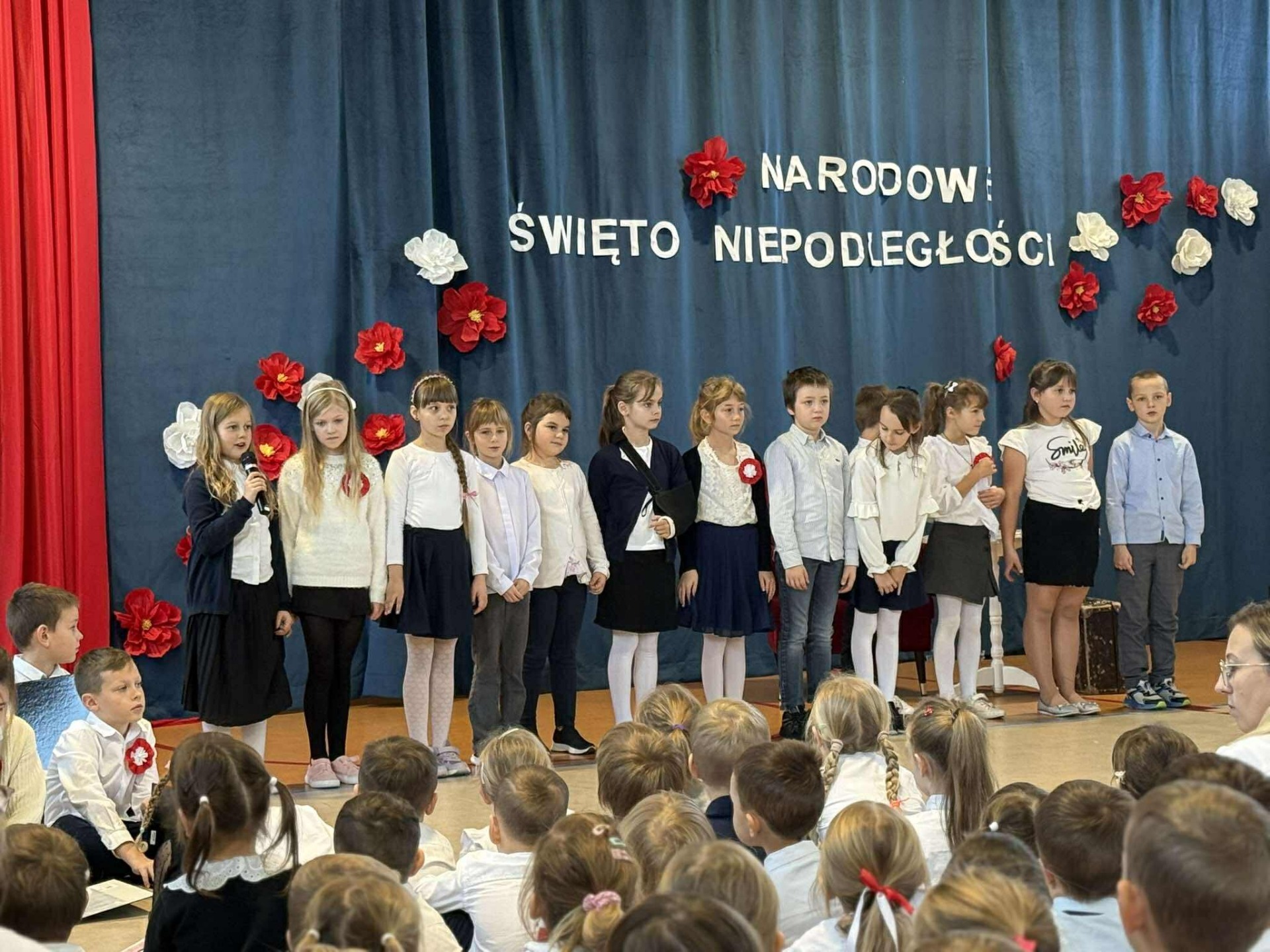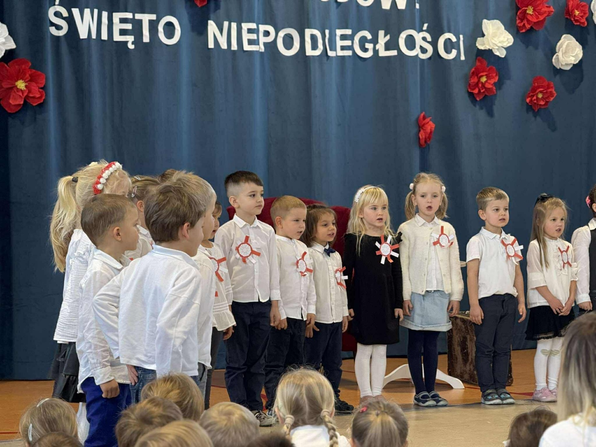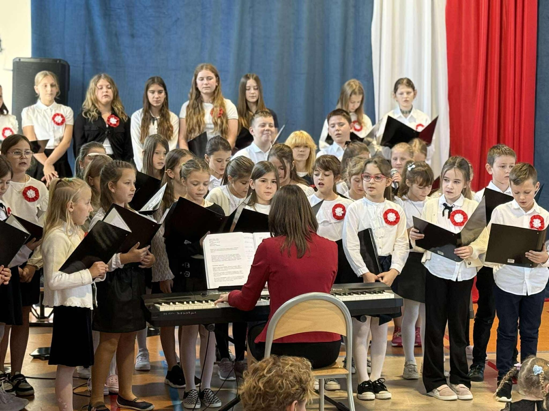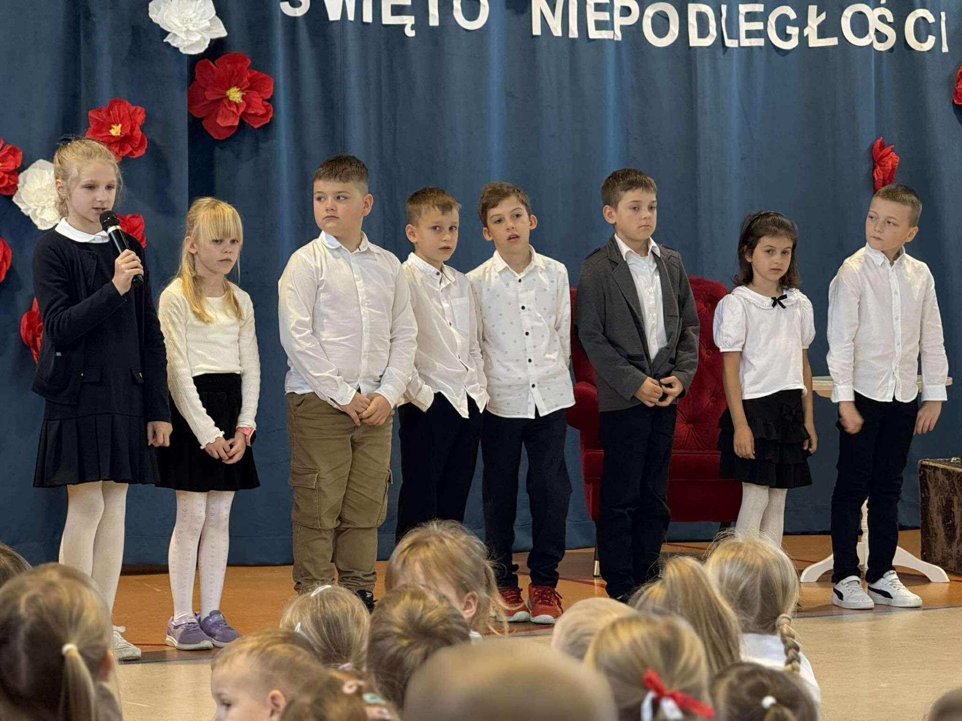 6 listopada 2025r. odbyła się w naszej szkole uroczysta akademia z okazji Narodowego Święta Niepodległości. Apel przygotowali uczniowie klasy 2a, chór szkolny oraz przedszkolaki z grupy Sówek. Uroczystość zaszczycił swoją obecnością Marszałek Polski - Józef Piłsudski, w którego rolę wcielił się pan pedagog Mariusz Wilk. Przedszkolaki zaśpiewały jedną z pieśni legionowych „ Jedzie na Kasztance”. Uczniowie klasy 2a recytowali wiersze o wolności i symbolach narodowych, a także przybliżyli historię walki