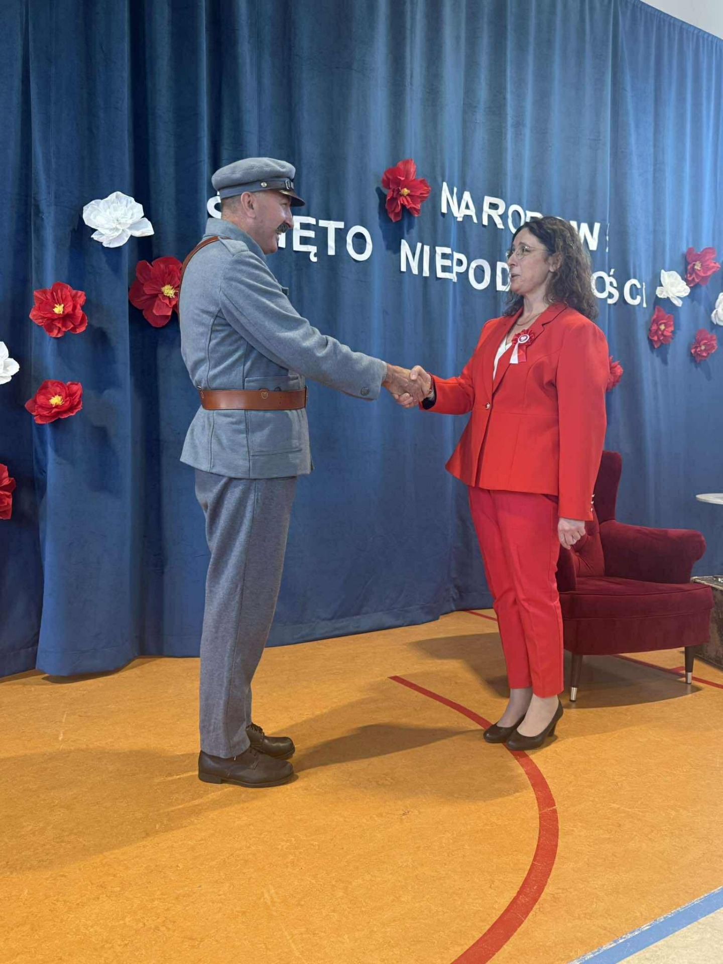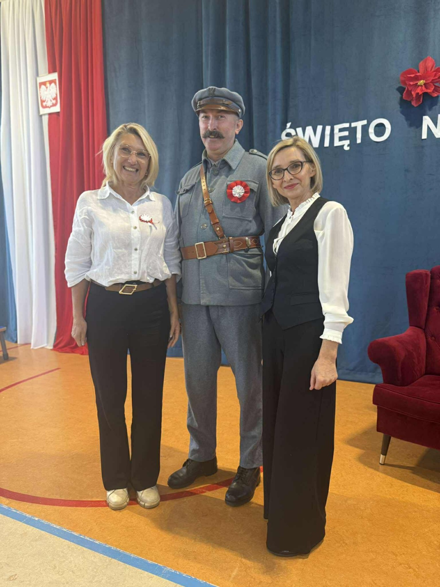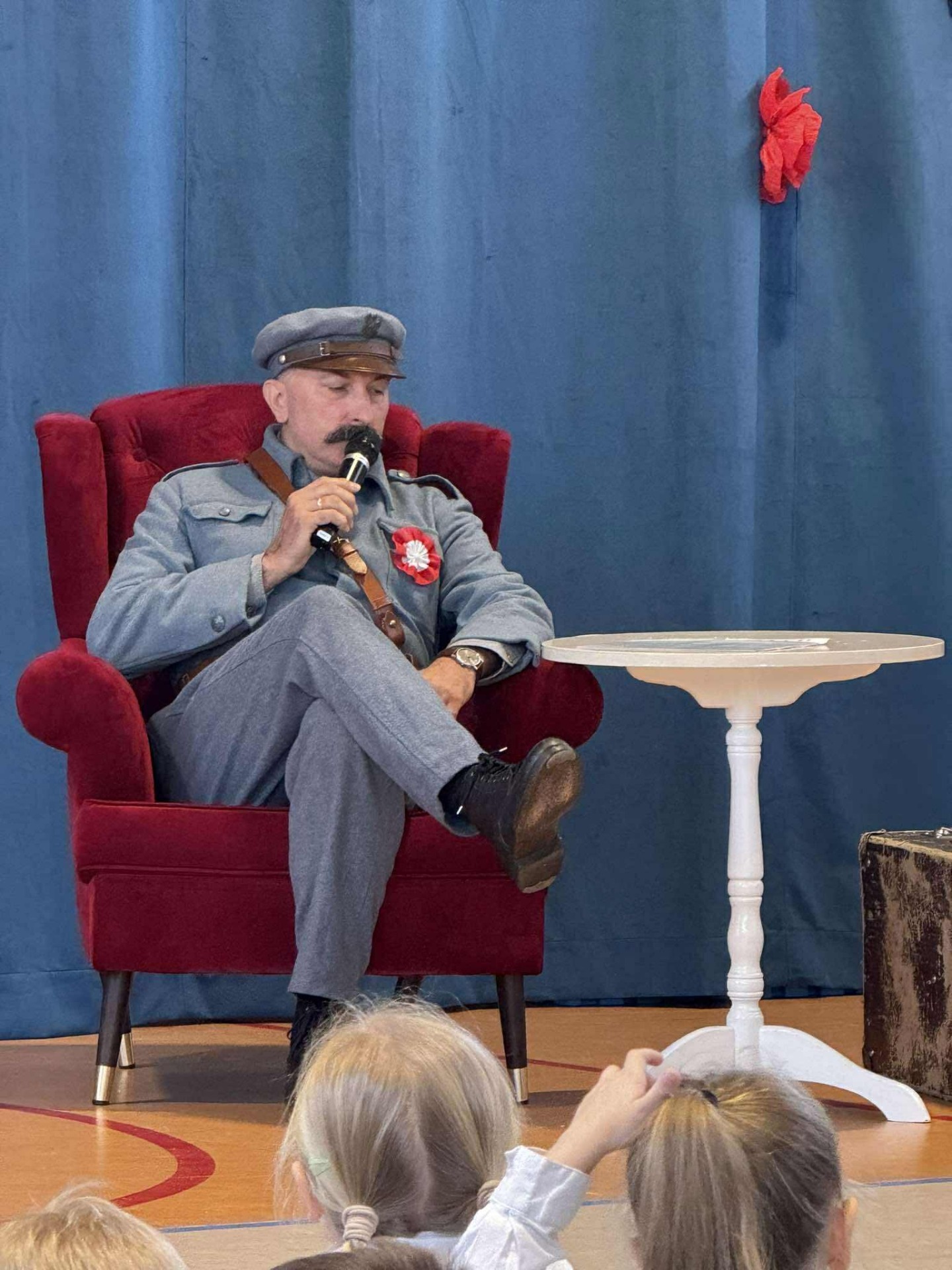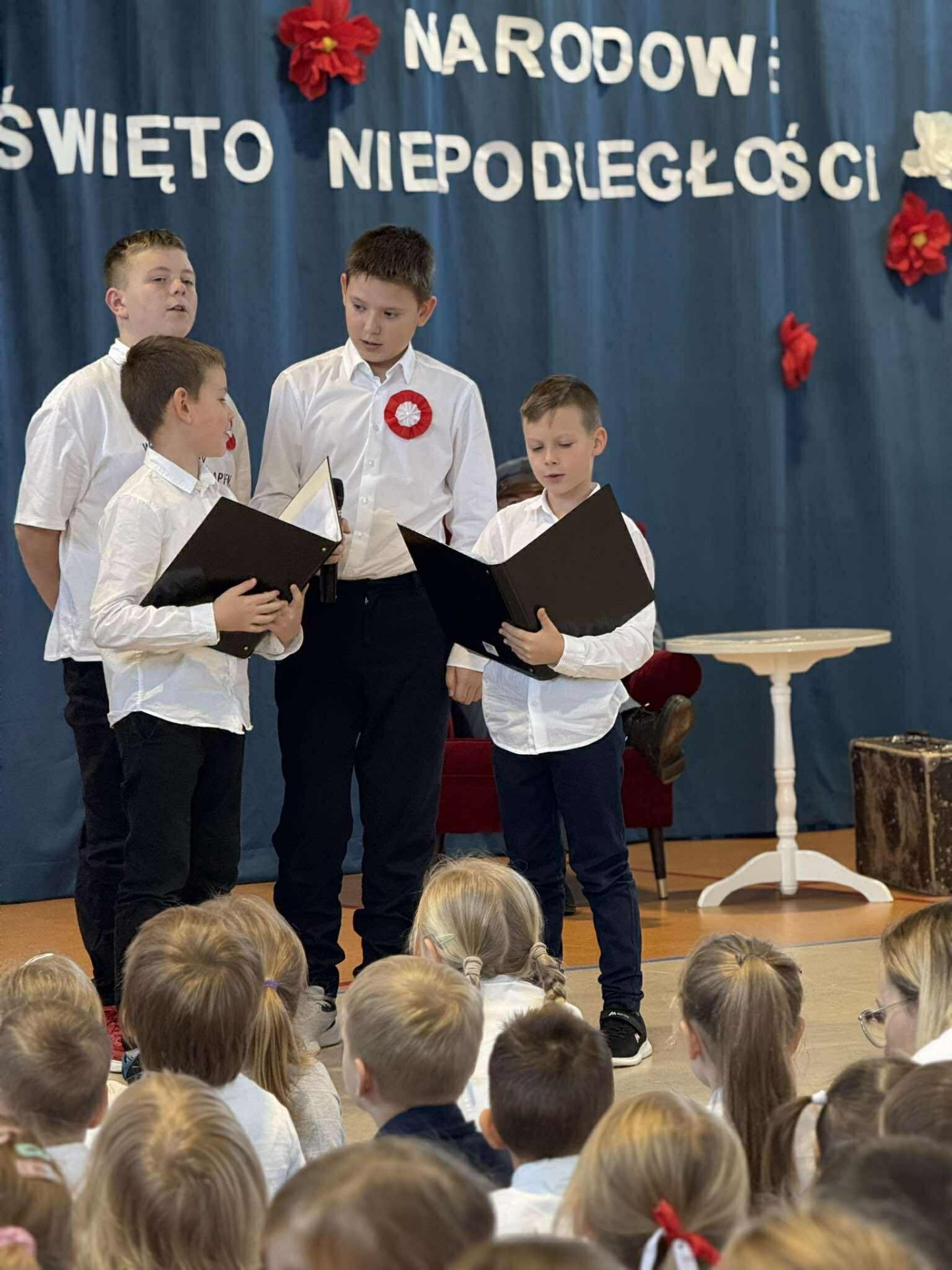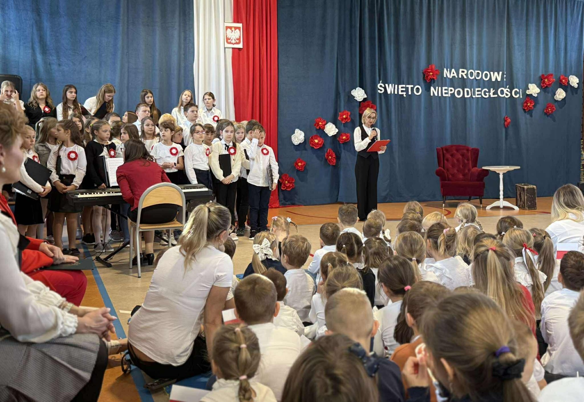 6 listopada 2025r. odbyła się w naszej szkole uroczysta akademia z okazji Narodowego Święta Niepodległości. Apel przygotowali uczniowie klasy 2a, chór szkolny oraz przedszkolaki z grupy Sówek. Uroczystość zaszczycił swoją obecnością Marszałek Polski - Józef Piłsudski, w którego rolę wcielił się pan pedagog Mariusz Wilk. Przedszkolaki zaśpiewały jedną z pieśni legionowych „ Jedzie na Kasztance”. Uczniowie klasy 2a recytowali wiersze o wolności i symbolach narodowych, a także przybliżyli historię walki