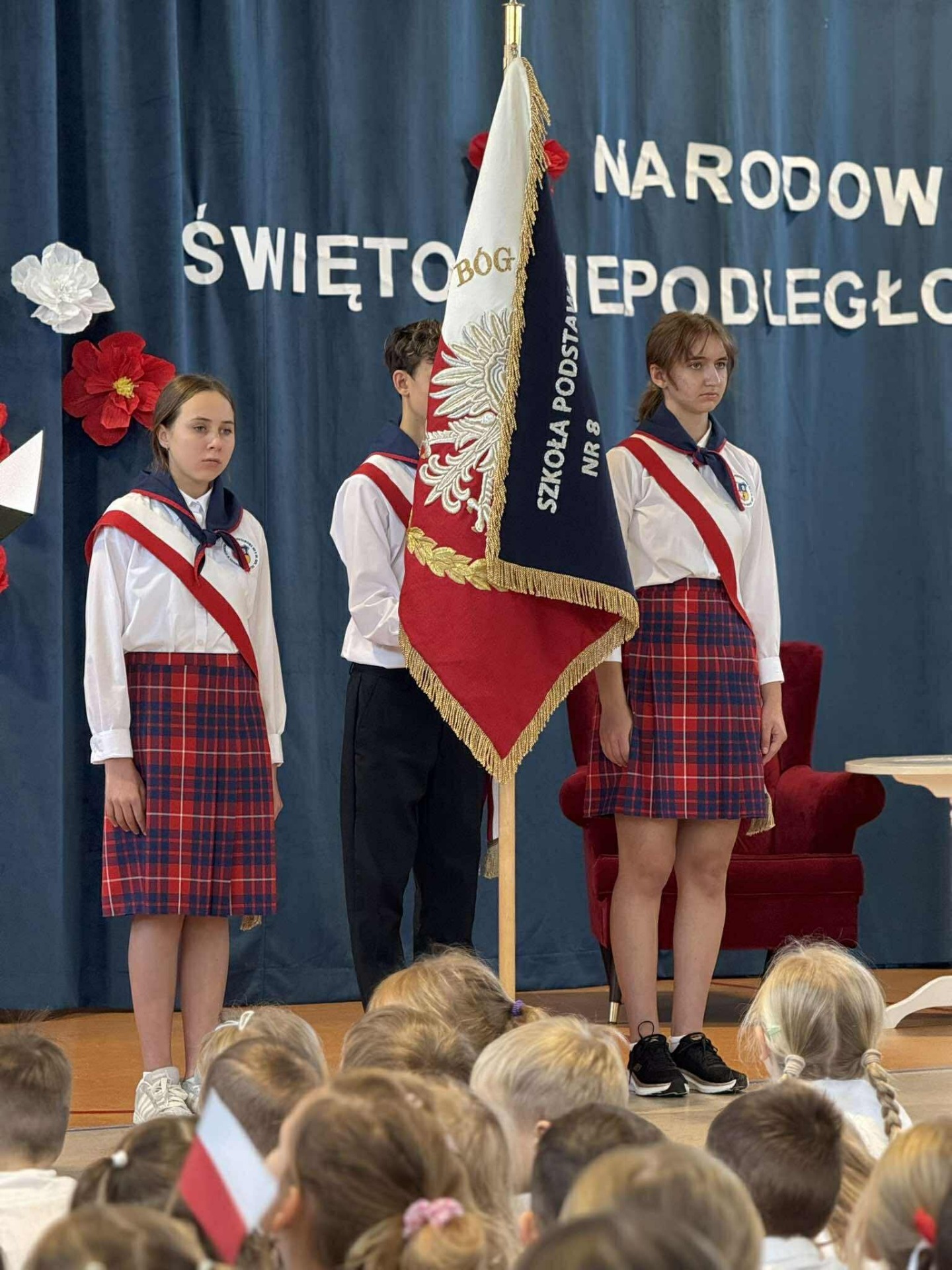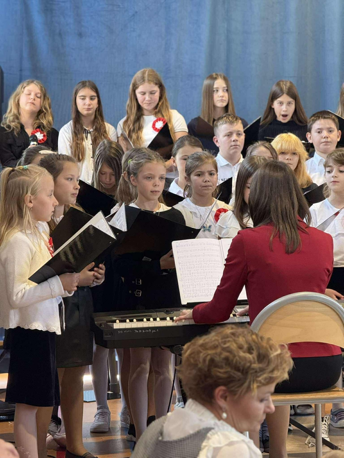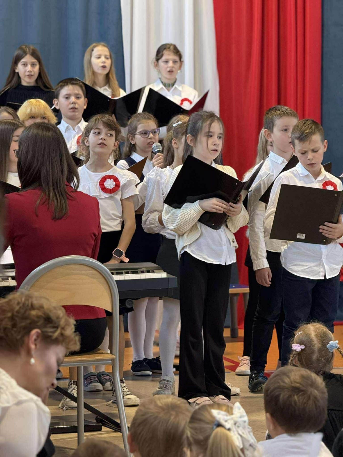 o niepodległość. Chór szkolny pod kierownictwem pani Agnieszki Czarneckiej pięknie zaprezentował pieśni: „Pierwsza Kadrowa”, „Legiony to…”, „Taki kraj” oraz „Piosenkę