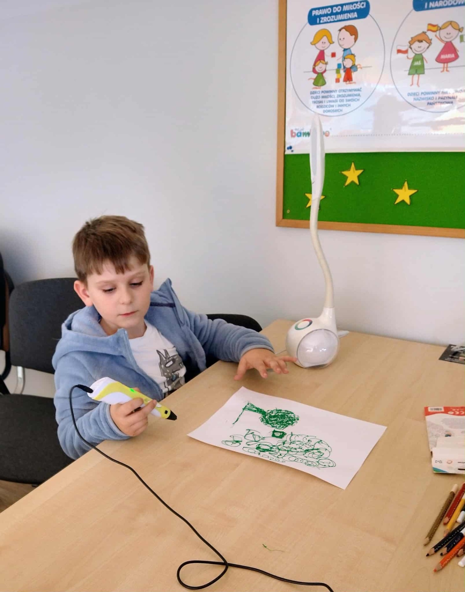Tematem dzisiejszych zajęć było rozwijanie wyobraźni. Za pomocą długopisu 3D z projektu Laboratoria Przyszłości można wykreować trójwymiarowe prace plastyczne, które są trwałe i odporne na rozmazywanie. Technika pracy takim długopisem rozwija oprócz wyobraźni, koordynację, precyzję i koncentrację uwagi.