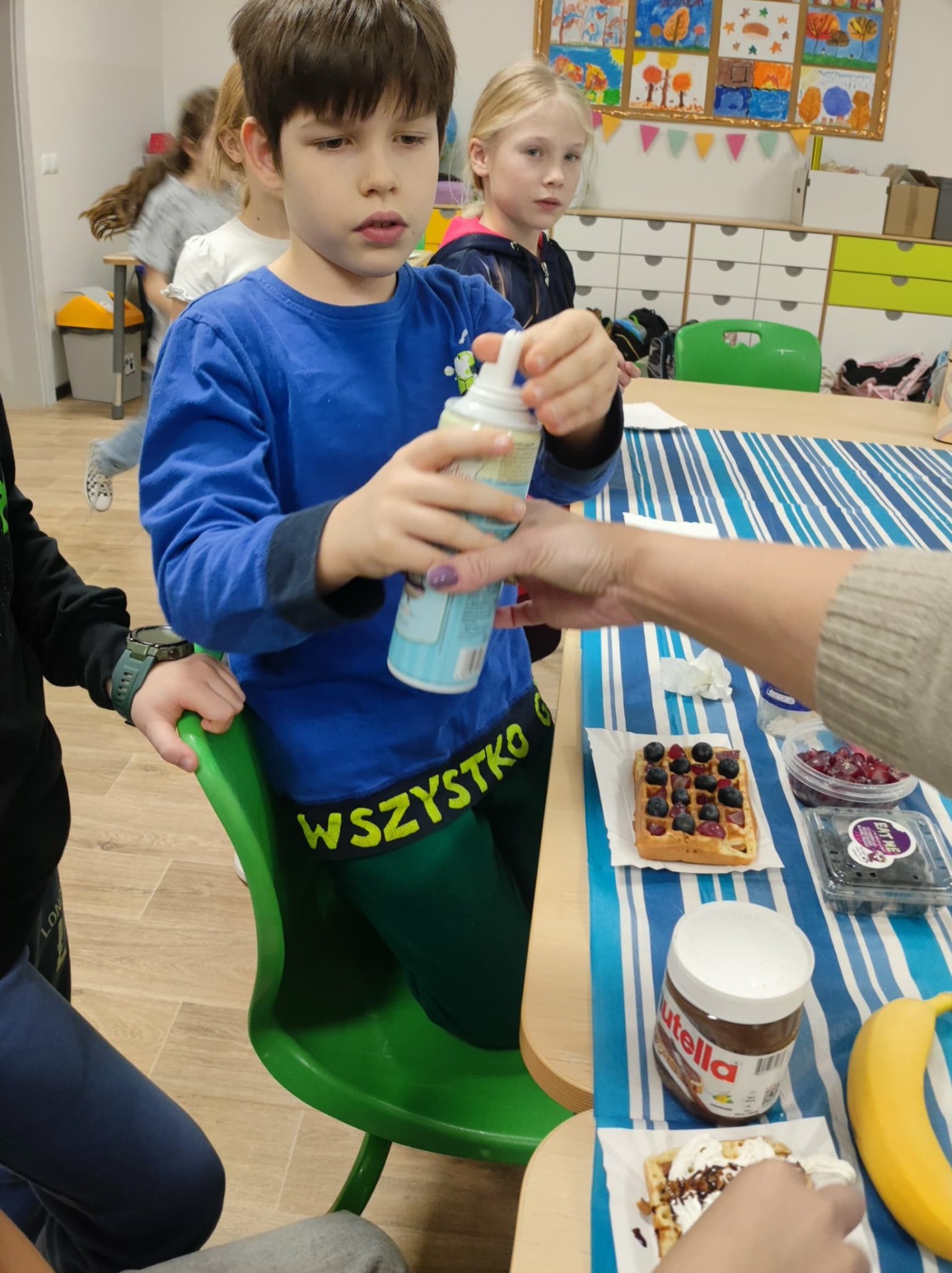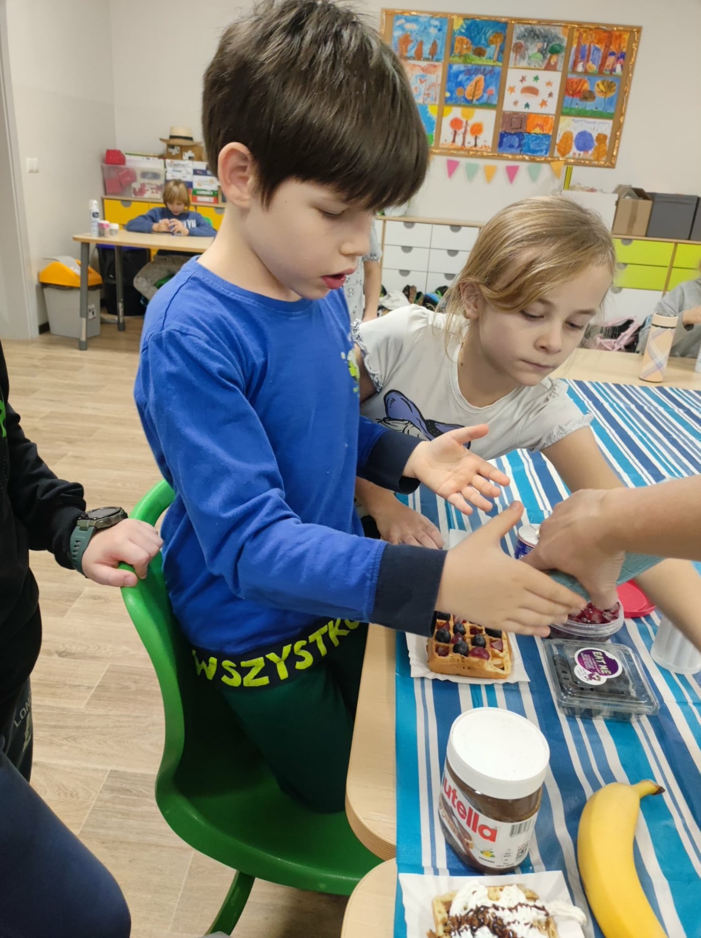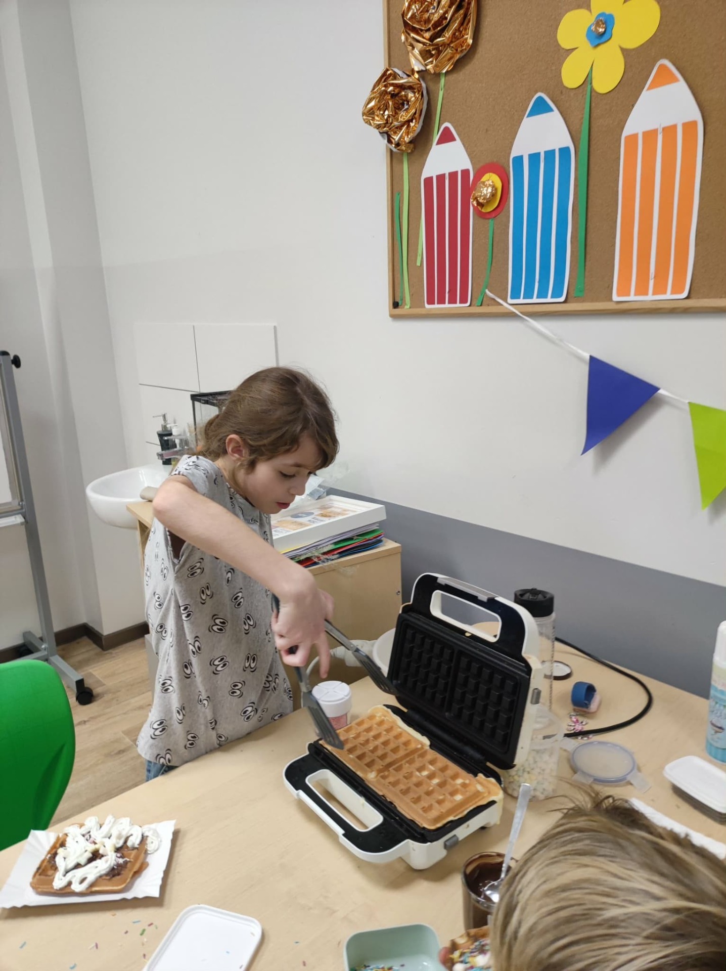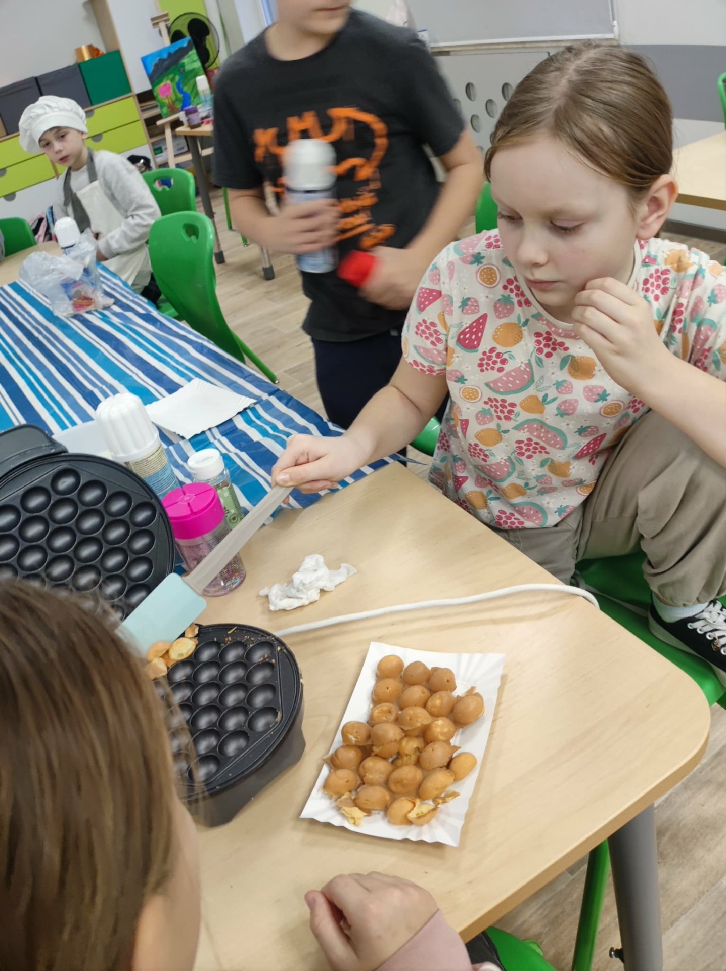 Julka zapisała przepis na tablicy. Ogólnie wyszły chrupiące, złociste gofry, udekorowane według naszych upodobań: owocami, cukrem pudrem, smakowymi posypkami.