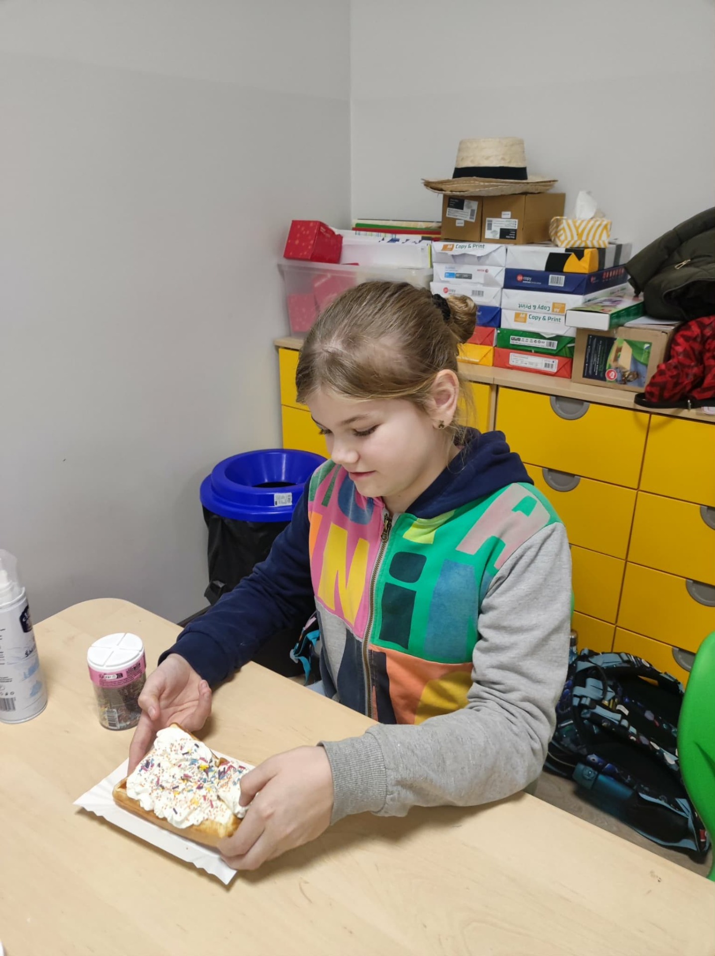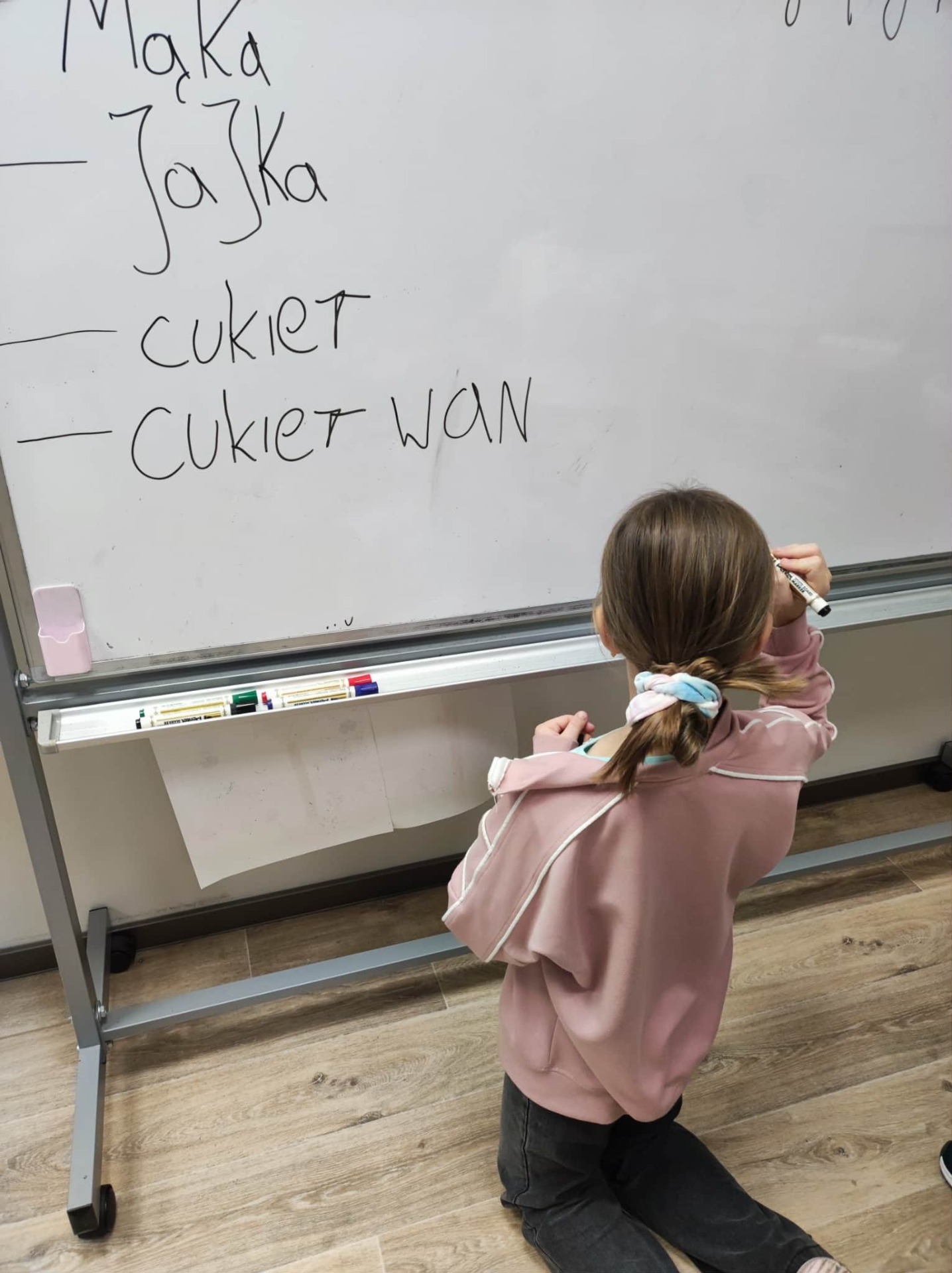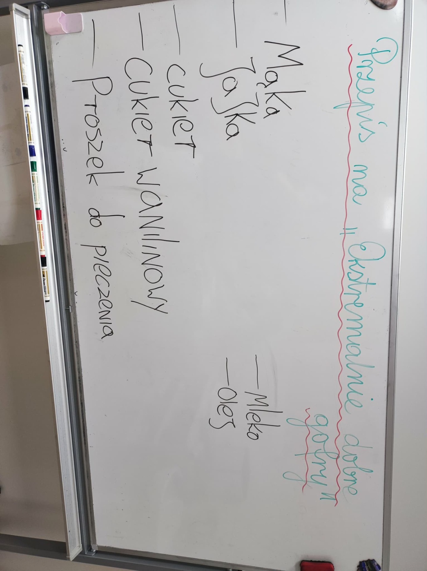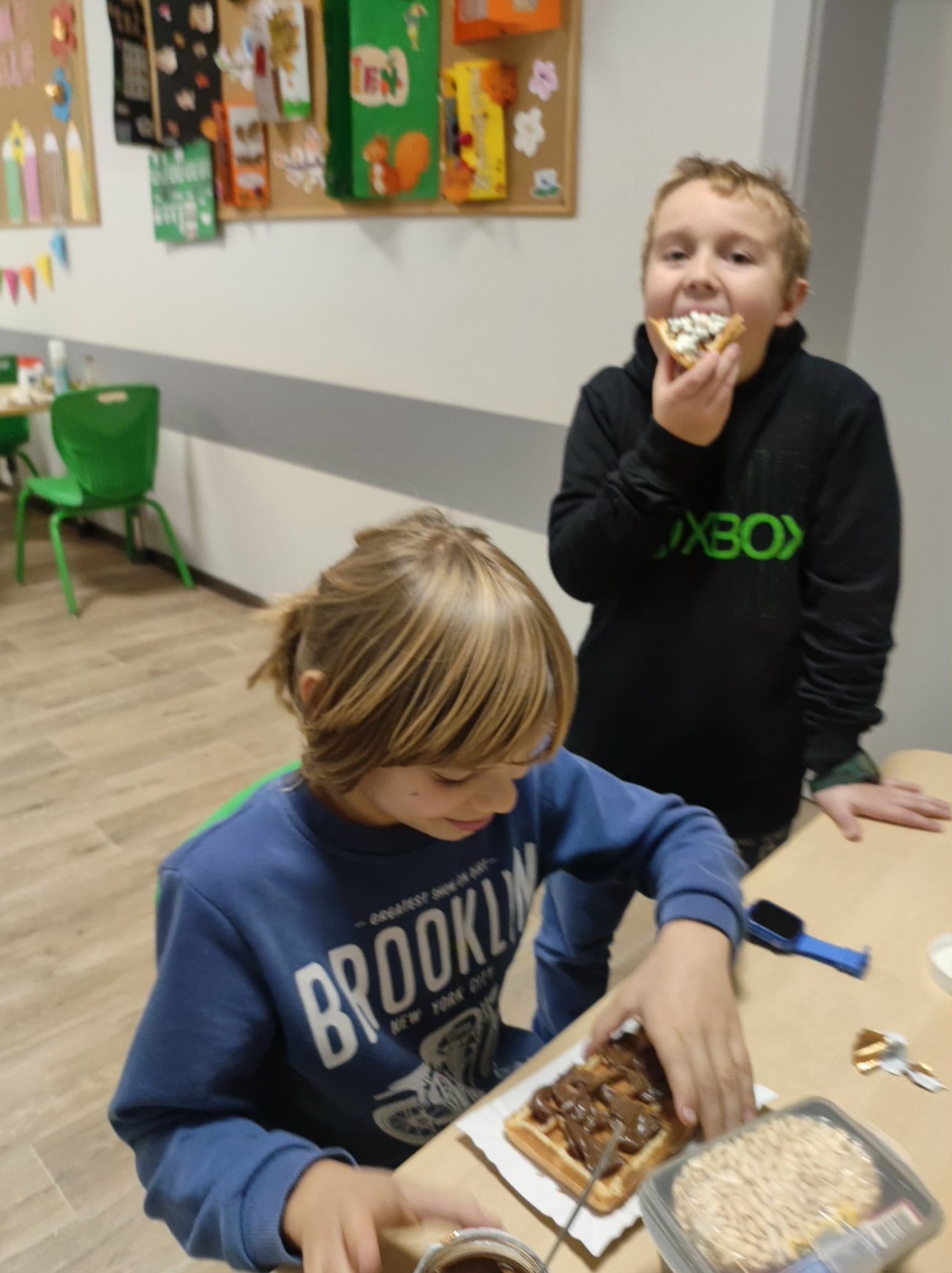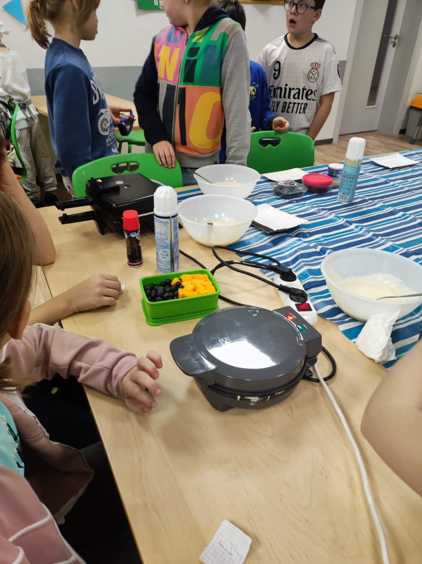 Julka zapisała przepis na tablicy. Ogólnie wyszły chrupiące, złociste gofry, udekorowane według naszych upodobań: owocami, cukrem pudrem, smakowymi posypkami.