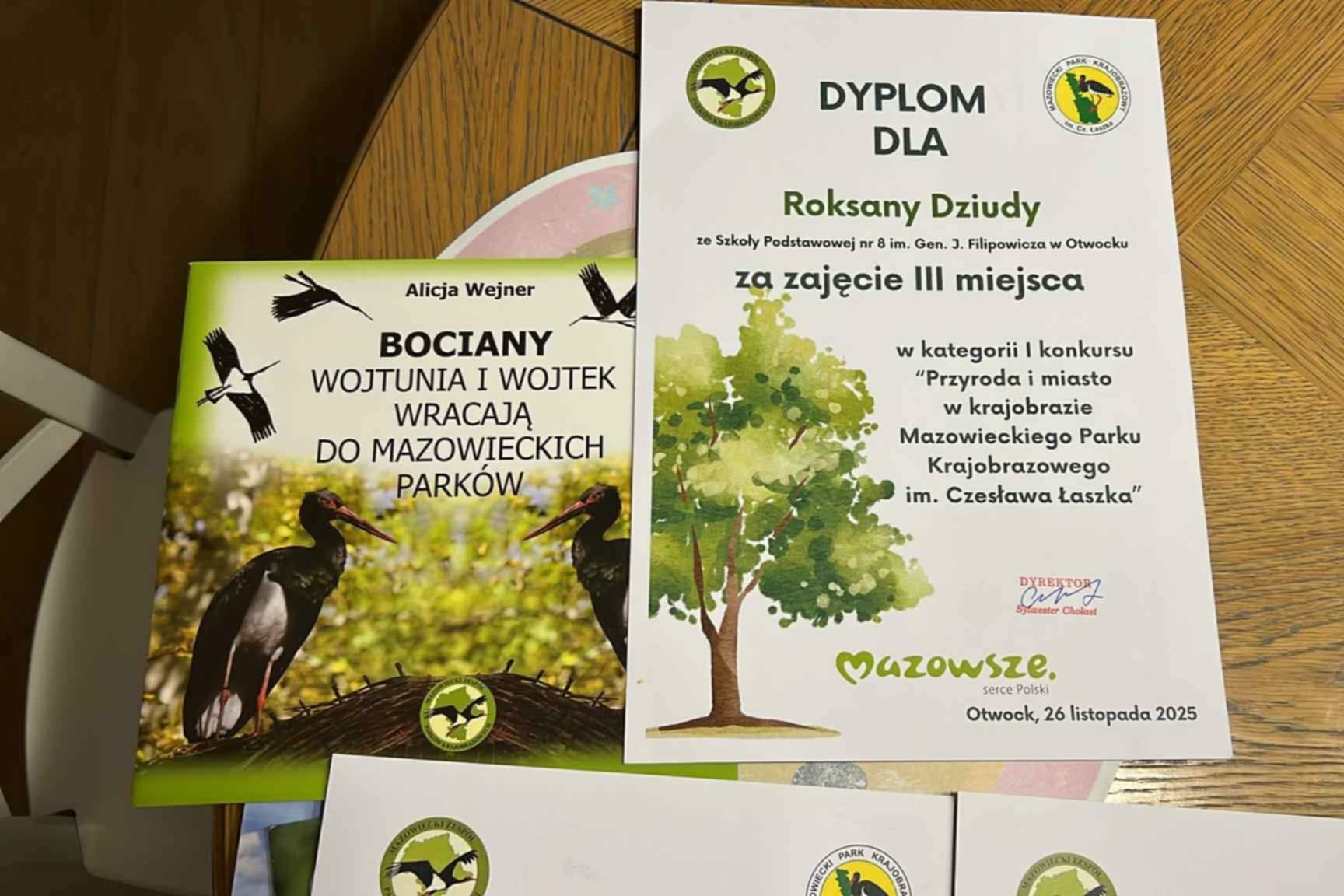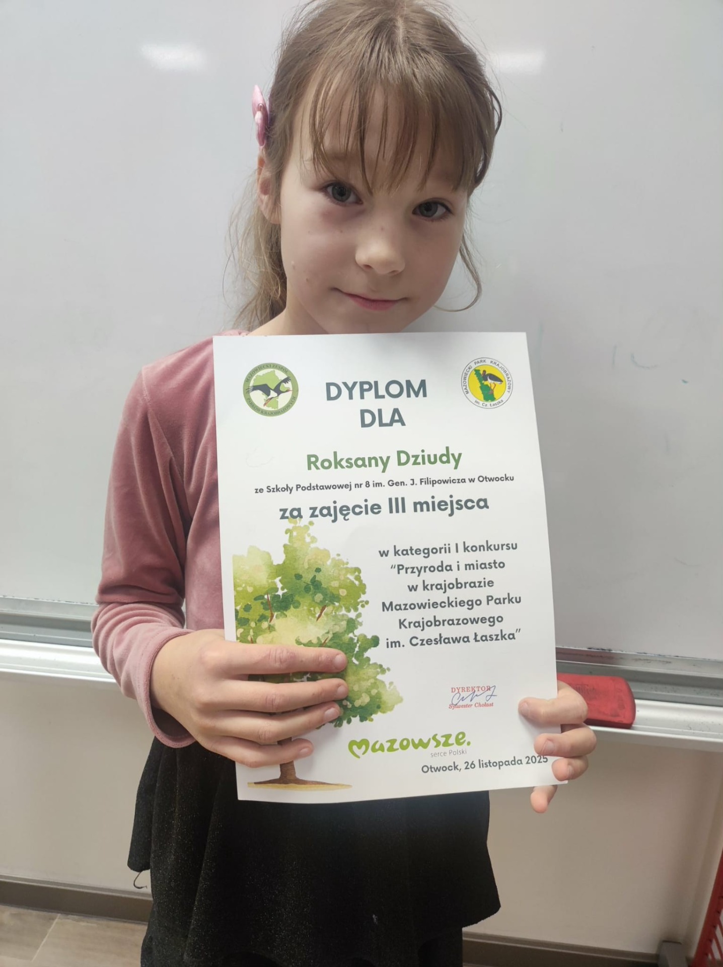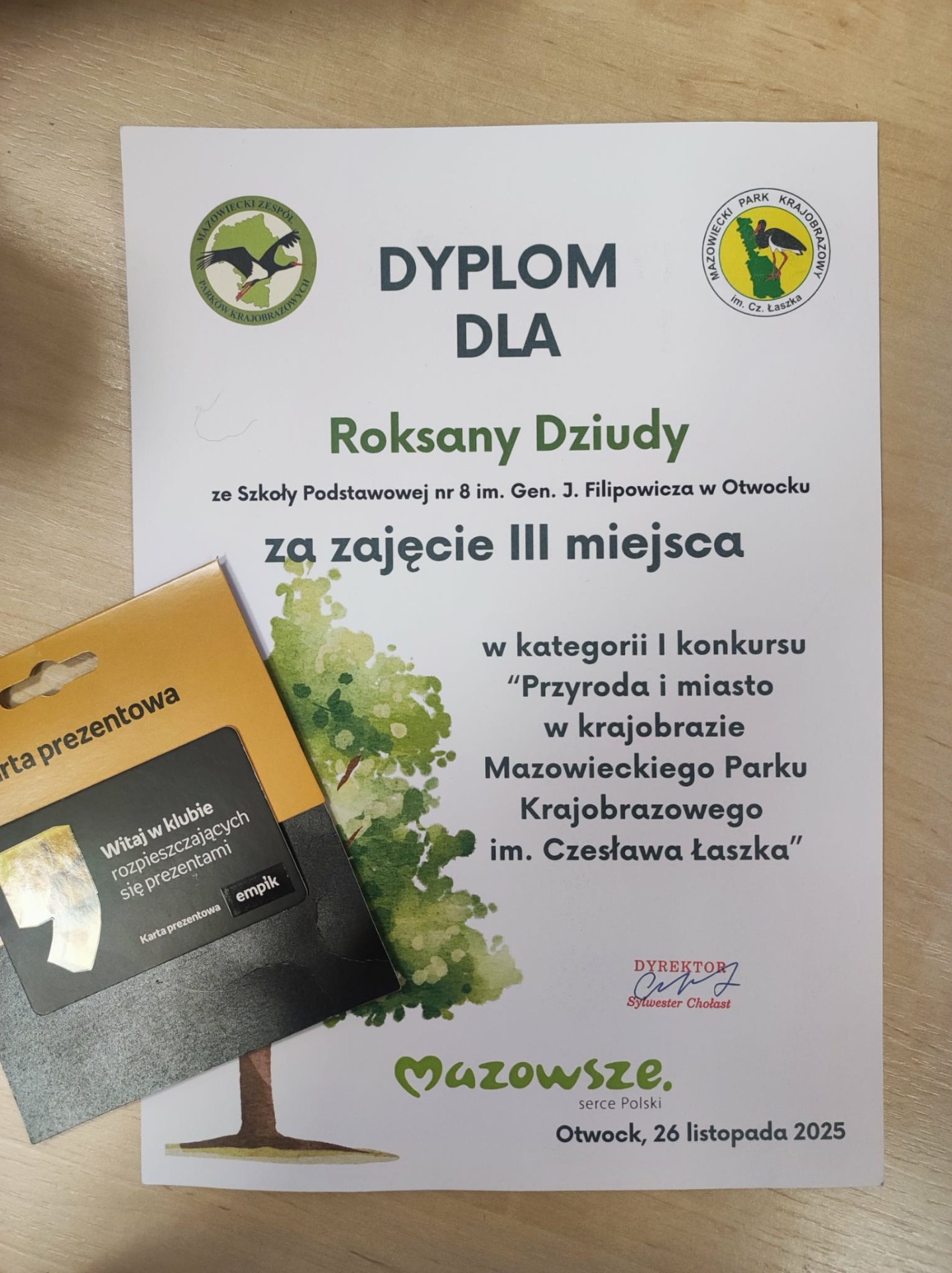 Wielkie brawa dla Roksany Dziudy z klasy 2a za zdobycie III miejsca w powiatowym konkursie plastycznym organizowanym przez Mazowiecki Park Krajobrazowy