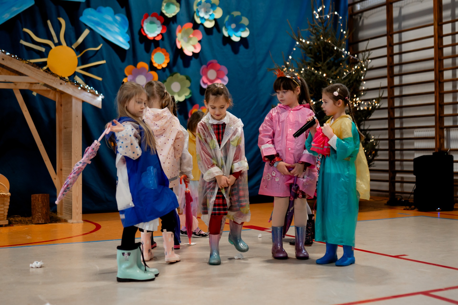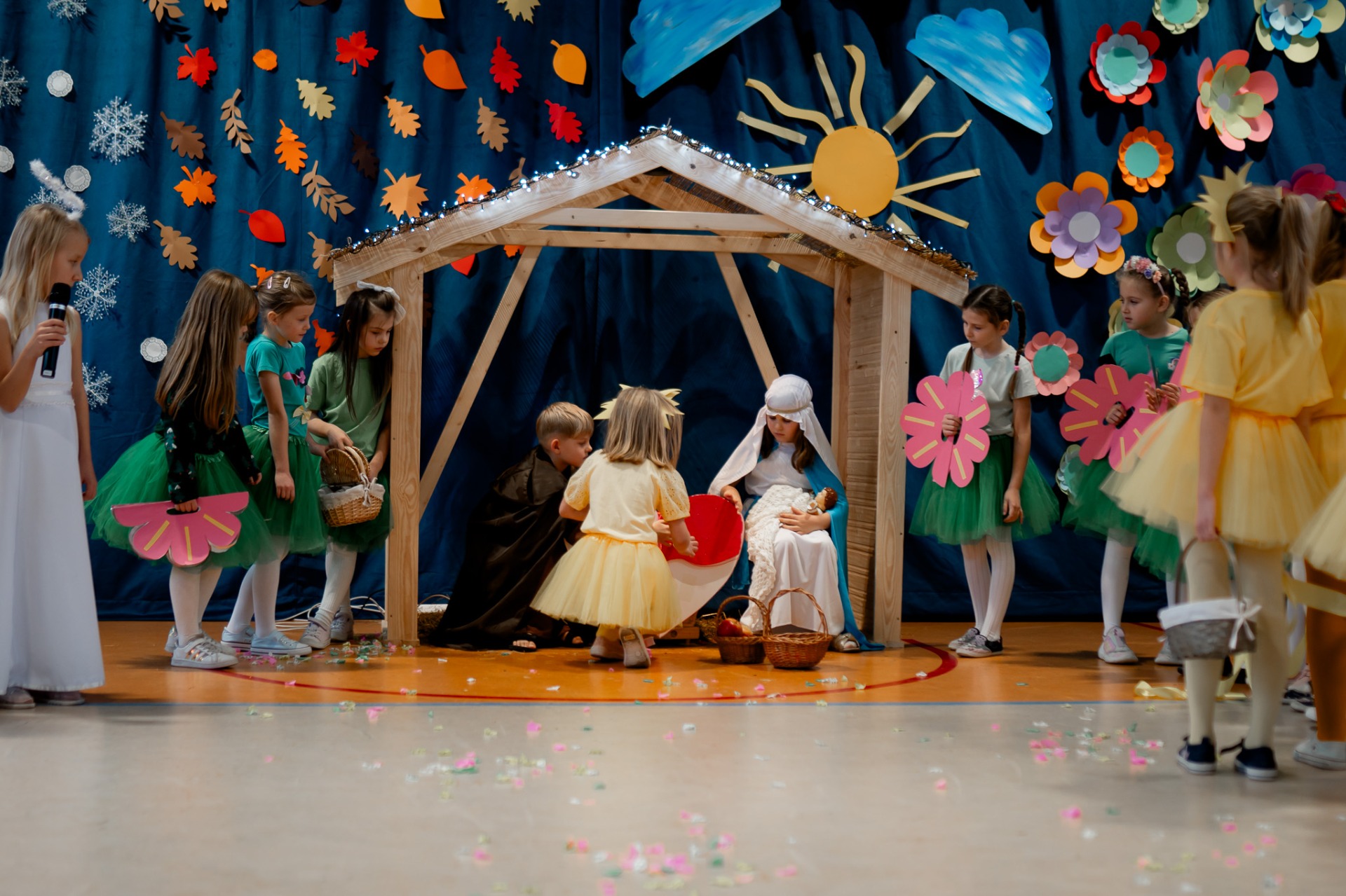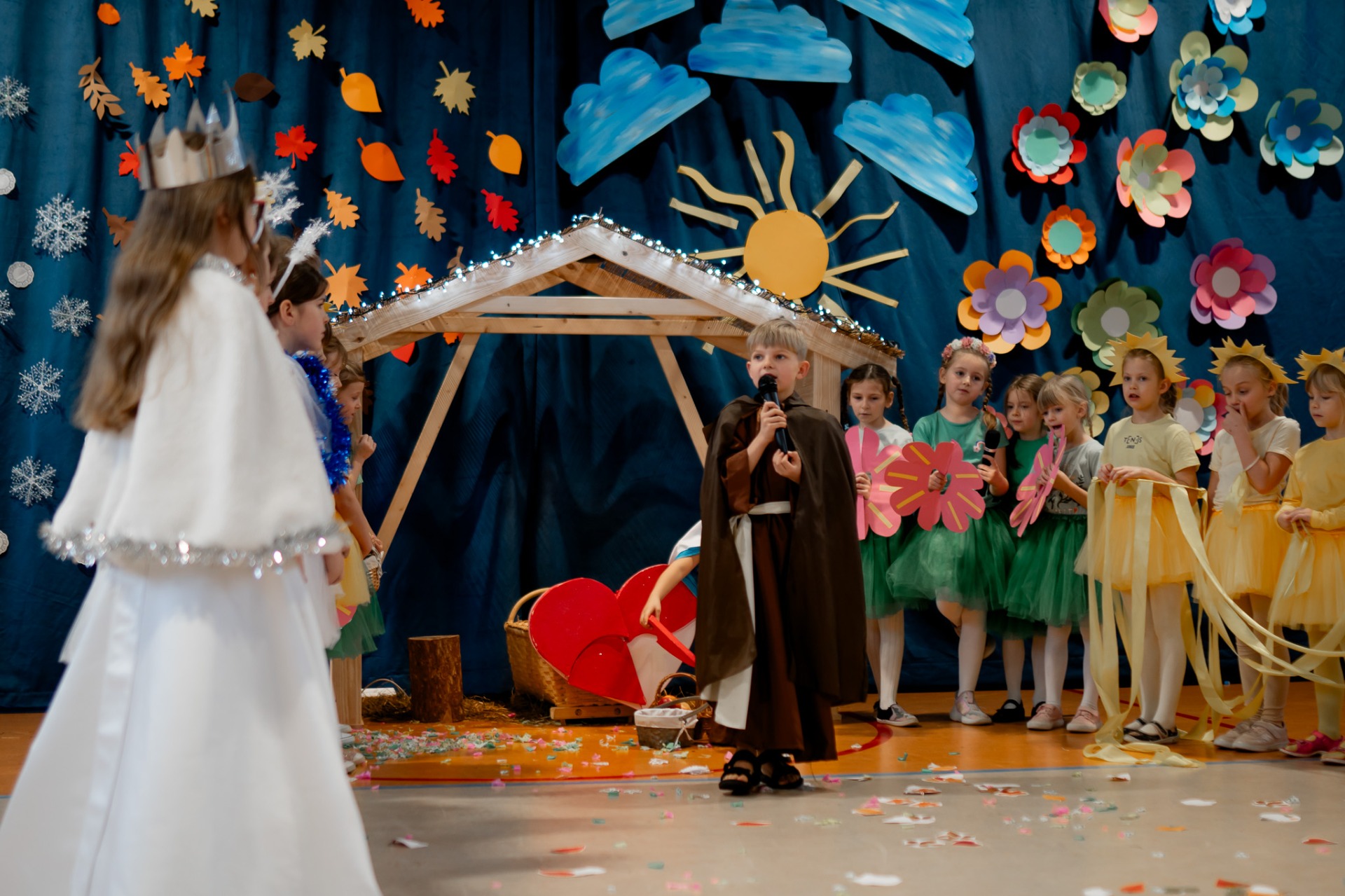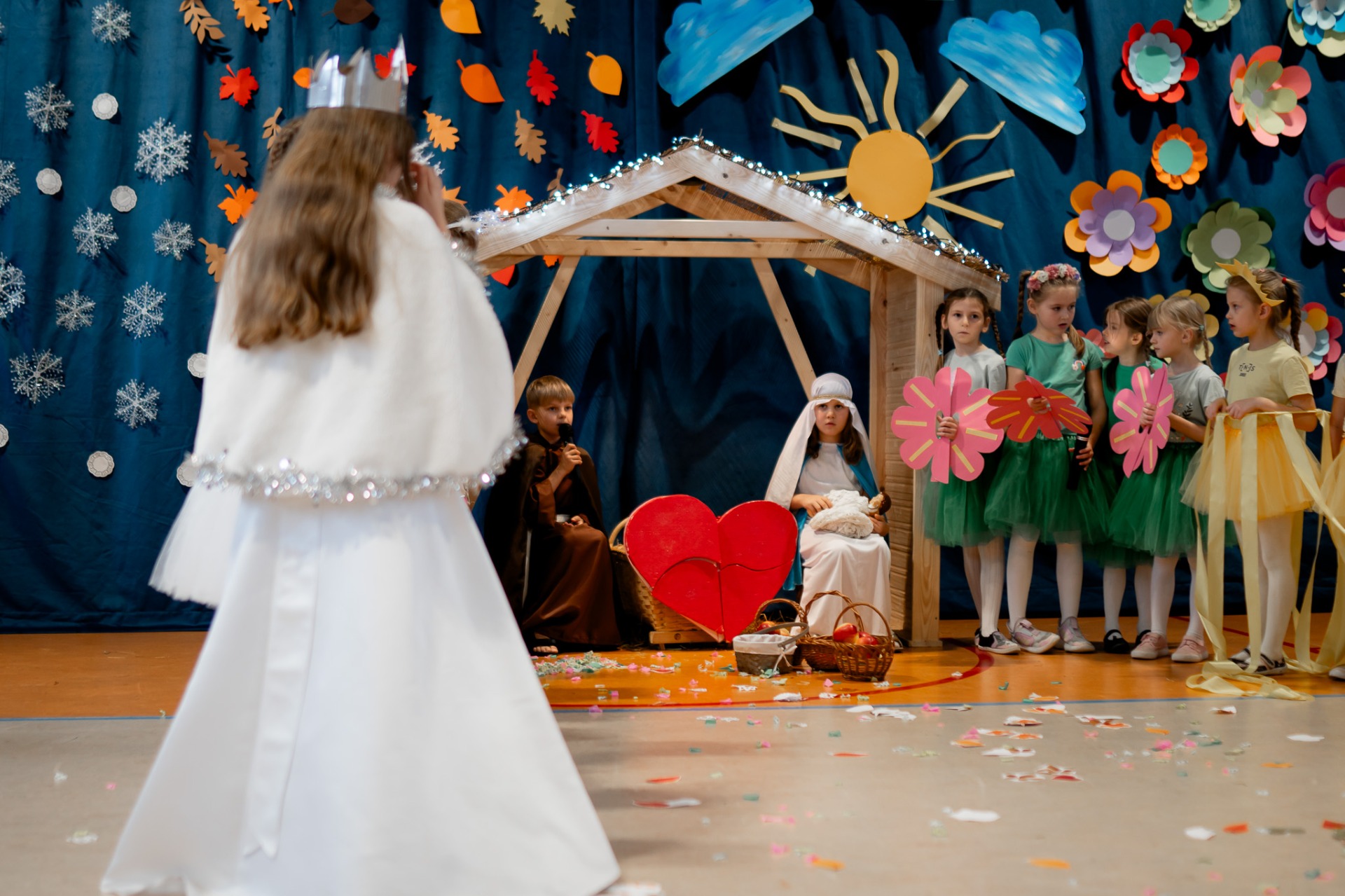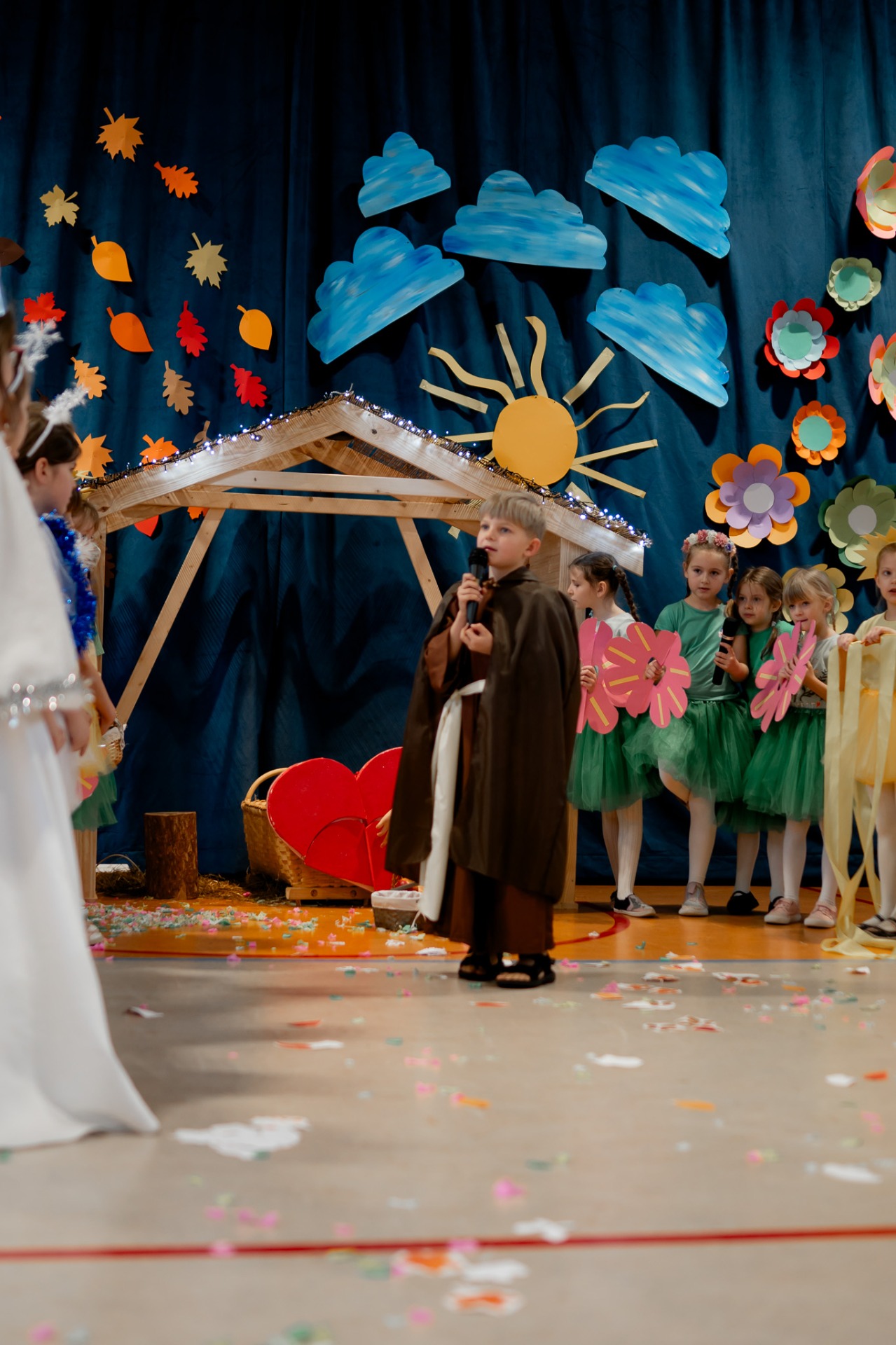 Jasełka, które odbyły się w naszej szkole, były wyjątkowym przeżyciem, pełnym ciepła i refleksji nad tajemnicą narodzenia Jezusa. Ten szczególny czas pozwolił nam na nowo zatrzymać się przy tym, co najważniejsze – nadziei, którą jest Jezus. Przedstawienie prowadziło widzów symbolicznie przez pory roku, ukazując, że Jego obecność towarzyszy nam nieustannie, niezależnie od czasu i okoliczności. Wszystkie dzieci wraz z nauczycielami i pracownikami obsługi wykazali ogromne zaangażowanie w przygotowanie występu. Przedstawienie było bardzo dynamiczne pod względem choreograficznym, kolorowe dzięki scenografii zmieniających się pór roku, obfitowało w piękne słowa i muzykę. Dziękujemy za Waszą pracę i serca włożone w stworzenie tego pięknego, poruszającego świadectwa wiary i wspólnoty.