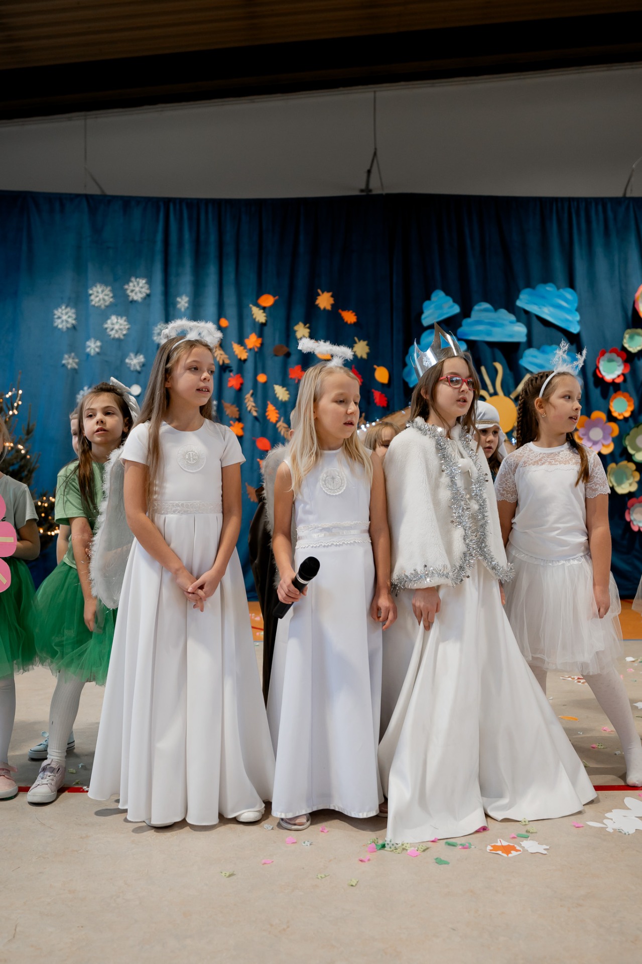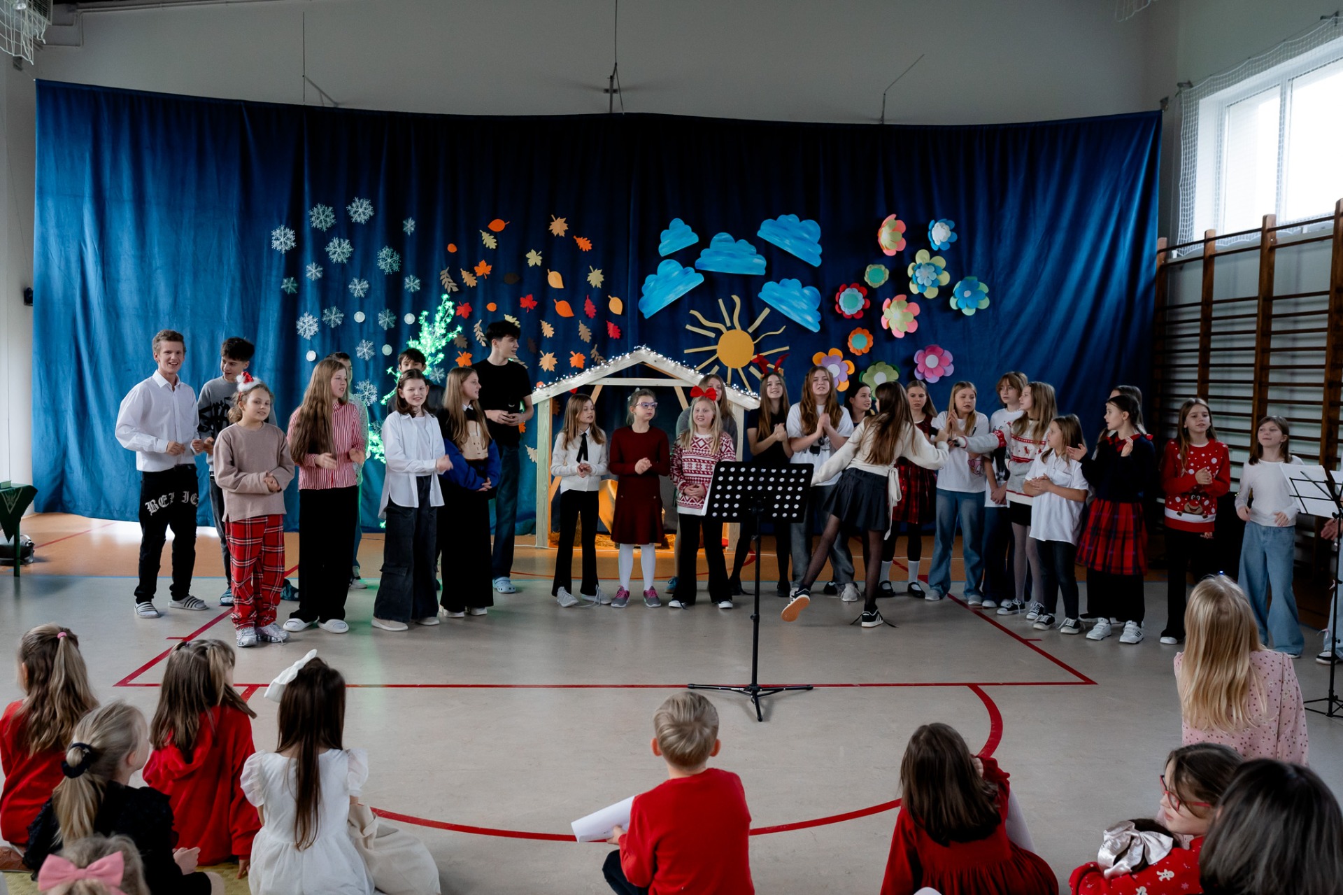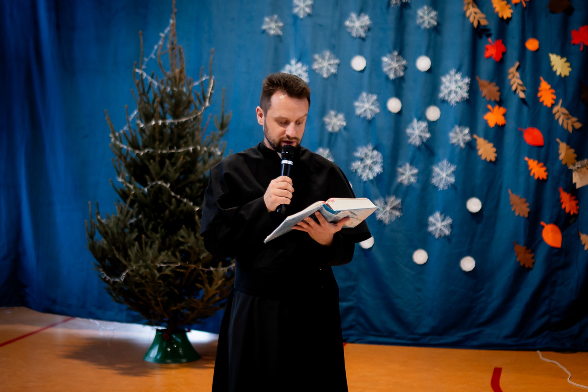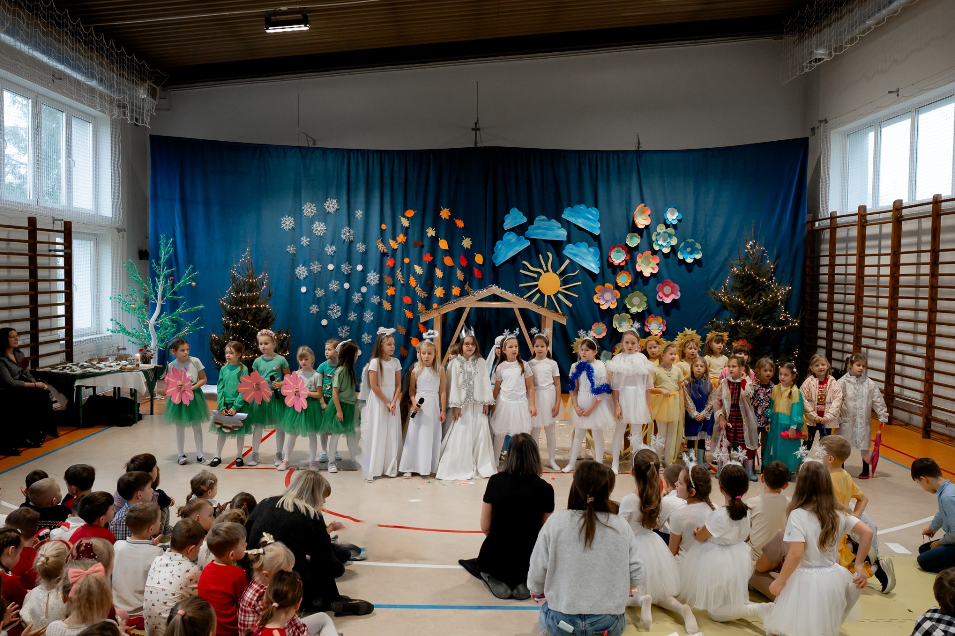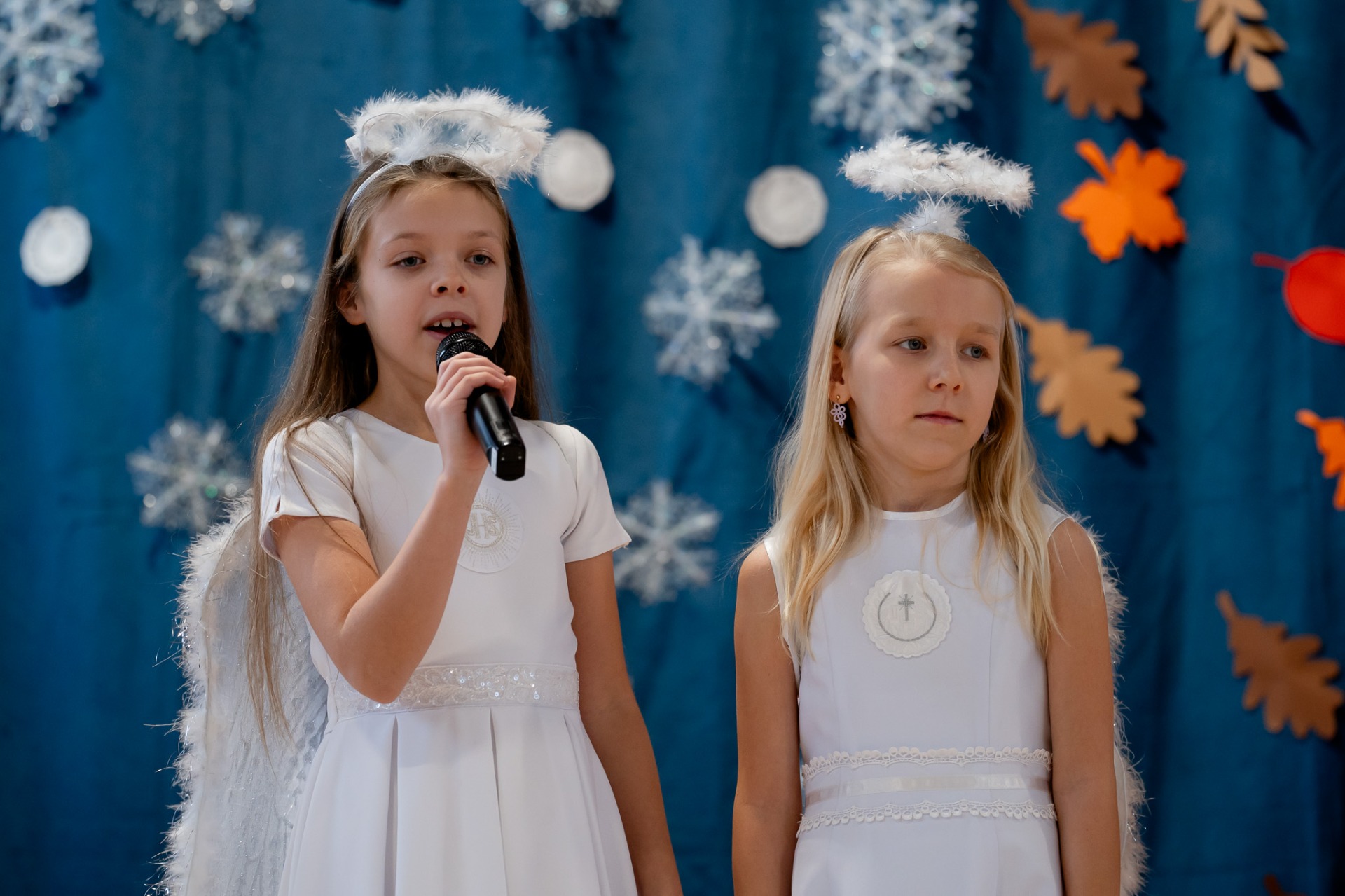 Rano każda klasa przygotowała swoją salę na spotkanie wigilijne, po czym wszyscy udali się na salę gimnastyczną, gdzie dzieci klas – drugiej, pierwszych i przedszkolnej grupy „Pszczółek” wystawiły Jasełka pt. „Cztery pory roku”. Występy zostały poprzedzone odczytaniem fragmentu Pisma Świętego o Narodzeniu Pana Jezusa, który odczytał ks. Michał Owczarz.