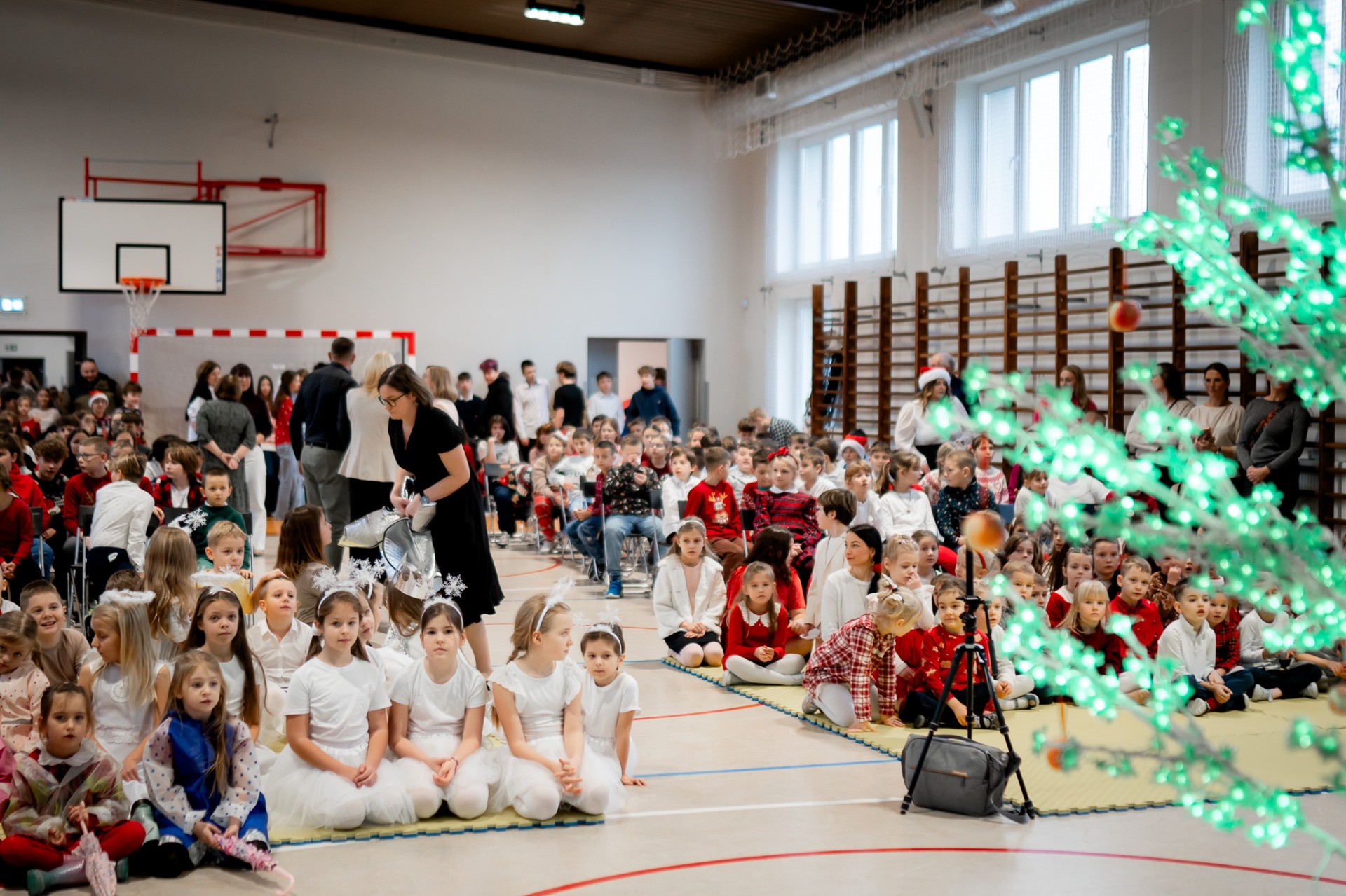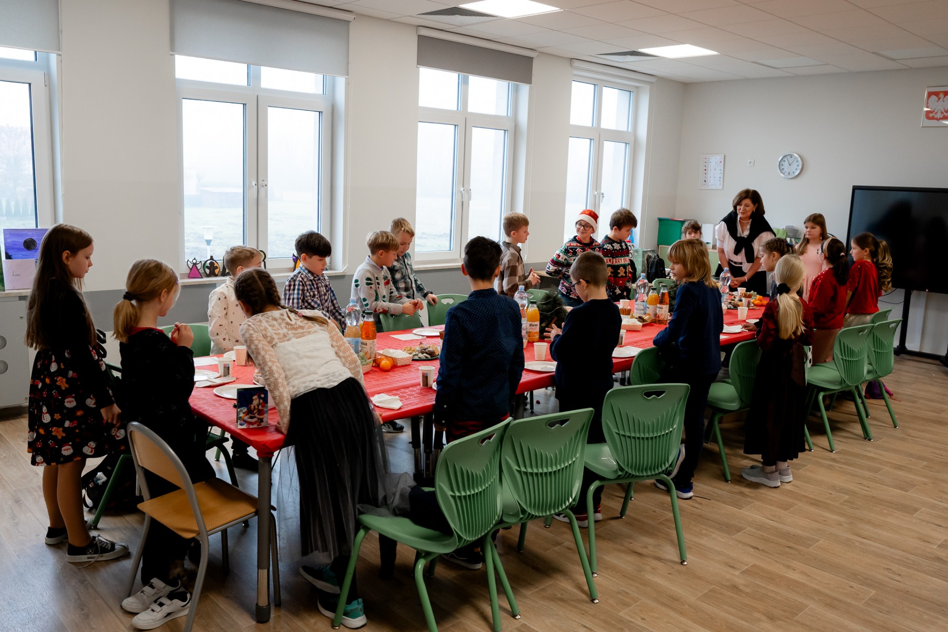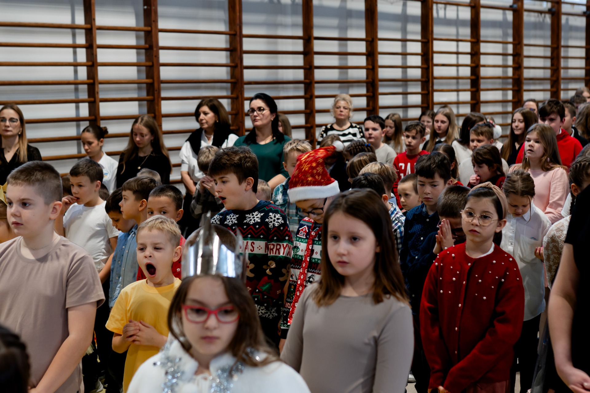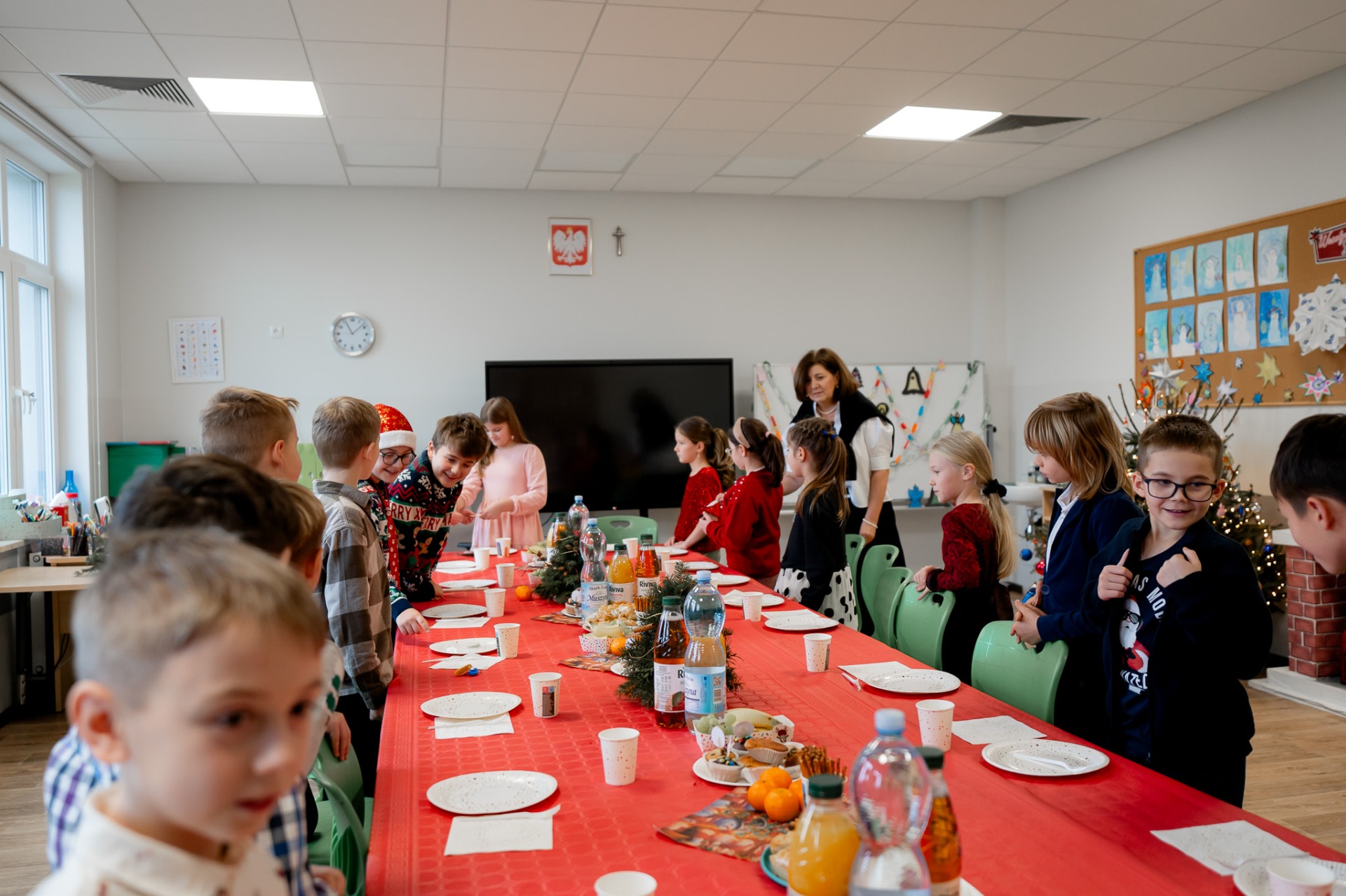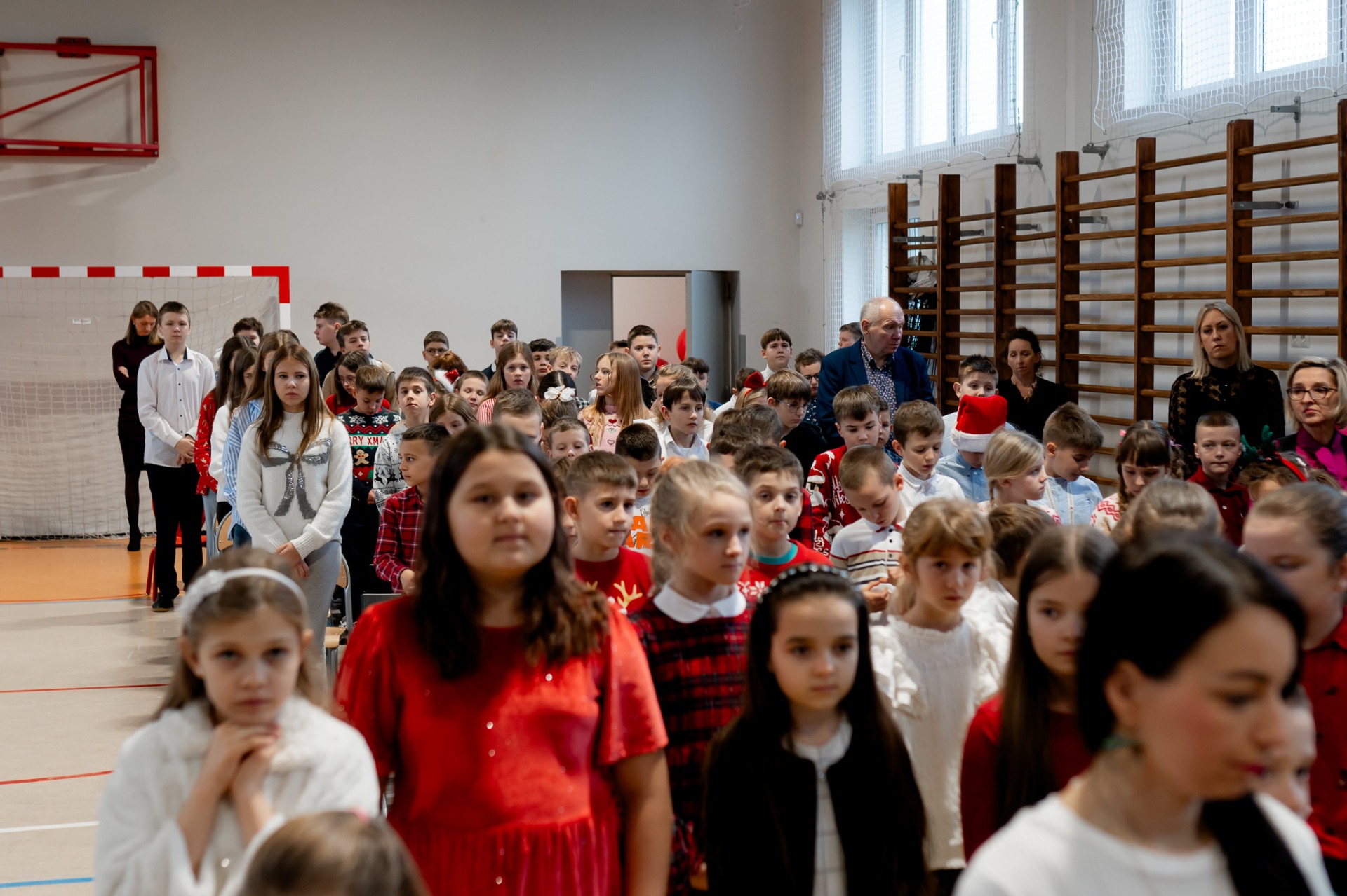 Rano każda klasa przygotowała swoją salę na spotkanie wigilijne, po czym wszyscy udali się na salę gimnastyczną, gdzie dzieci klas – drugiej, pierwszych i przedszkolnej grupy „Pszczółek” wystawiły Jasełka pt. „Cztery pory roku”. Występy zostały poprzedzone odczytaniem fragmentu Pisma Świętego o Narodzeniu Pana Jezusa, który odczytał ks. Michał Owczarz.