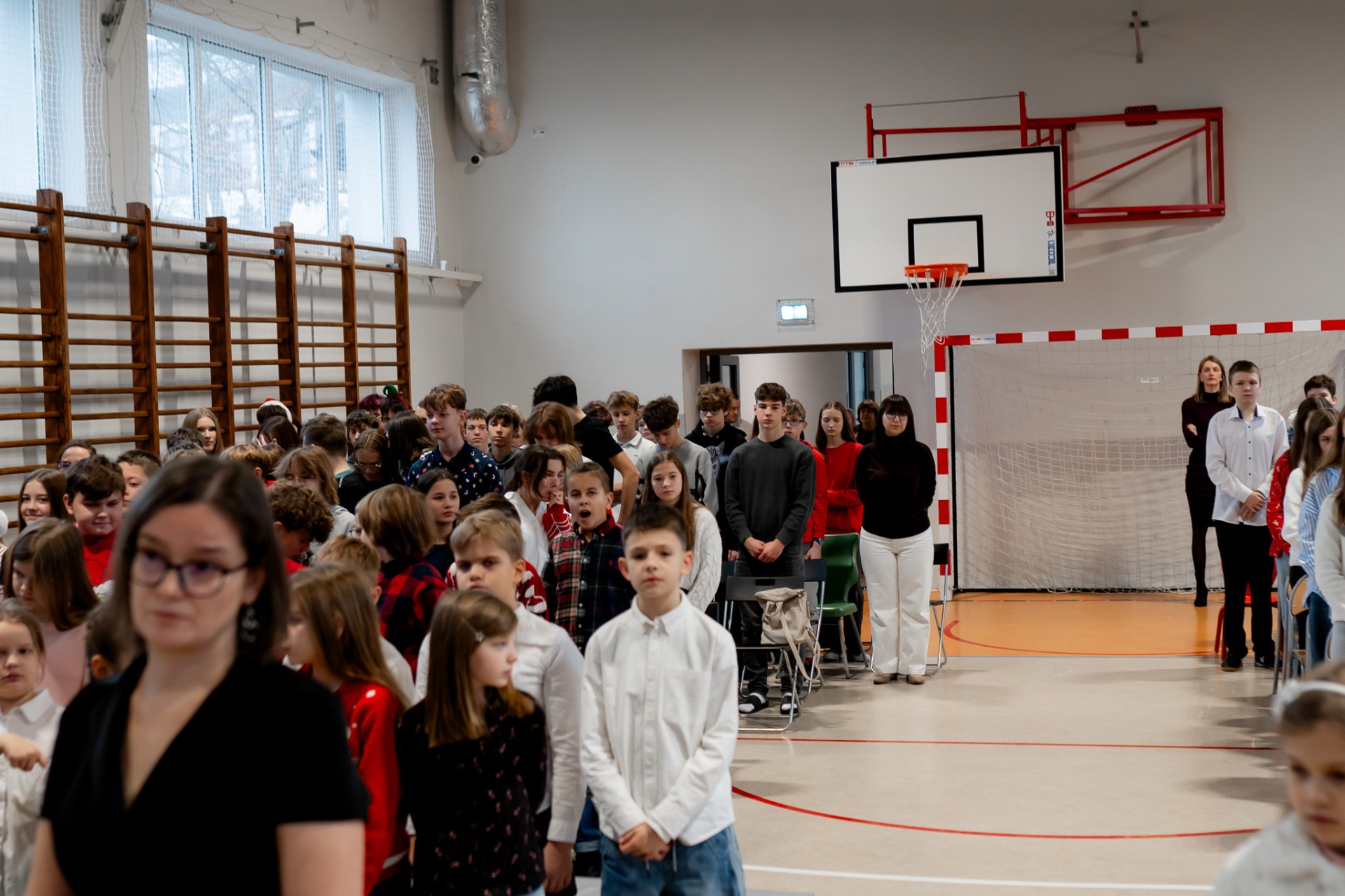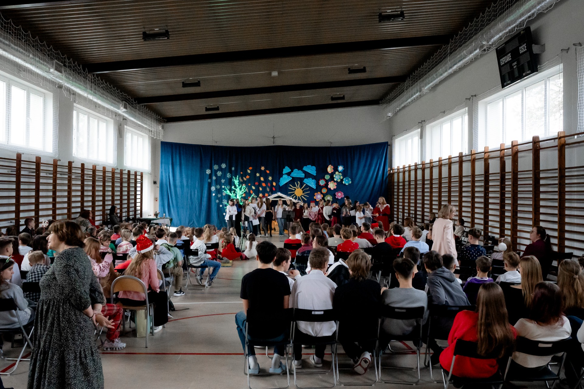 Na koniec szkolnego świątecznego dnia zebraliśmy się ponownie w sali gimnastycznej, aby wspólnie pokolędować wraz z zespołem pod kierunkiem pani Agnieszki Świstak. Dziękujemy Wam za wprowadzenie w ten radosny czas świętowania Bożego Narodzenia.